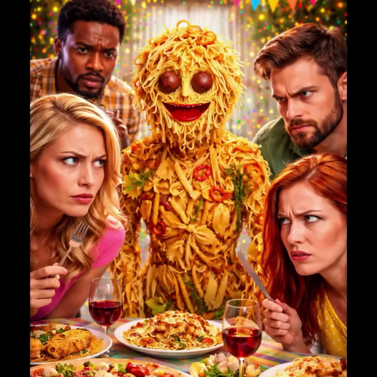 Hyper-bright pasta pop with disco undertones at 128 BPM, Instrumentation includes bouncy synth bass, four-on-the-floor drums, handclaps, glockenspiel, pizzicato strings, and layered chant-style backing vocals, Mood should be absurdly cheerful and colorful, contrasting comedically with the paranoia of the lyrics, Vocal approach is animated, theatrical, and over-smiling, with stacked harmonies in choruses and exaggerated phrasing for punchlines, Production should feel glossy and polished with crisp high-end sparkle, tight low-end control, and wide stereo imaging for maximum candy-coated impact, Master with punchy compression and bright EQ sheen