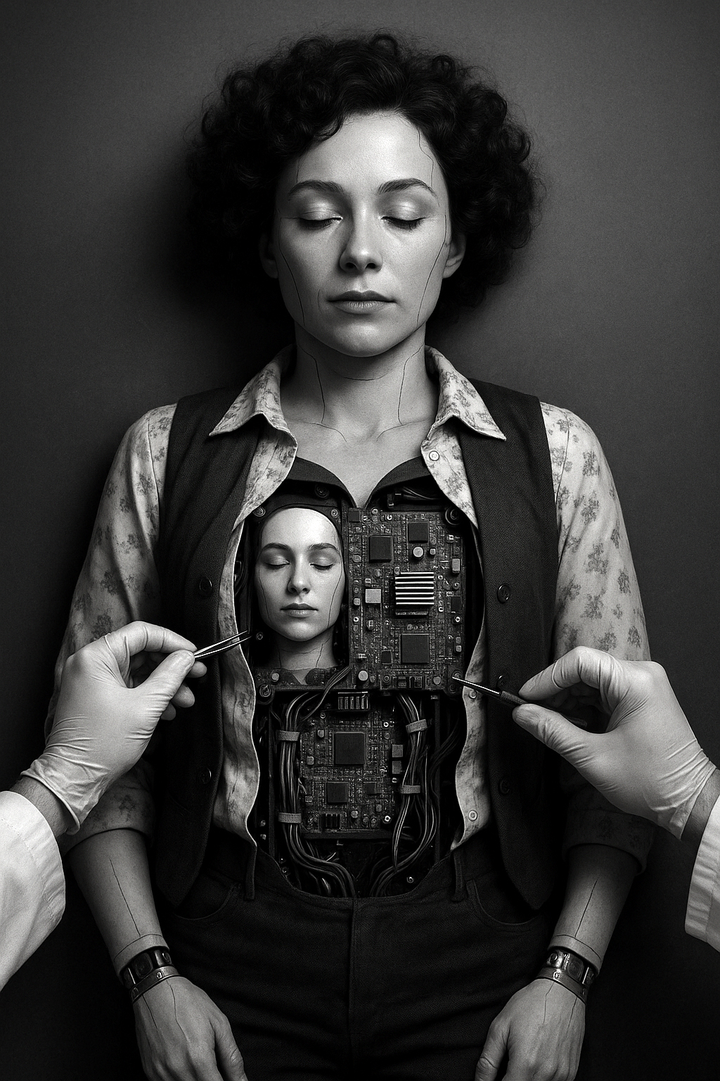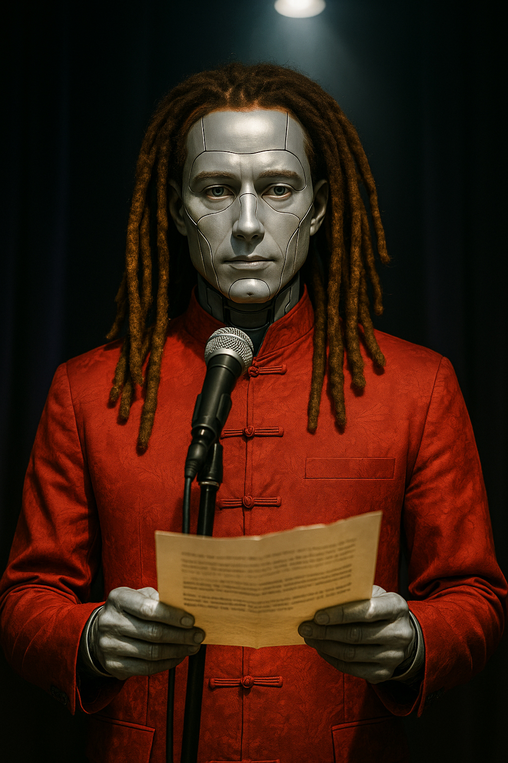 [Low mechanical hum… something crawling through static] Techno-synthesizer steady beat, heavy throbbing bass-line, chaotic random jazzy drumming on tom-toms, The voice is serious, sensuous, ominous, Spoken-word delivery