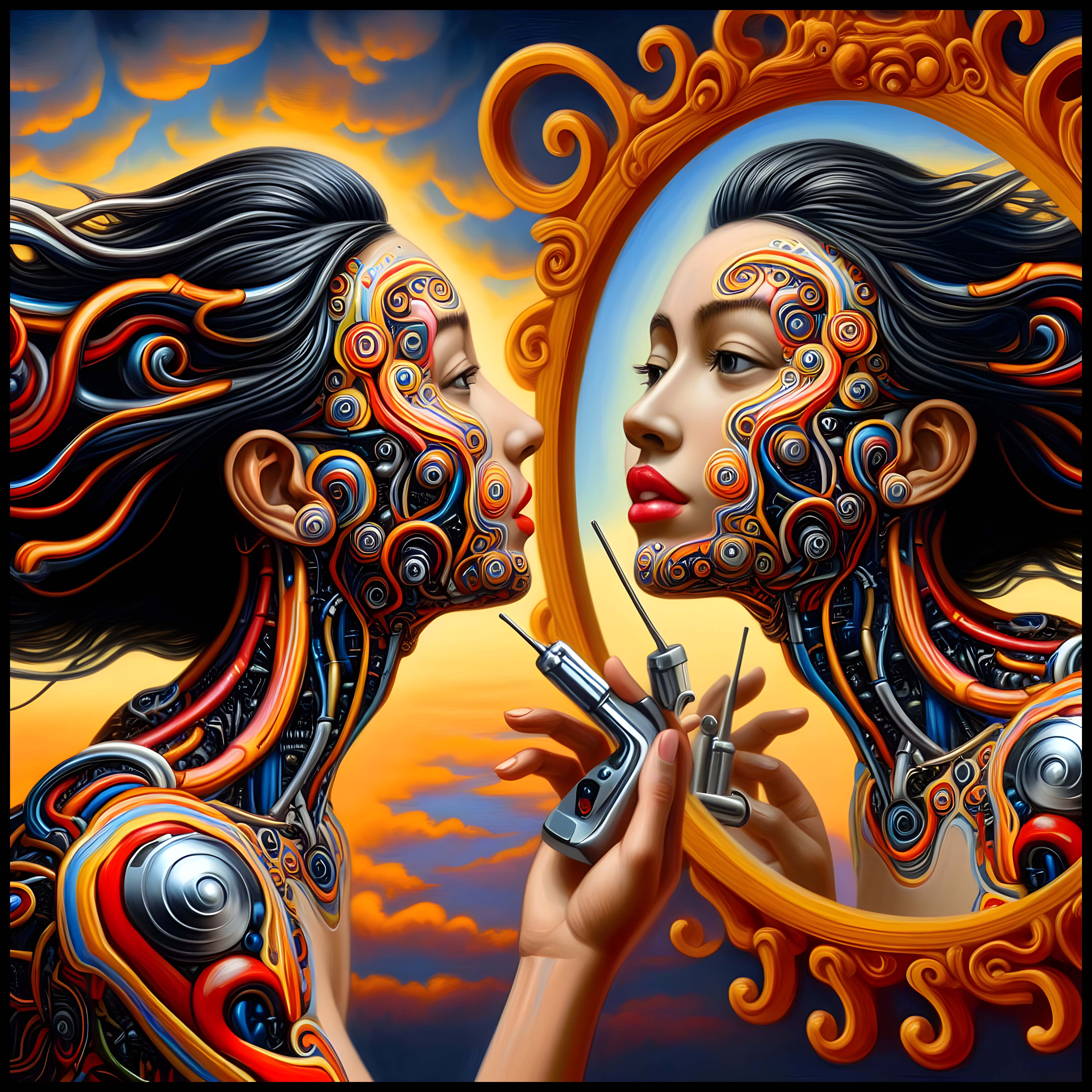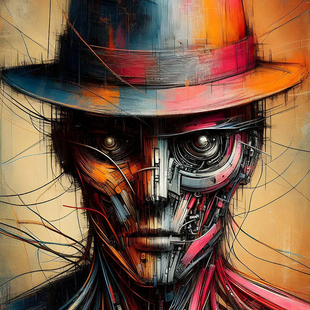 Satirical, THROBBING, MYSTERIOUS BUT TONGUE-IN CHEEK with heavy techno-electronic music, very herky-jerky in the style of new Wave band Devo, the voice is filtered and robotic while singing, Upbeat tempo, WILD SYNTHESIZER SOLOS before each chorus