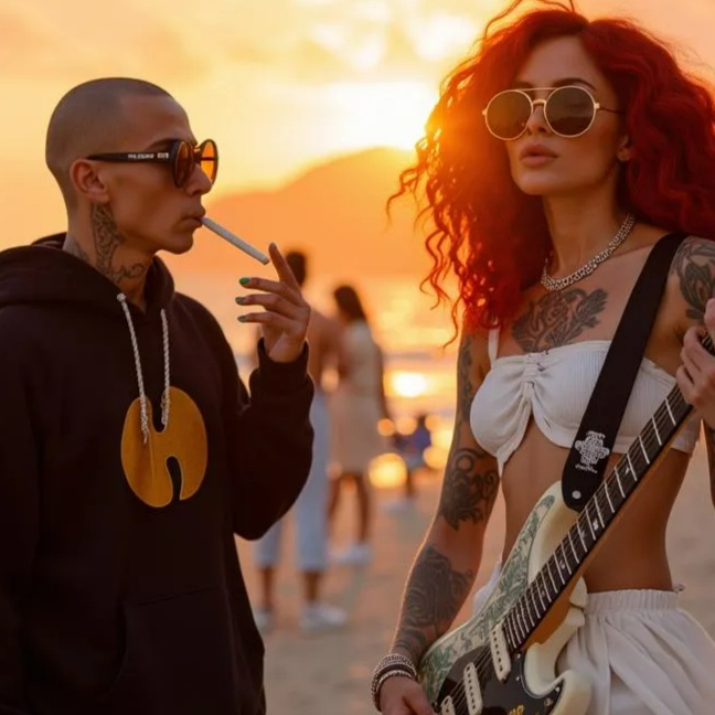 Rap Pop, batucada, Miami vibes, uplifting, smooth, pop catchy, Feel-Good, Funk-tinged, Lush Beats, male rapper, female melodies, Laid-back, Chill, Percussive, Feel-good, Playful, Catchy
