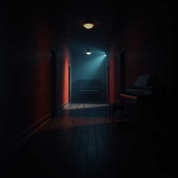 Cinematic horror score, very slow tempo, creeping strings and distant piano hits, Sub-bass swells and low drones underneath, with sparse metallic percussion and reversed textures that bloom and vanish, Long, hanging reverbs create a suffocating space; dynamics rise from near-silence to sudden stabs, then sink back into uneasy stillness, deep, slow