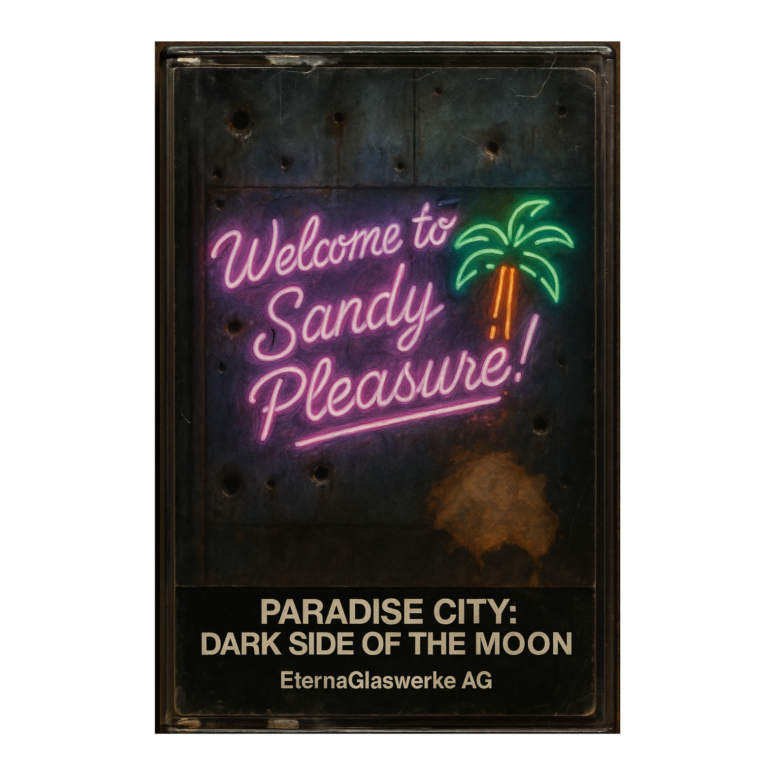 Old-school West Coast lowrider bounce with modern polish, ~92 BPM, swung hi-hats, rubbery sub-bass, tight 808-style kick + crisp clap on 2/4, Funky clean guitar stabs and occasional talkbox doubling on the words “Sandy Pleasures / measure your leisure, ” Add a tiny shop bell “ding” one-shot to punctuate chorus lines, Verse groove stays minimal and head-noddy; leave space for the narrative
