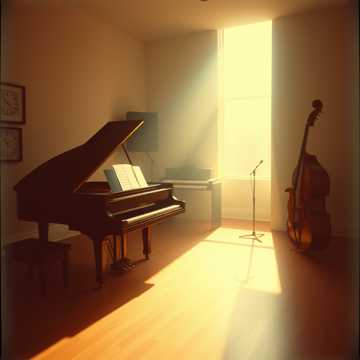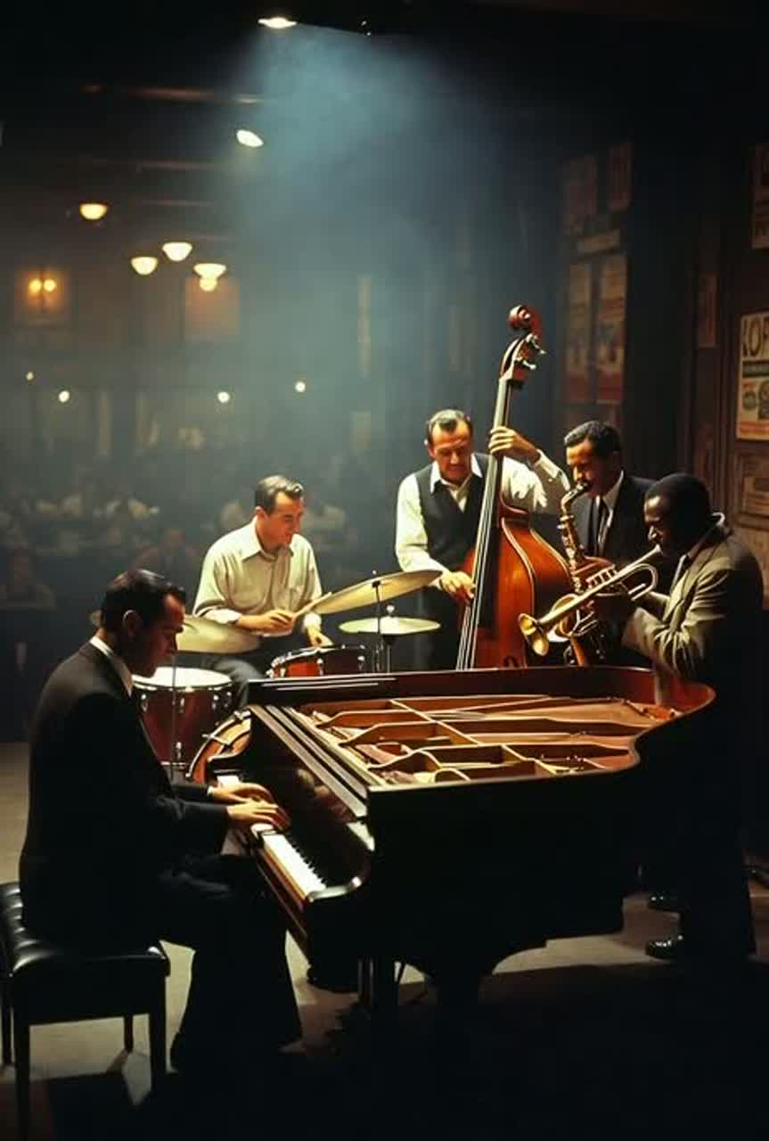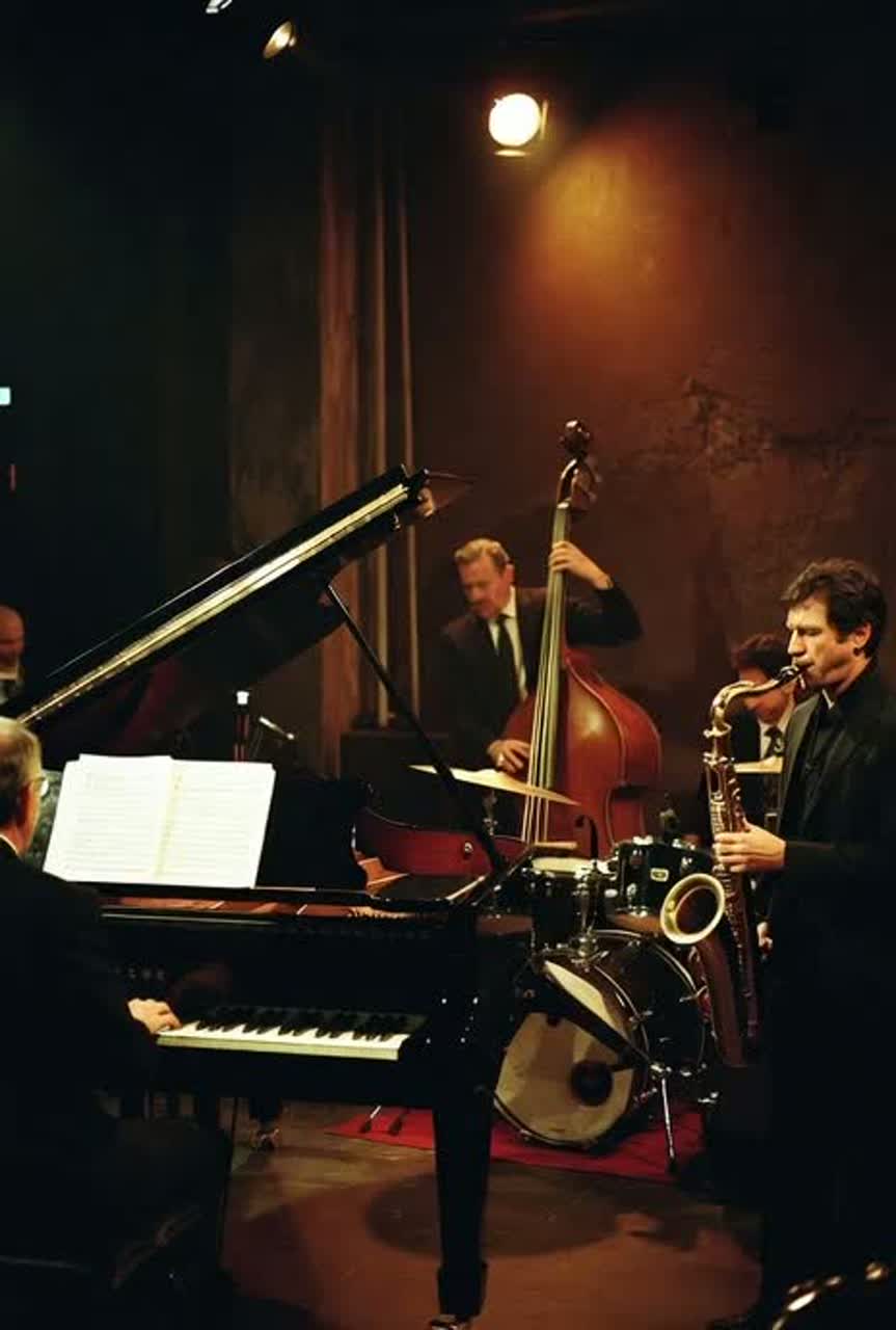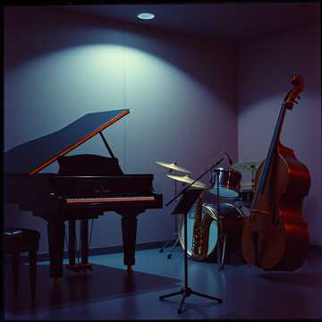 jazz, cool jazz, steinway & sons model d concert grand, alto saxophone sba, upright double bass, 4-piece drum drum kit with zildjian cymbals, professional studio session, jazz improvisation, polytonality, polyrhythms, unconventional time signatures like 5/4 and 9/8, live studio recording, saxophone