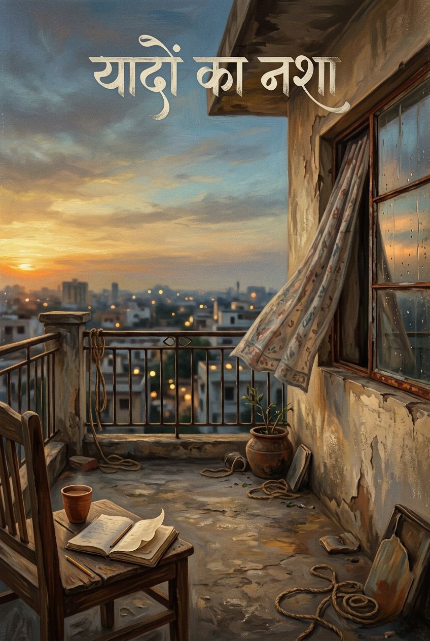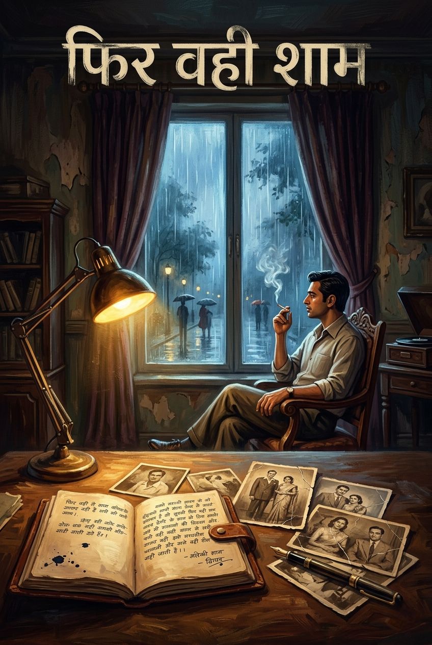A melancholic vintage Hindi ghazal-inspired song with a slow tempo around 60–70 BPM, Mood deeply nostalgic, lonely, and emotionally rich, evoking the feeling of an old evening filled with memories of lost love, Male vocals should sound soulful, mature, and expressive with soft vibrato, reminiscent of classic 1960s–70s Hindi film songs, Instrumentation should include gentle piano, soft violins, subtle tabla, brushed drums, acoustic guitar, and occasional flute phrases, Add delicate string swells between verses and a mournful instrumental interlude led by violin and flute, Production should feel warm, analog, intimate, and cinematic, like an old black-and-white Bollywood heartbreak scene, Spacious reverb, soft echoes, and emotional pauses between lines, Overall vibe: lonely evening, fading memories, unspoken love, timeless sadness