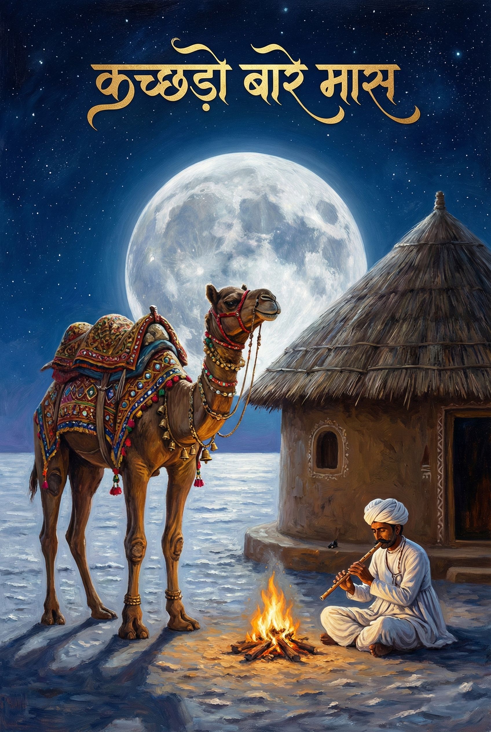 A high-energy yet earthy Indian folk song inspired by the Kutch region of Gujarat, sung in Kutchi dialect, The mood is proud, celebratory, and deeply rooted in desert culture, Begins with a twangy morchang (jaw harp) motif, joined by dholak grooves and a soulful Kafi-style flute, Rhythmic clapping drives the chorus, creating a festive community feel, Tempo is medium-fast with hypnotic folk rhythms, evoking white salt deserts, monsoon winds, camel caravans, and village pride, Male folk vocals with raw texture and regional ornamentation, Call-and-response style chorus that feels like a traditional lok-geet, Acoustic, organic, rustic soundscape with camel bells in the outro, Emotion: cultural pride, nostalgia, joy, and resilience, No modern pop gloss—authentic, rootsy, desert folk celebration suitable for festivals and travel visuals