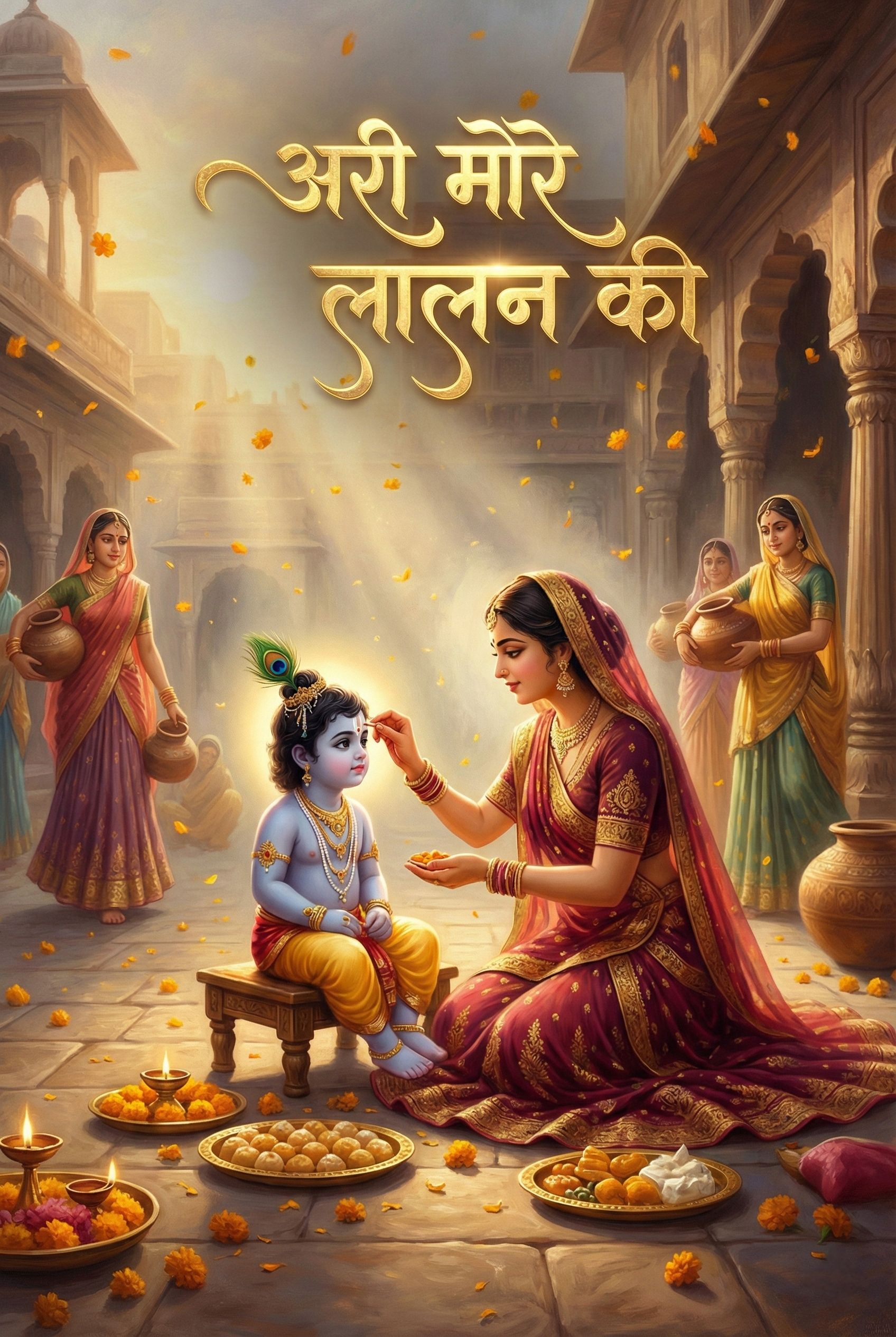 Semi-classical Indian devotional, Haveli Sangeet style, soulful female vocals, Flute (Bansuri) and Pakhawaj or Tabla, warm acoustic tanpura background, 80 BPM, celebratory and maternal atmosphere