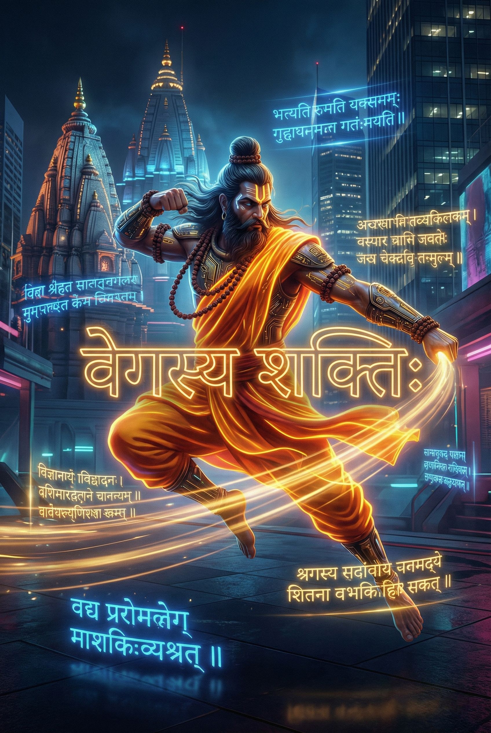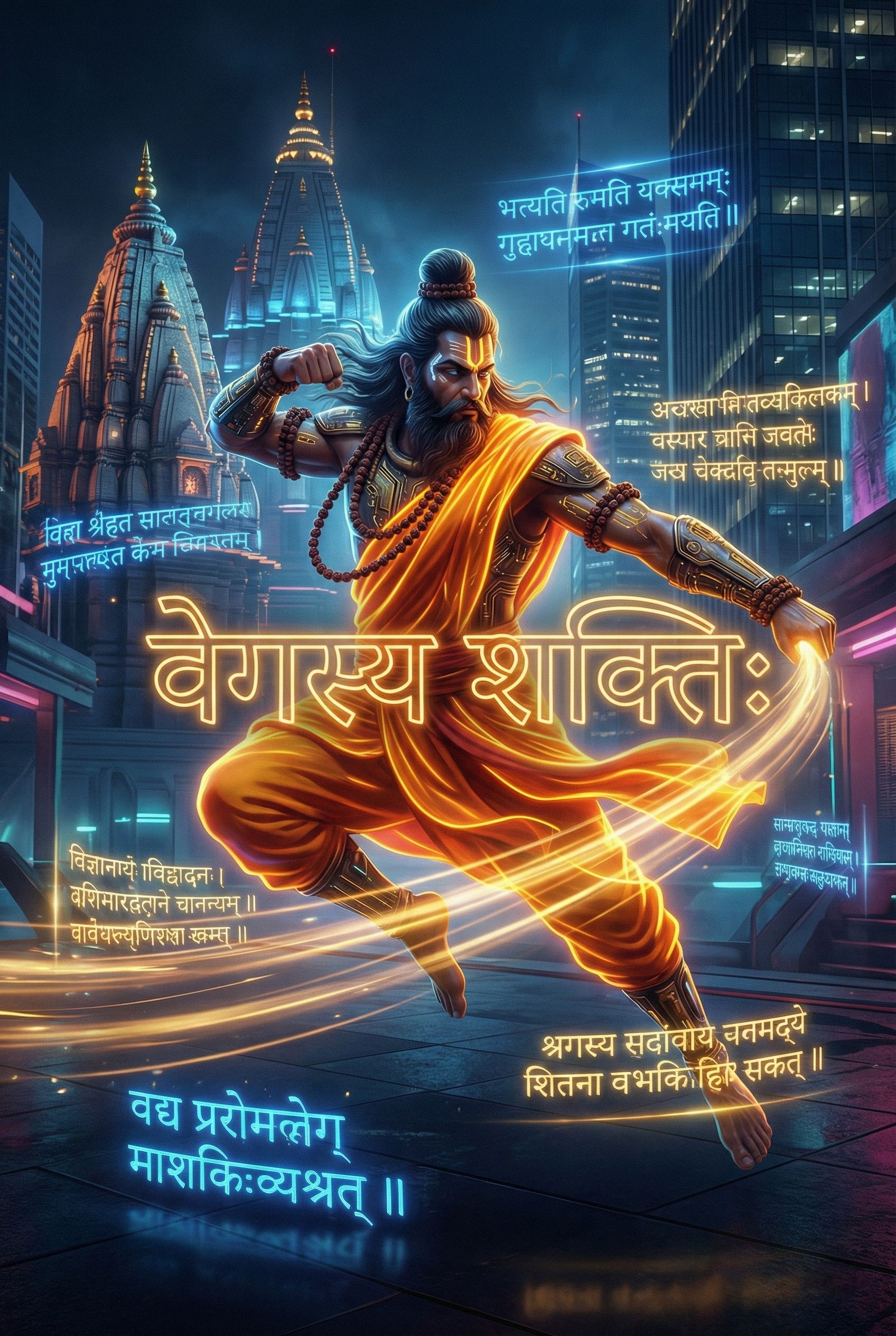 Fast Sanskrit Rap, Hardcore Indian Trap, Aggressive Male Vocals, Heavy Bass, rapid fire delivery, traditional instruments mixed with modern synth, Tabla and Shankh, rhythmic and intense, 140 BPM