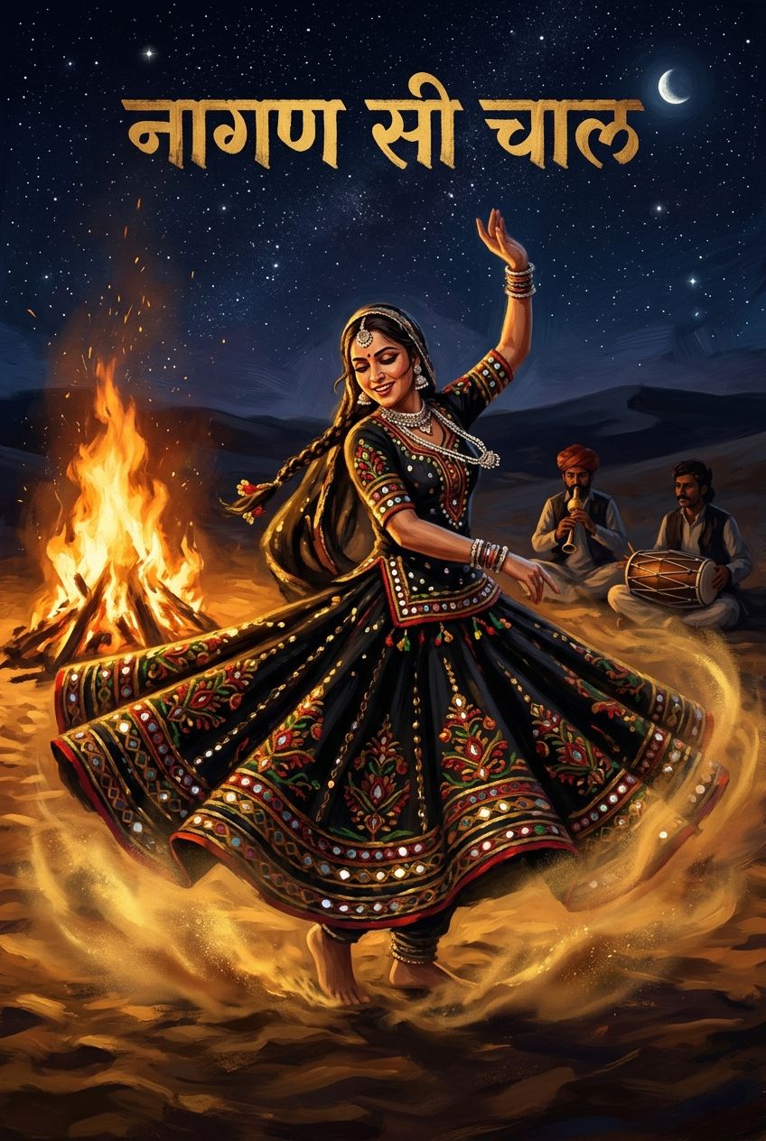 Authentic Raw Rajasthani Folk, 155 BPM, Fast-paced Kalbeliya Tribal Dance, Piercing and breathy Pungi (Been) solos, Heavy organic Dholak and Nagada percussion, Shrill Khartal clappers, Intense high-pitched Female Marwari Vocals, Frequent energetic vocal shouts (Ara ra ra), Deep rhythmic male group chants, Live desert festival atmosphere, wide-room acoustic production