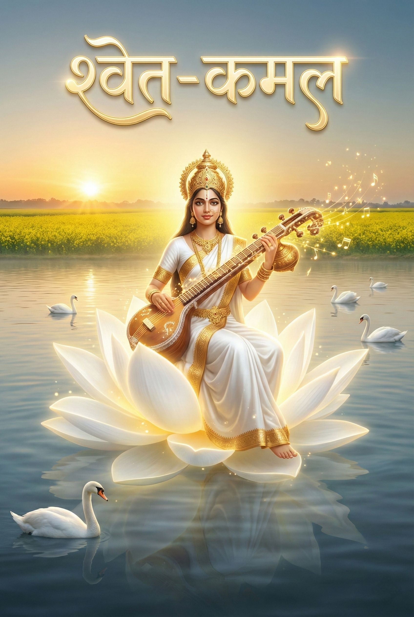 A serene yet uplifting Indian devotional song dedicated to Goddess Saraswati, blending classical Sanskrit shloka with Hindi poetry, It opens with a calm tanpura drone and soft ambient textures, creating a sacred dawn atmosphere, A gentle, reverent female vocal delivers the Saraswati Vandana in classical style, then flows into melodic verses celebrating Basant Panchami—yellow fields, renewal, wisdom, and light, Graceful veena-inspired melodic phrases symbolize Saraswati’s presence, supported by flute, light strings, and evolving rhythm, The pre-chorus feels reflective and meditative, leading into a joyful, festival-like chorus driven by tabla and hand percussion, evoking a temple bhajan, A dynamic sargam section in the bridge builds energy and devotion, rising into a grand crescendo with bells and layered rhythms, The song concludes softly, returning to ambient calm with a final whispered Sanskrit prayer, leaving a feeling of purity, knowledge, and spiritual awakening