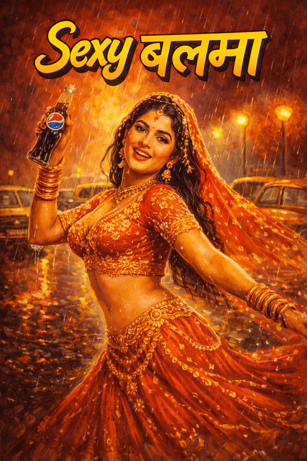 Authentic 1990s Bollywood Item Song, Organic sound, heavy rhythmic Dholak and Tabla, energetic live String Section, grand Violins, brass punches with Trumpets, playful and high-pitched female playback vocals, melodic Accordion interludes, 115 BPM, warm analog studio recording, cinematic and festive