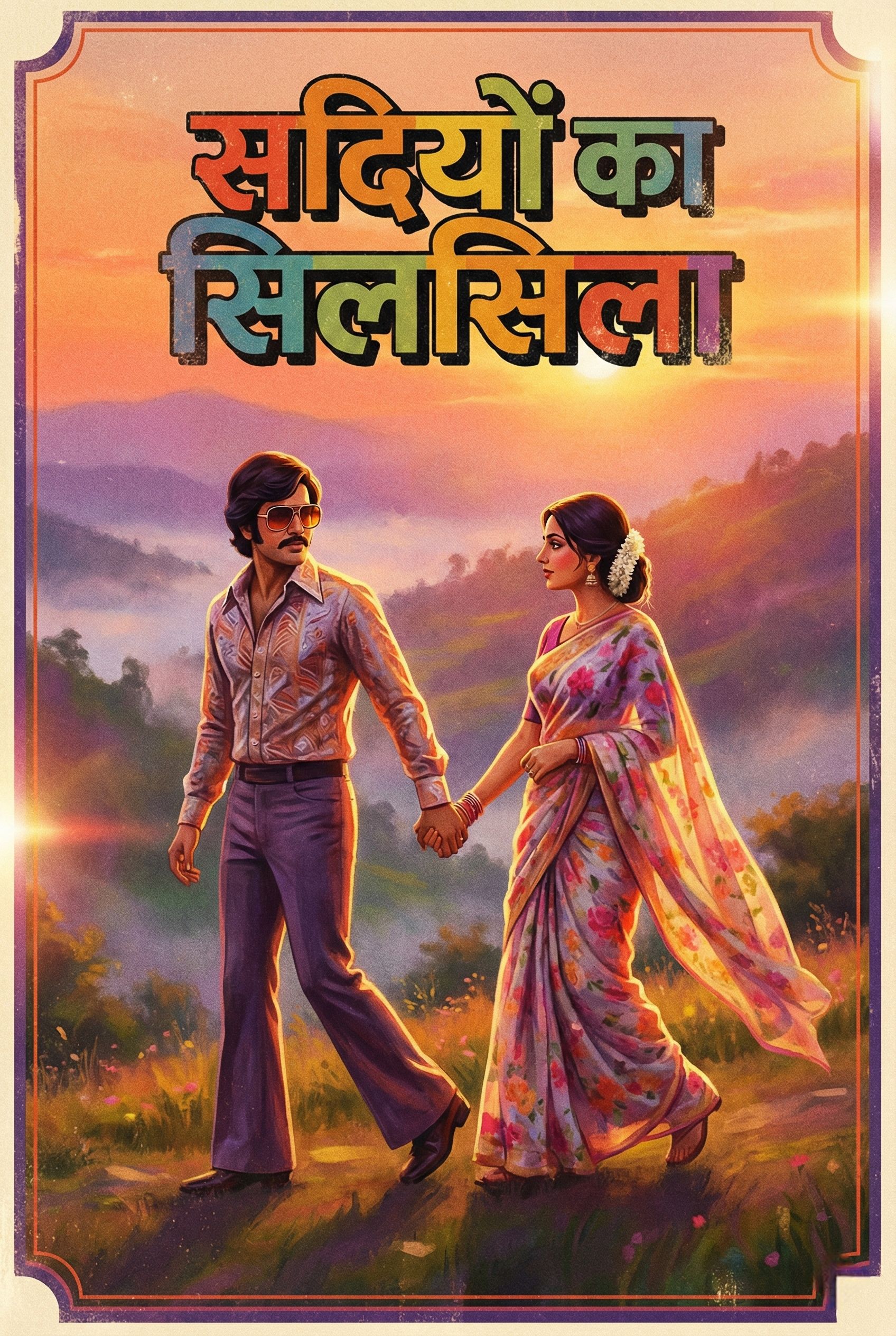 A vintage 1970s Bollywood romantic duet, mid-tempo, featuring a soulful flute intro and a groovy, melodic bassline, Orchestral arrangement with lush cinematic string sections and rhythmic bongos, Nostalgic analog warmth, high-fidelity 70s recording style, Male and female vocals in harmony, reminiscent of 70s Bollywood singers, The vibe is evocative, poetic, and rhythmic, blending classic Indian filmy melodies with a touch of retro funk