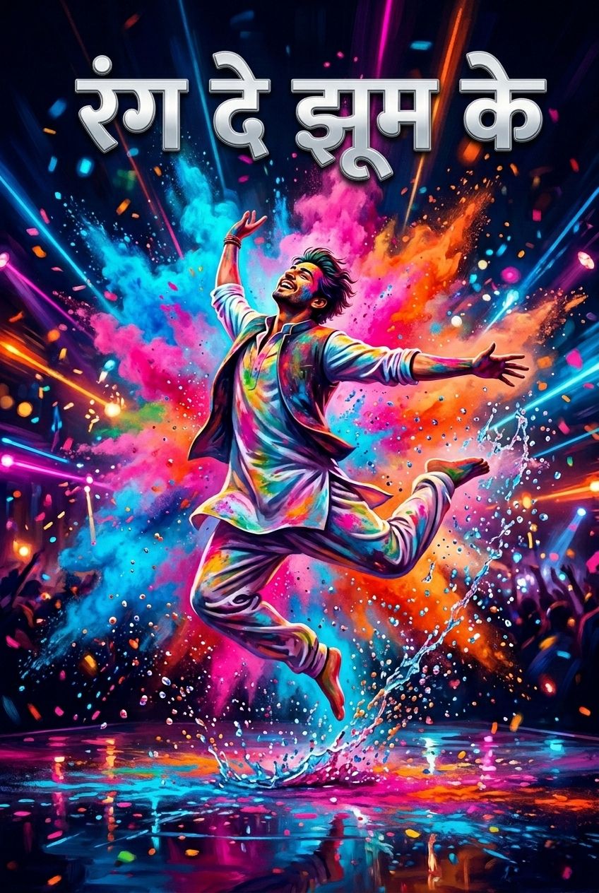Bollywood EDM Fusion, Holi Dance Track, 132 BPM, Heavy Bass Drop, Thumping Dhol and Dholak, Festive Whistles, Energetic Male vocals, Fast-paced Synth-pop, Club Atmosphere, High-fidelity studio production