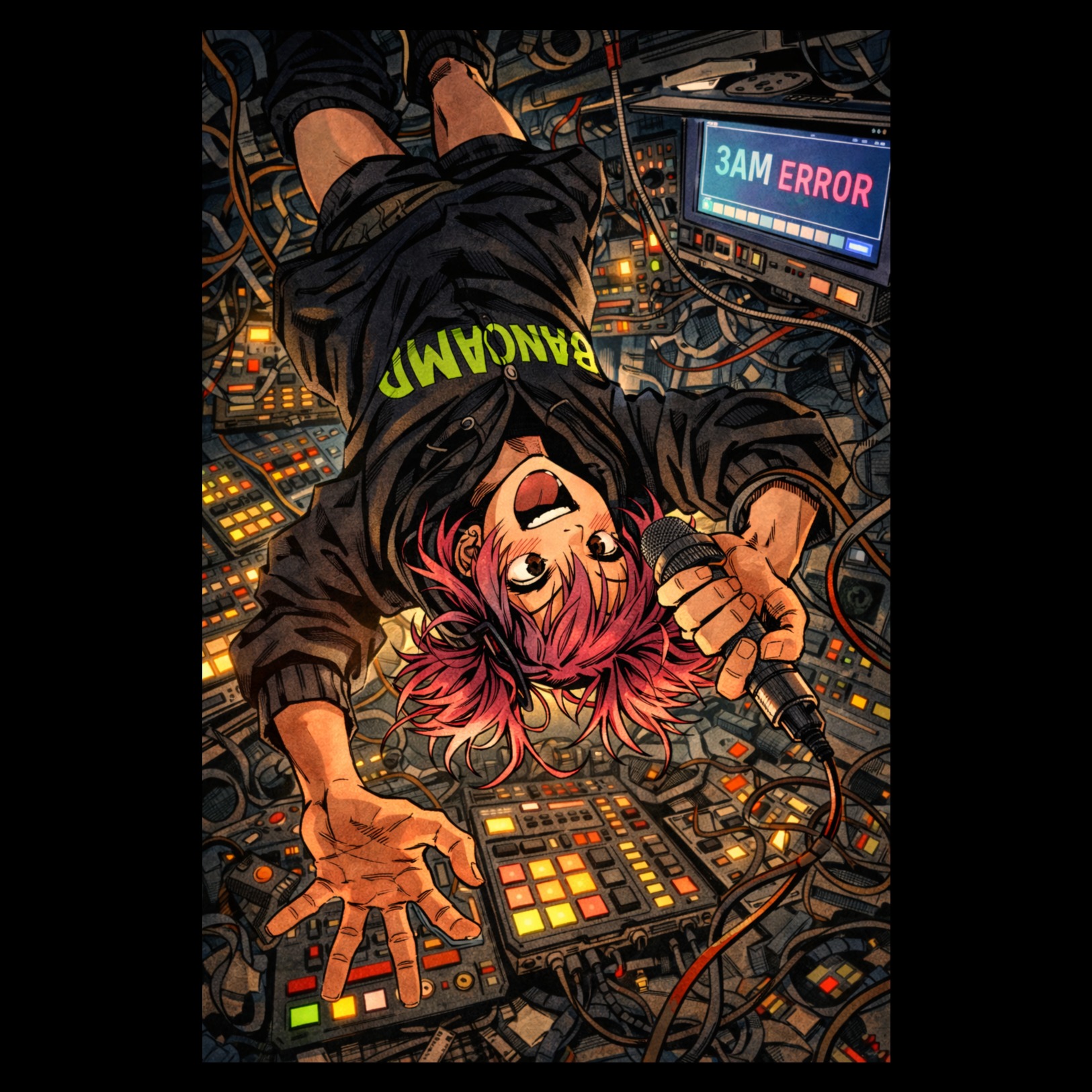 Chaotic electro-riot J-punk with feral idol-punk energy that actively rejects catchiness, The track prioritizes irritation over excitement, using broken structure, excessive repetition, and hostile chant loops that feel nagging, mocking, and slightly mean rather than fun, Vocals are sneering, clipped, and abrasive, switching between chaotic taunting delivery and detached restraint without a clear lead, Chants should resemble heckling or provocation, not crowd hype, Guitars and synths are jagged and aggressive, drums are loud and fast but deny groove payoff, The song should feel restless, unfinished, and confrontational — constant motion with no arrival and no release