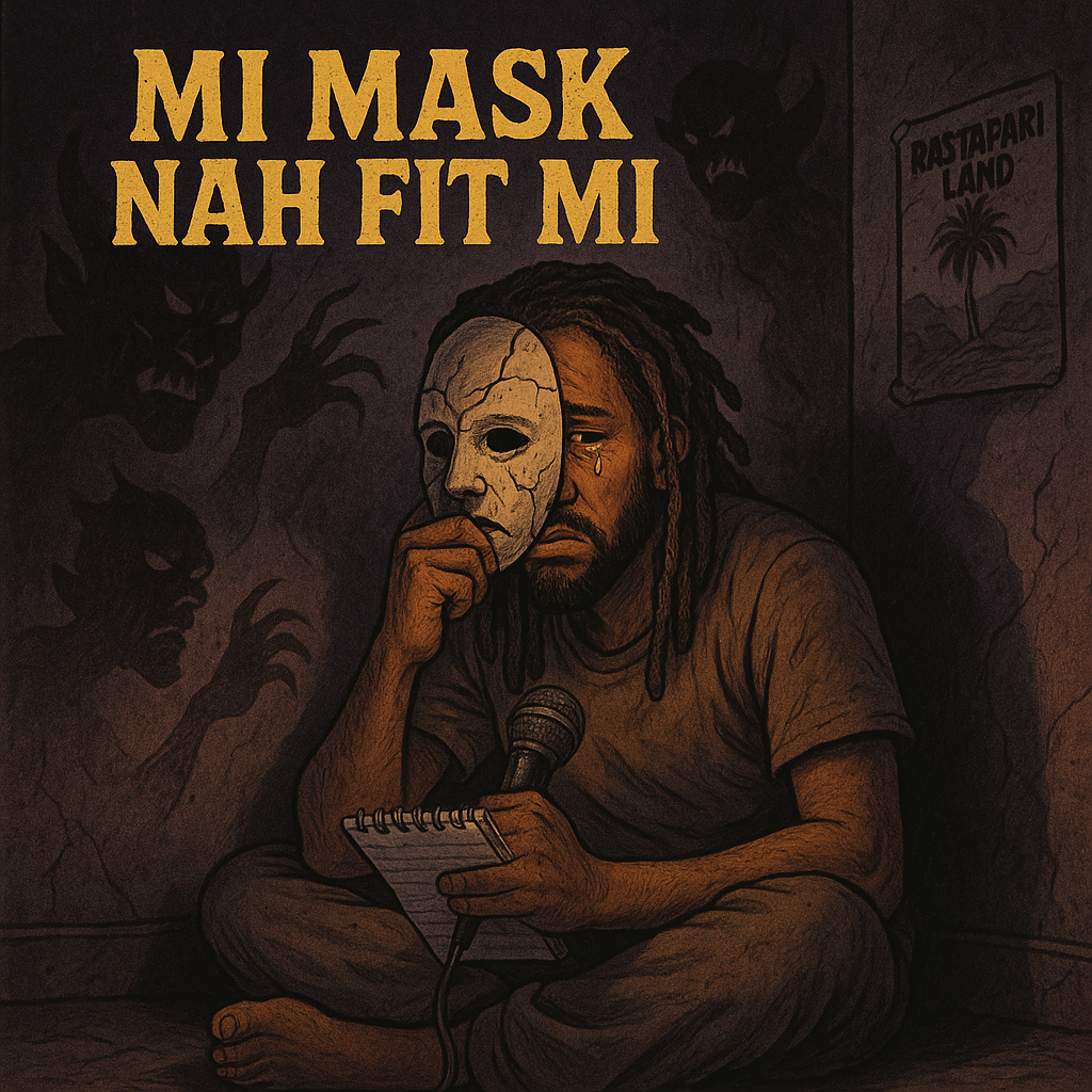 A deep and emotional Jamaican patois reggae song with elements of dark roots and lo-fi dub, Male vocals filled with pain and vulnerability, singing about depression, trauma, work struggles, and wearing a mask in daily life, Instrumental features slow dub riddims, haunting basslines, ambient echo effects, soft guitar skanks, and subtle lo-fi textures, The tone is raw, heartfelt, and personal—like a cry for help from someone who’s hit rock bottom but still has a fire inside, Inspired by Damian Marley, and with a heavy, introspective twist