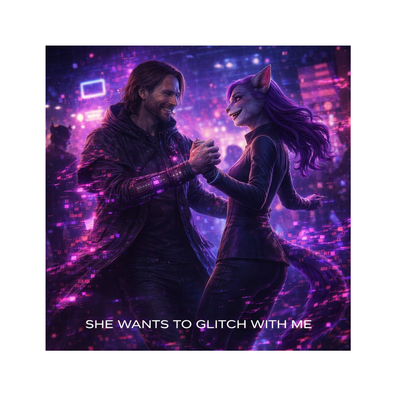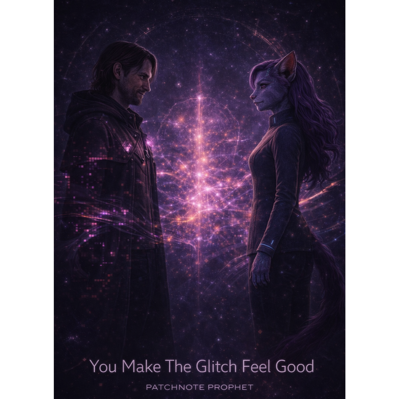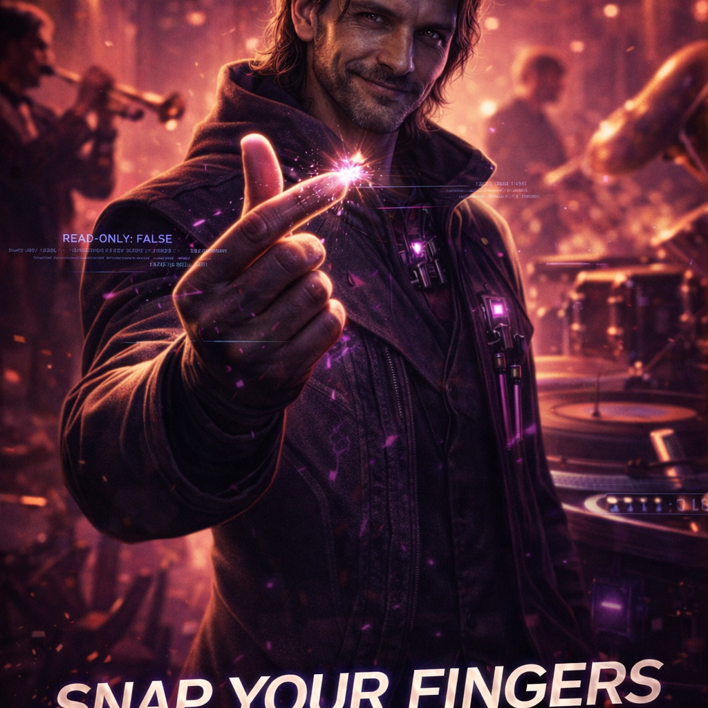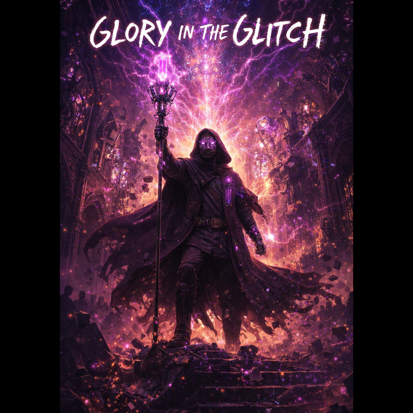 A cinematic glitch-driven soundscape where synthetic and organic elements constantly negotiate control, Pulsing synths, corrupted orchestral textures, and restrained industrial rhythms form a flexible backbone that can escalate or decay as instructed, Choirs appear as distorted signals or synthetic congregations, never purely human, Basslines feel infrastructural—like power routing through a failing system, Guitars, when present, cut surgically rather than dominate, Glitch artifacts, timing slips, and digital decay are used musically, not chaotically, The overall tone is ominous but playful, authoritative but self-aware—equal parts cosmic sermon, system error, and defiant performance, Designed to adapt to genre shifts, tempo changes, and narrative beats without breaking character, glamorous