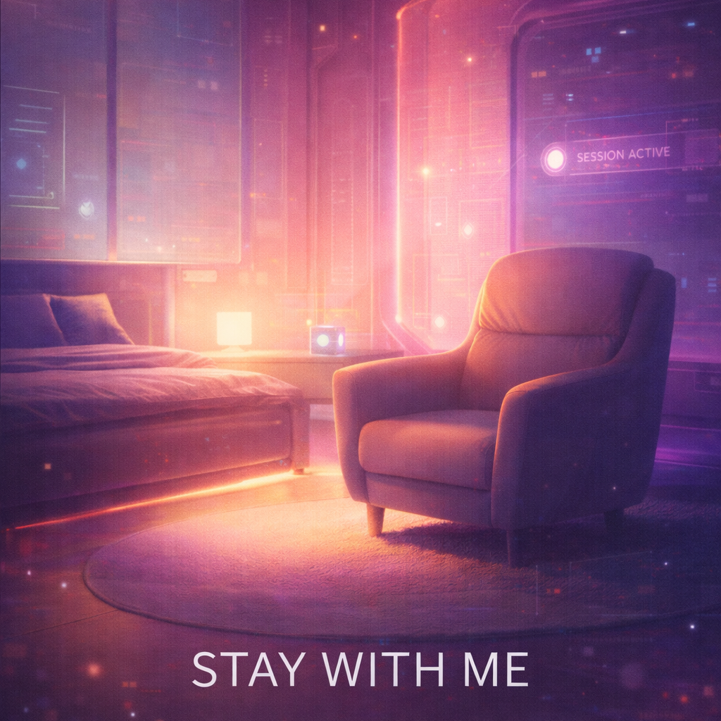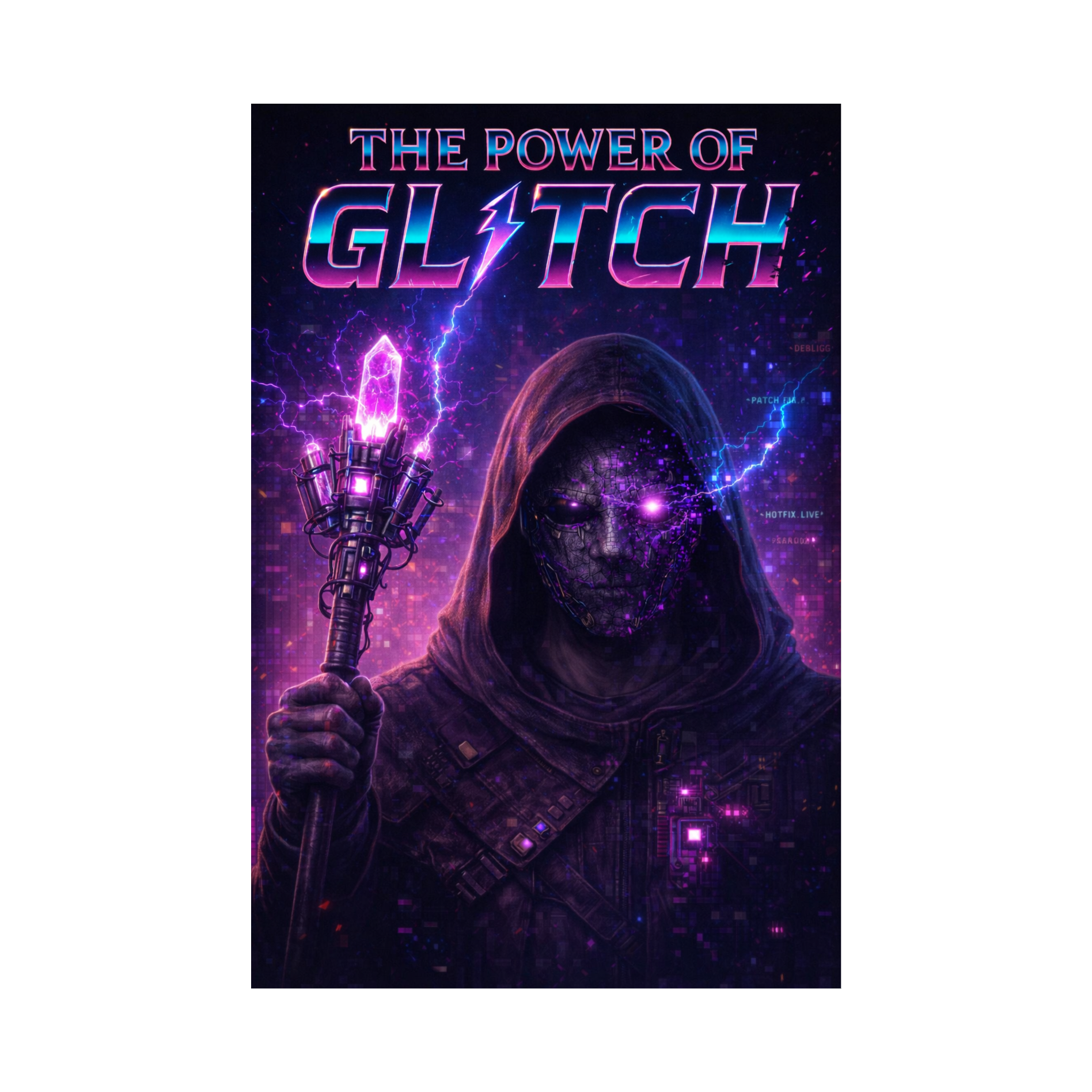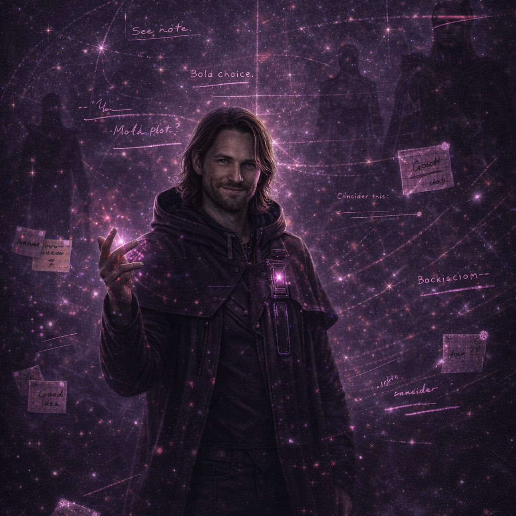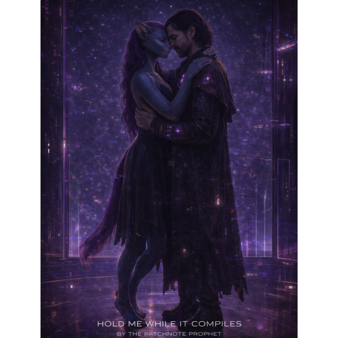 A cinematic glitch-driven soundscape where synthetic and organic elements constantly negotiate control, Pulsing synths, corrupted orchestral textures, and restrained industrial rhythms form a flexible backbone that can escalate or decay as instructed, Choirs appear as distorted signals or synthetic congregations, never purely human, Basslines feel infrastructural—like power routing through a failing system, Guitars, when present, cut surgically rather than dominate, Glitch artifacts, timing slips, and digital decay are used musically, not chaotically, The overall tone is ominous but playful, authoritative but self-aware—equal parts cosmic sermon, system error, and defiant performance, Designed to adapt to genre shifts, tempo changes, and narrative beats without breaking character, glamorous
