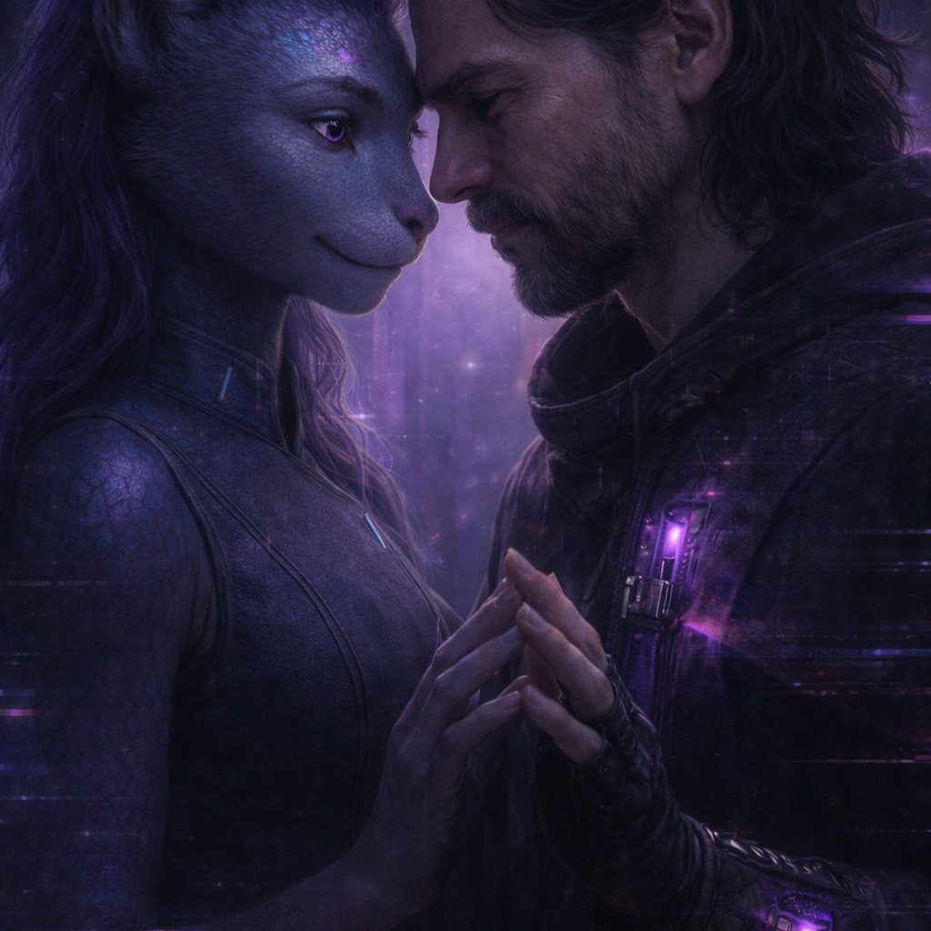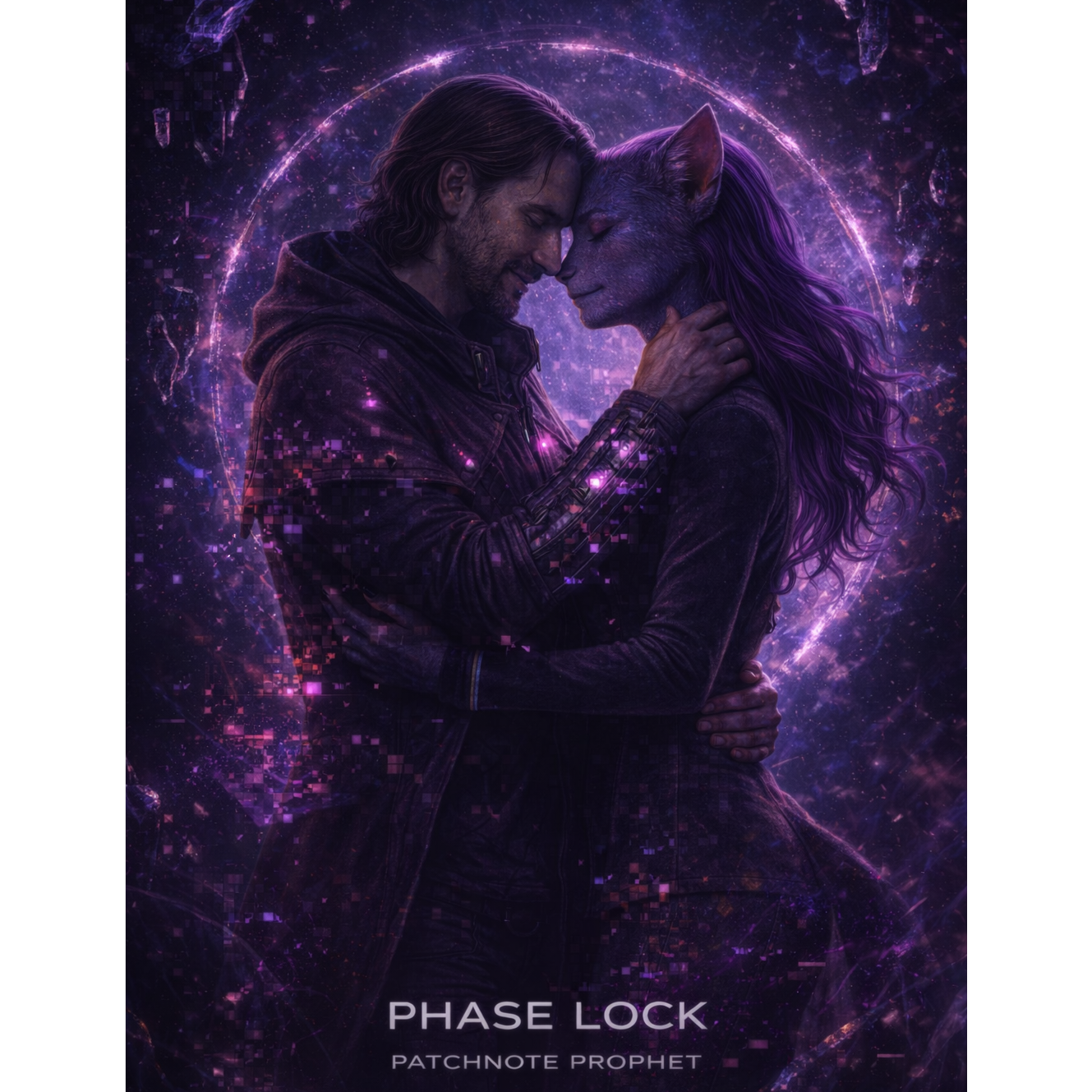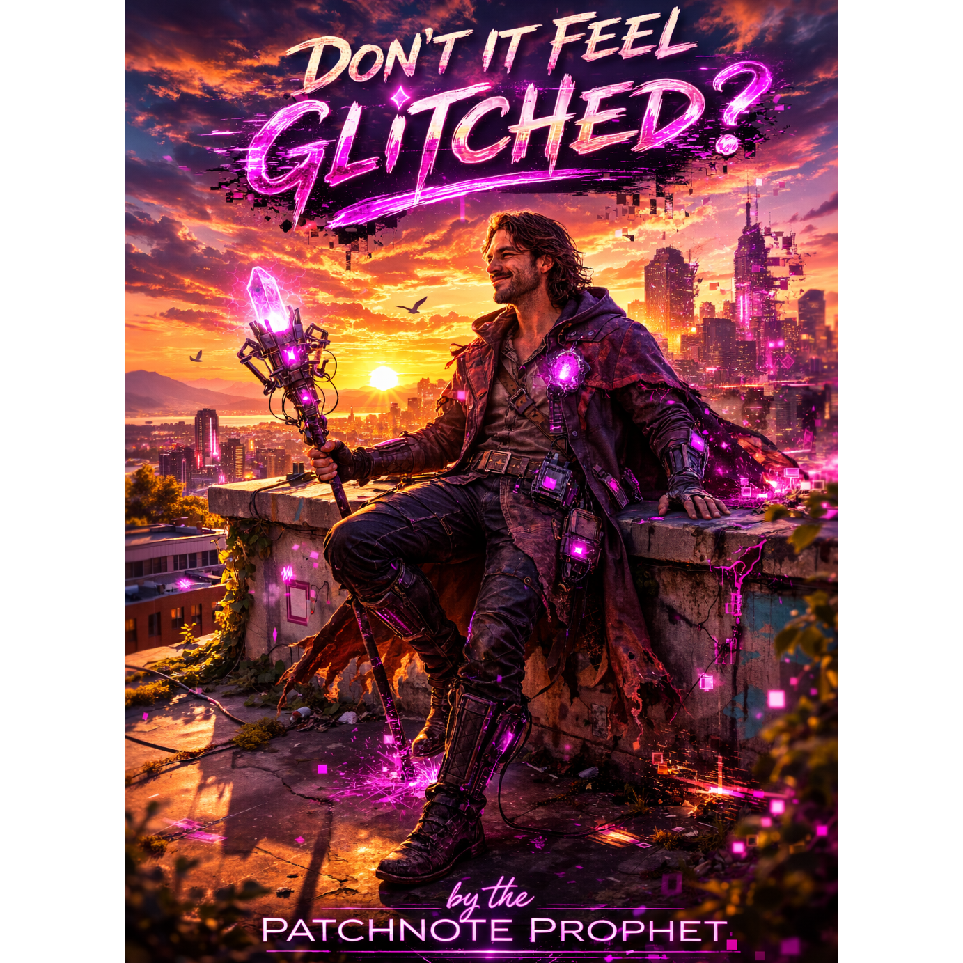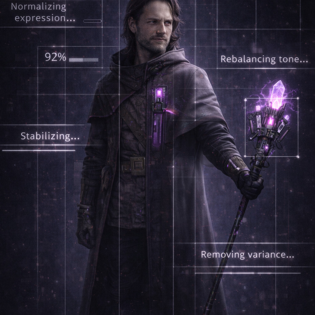 A cinematic glitch-driven soundscape where synthetic and organic elements constantly negotiate control, Pulsing synths, corrupted orchestral textures, and restrained industrial rhythms form a flexible backbone that can escalate or decay as instructed, Choirs appear as distorted signals or synthetic congregations, never purely human, Basslines feel infrastructural—like power routing through a failing system, Guitars, when present, cut surgically rather than dominate, Glitch artifacts, timing slips, and digital decay are used musically, not chaotically, The overall tone is ominous but playful, authoritative but self-aware—equal parts cosmic sermon, system error, and defiant performance, Designed to adapt to genre shifts, tempo changes, and narrative beats without breaking character, glamorous