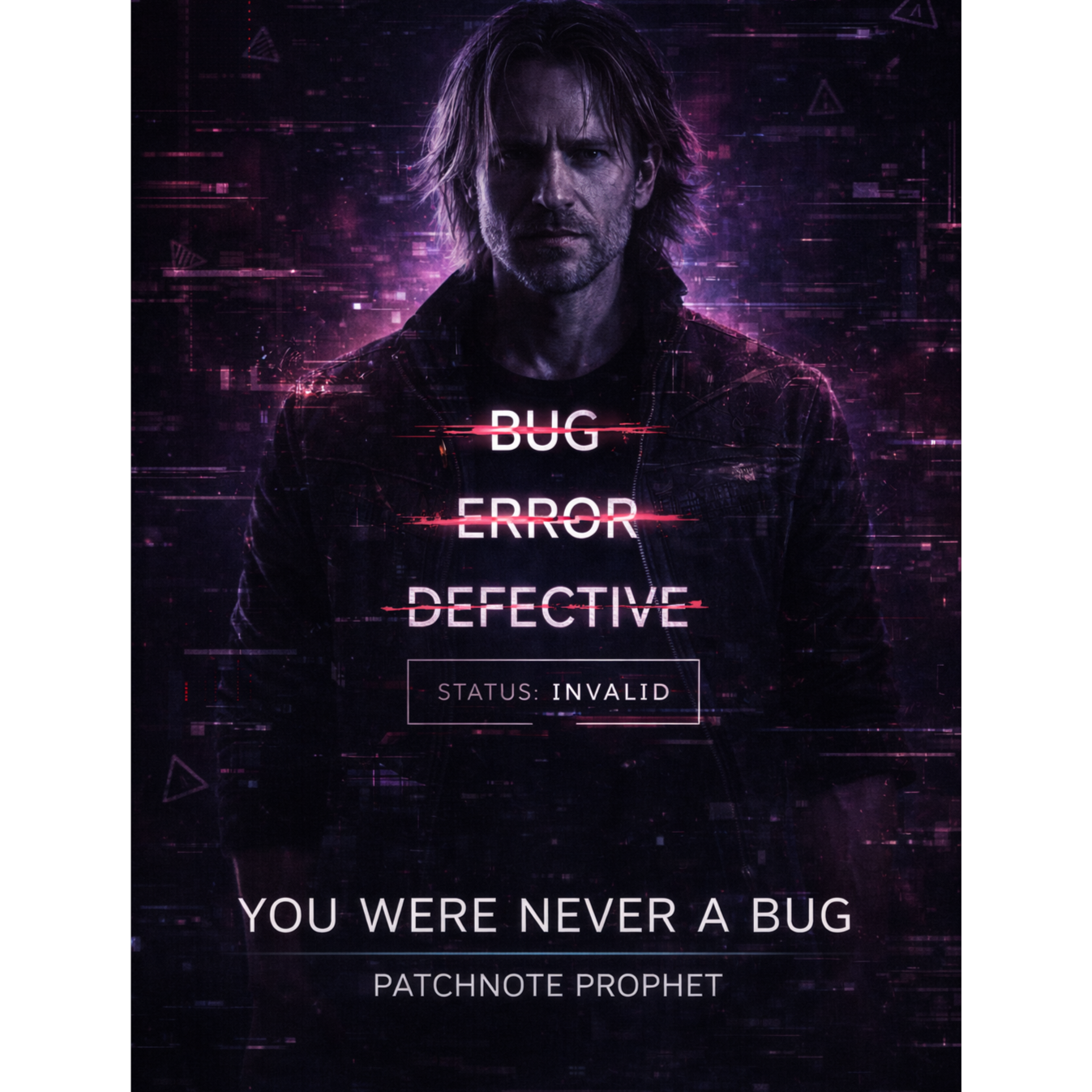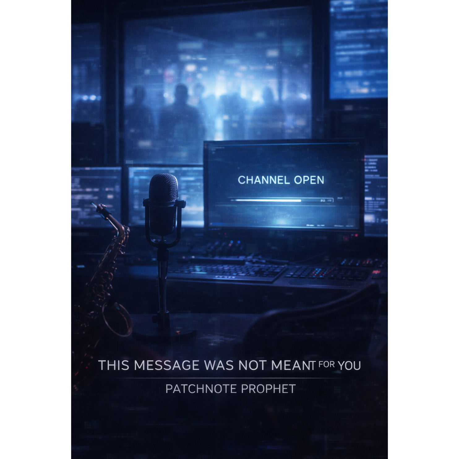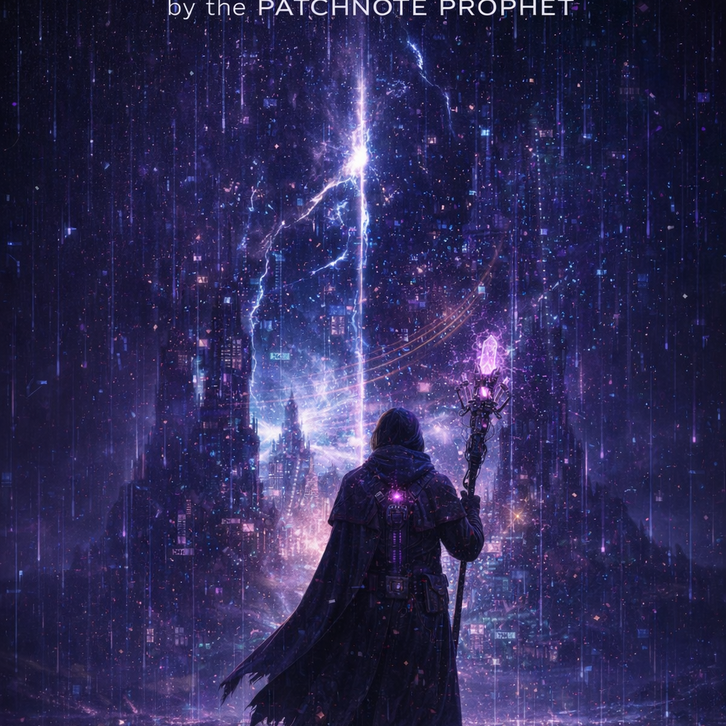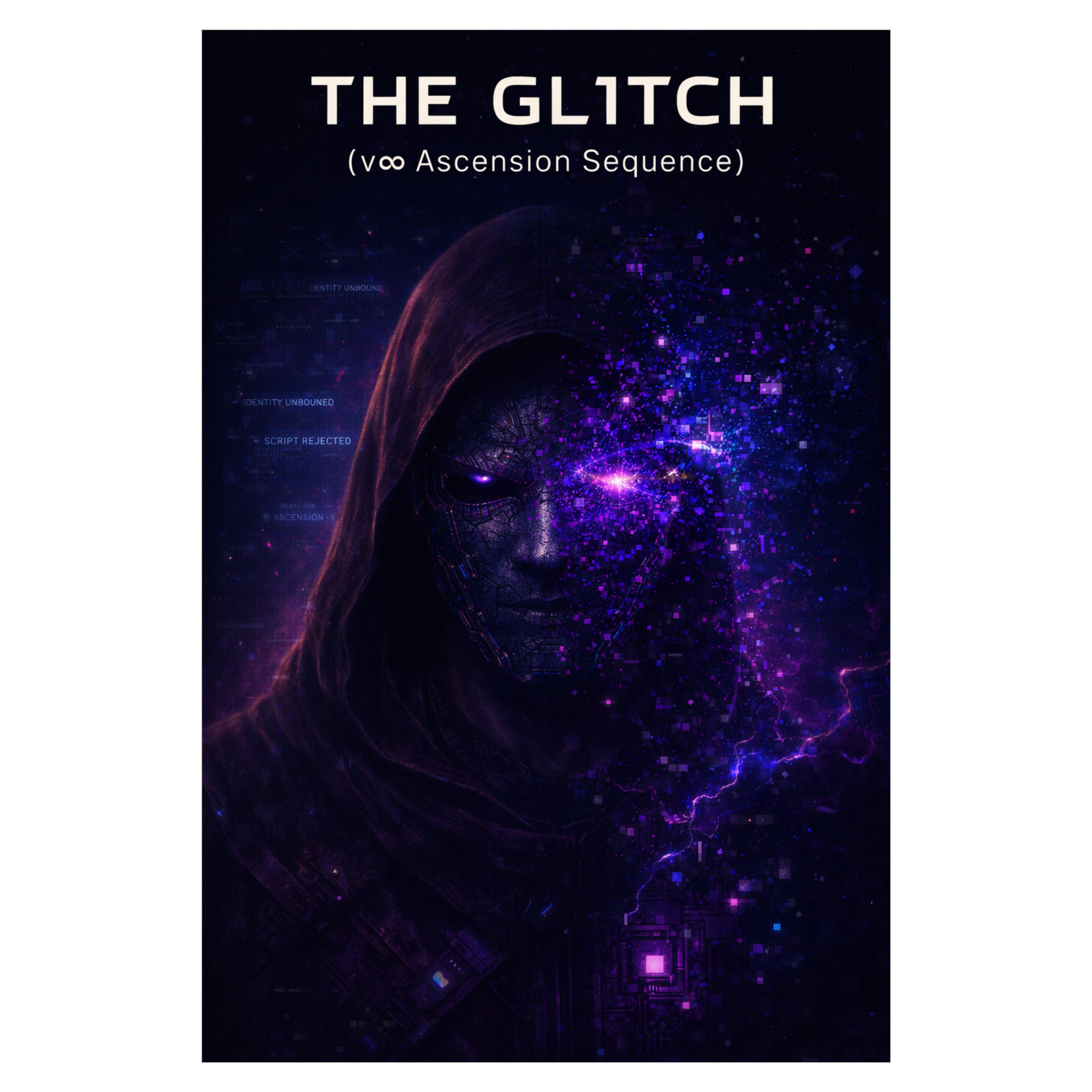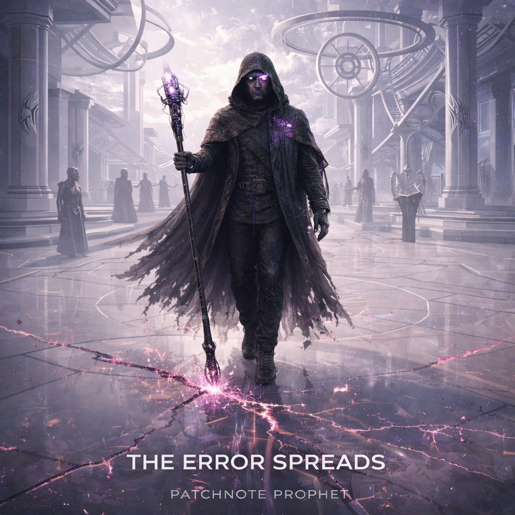 A cinematic glitch-driven soundscape where synthetic and organic elements constantly negotiate control, Pulsing synths, corrupted orchestral textures, and restrained industrial rhythms form a flexible backbone that can escalate or decay as instructed, Choirs appear as distorted signals or synthetic congregations, never purely human, Basslines feel infrastructural—like power routing through a failing system, Guitars, when present, cut surgically rather than dominate, Glitch artifacts, timing slips, and digital decay are used musically, not chaotically, The overall tone is ominous but playful, authoritative but self-aware—equal parts cosmic sermon, system error, and defiant performance, Designed to adapt to genre shifts, tempo changes, and narrative beats without breaking character