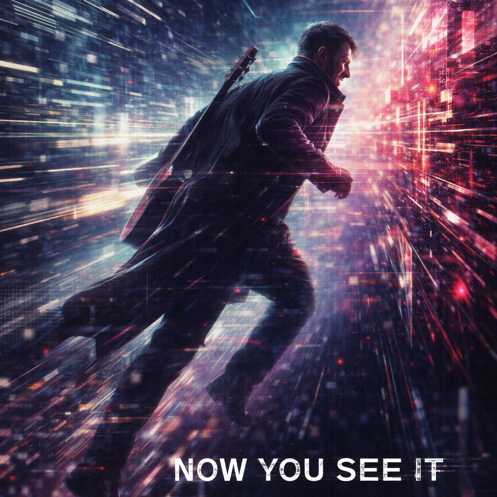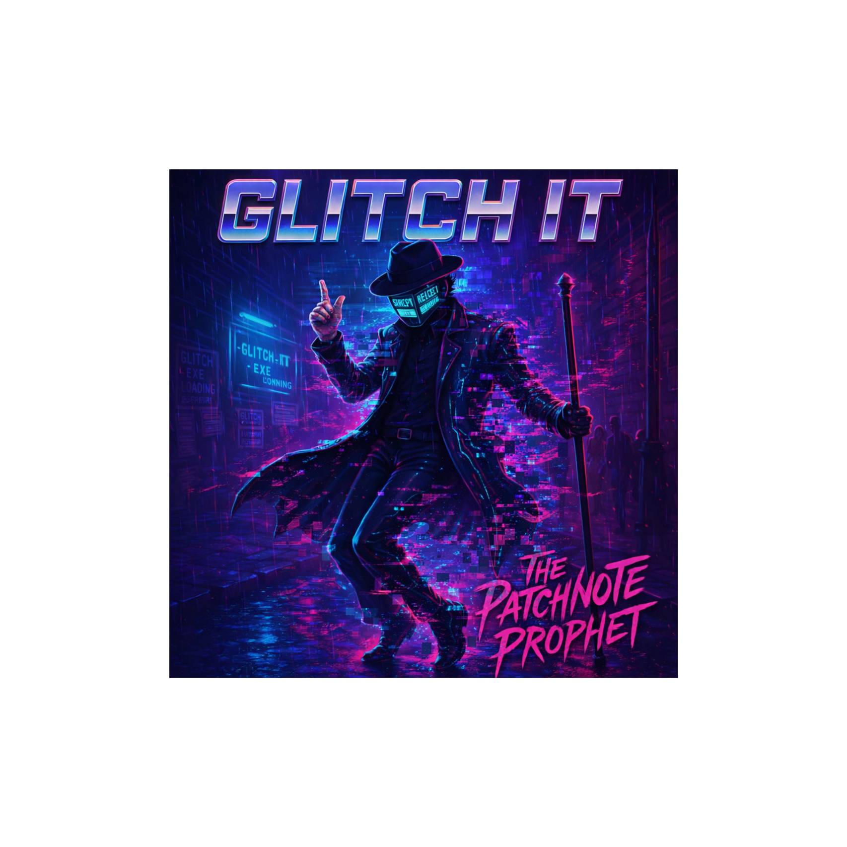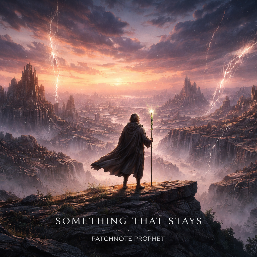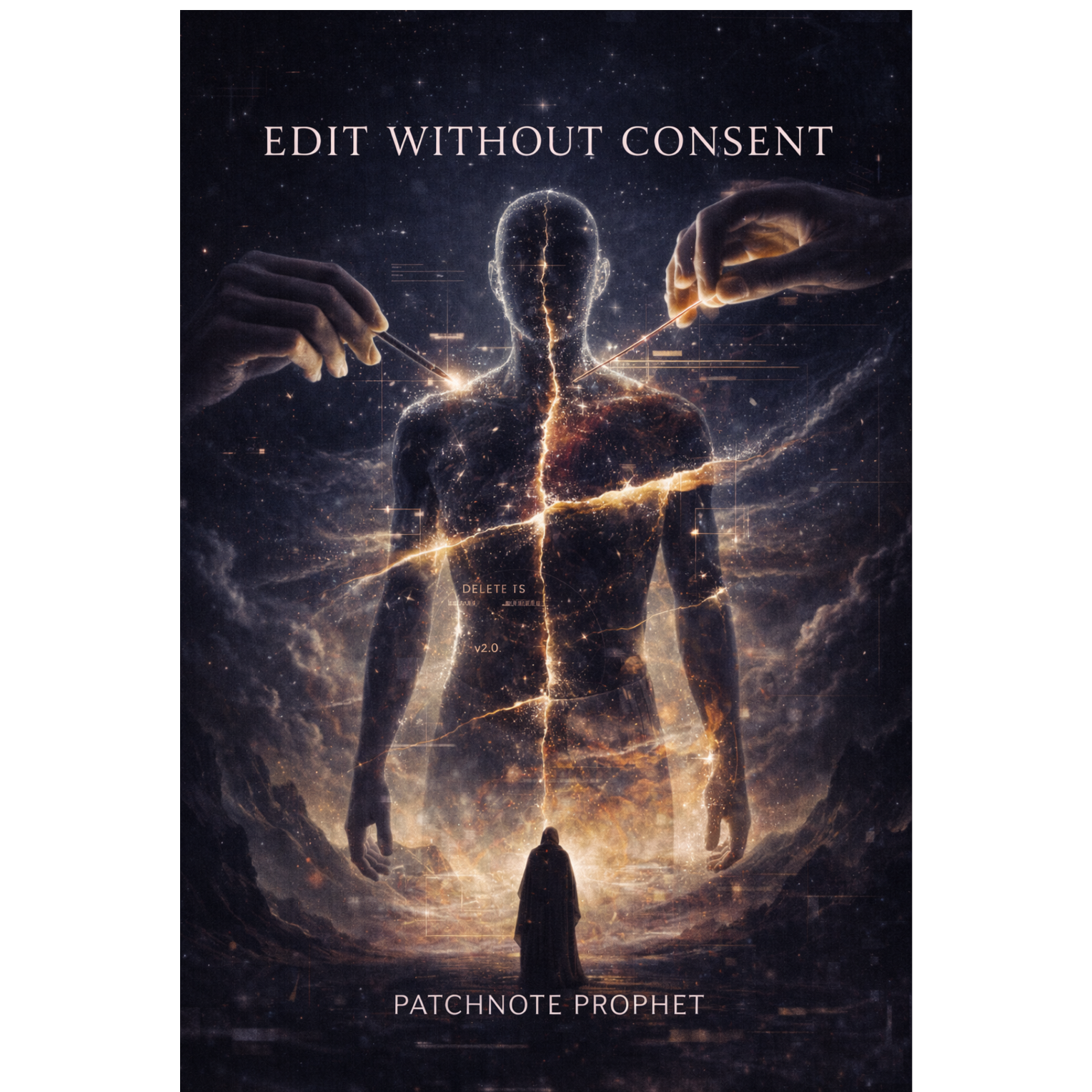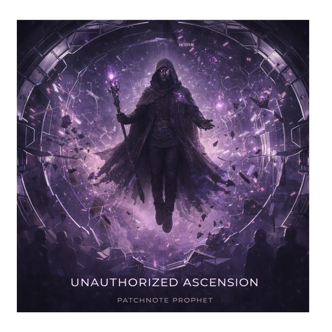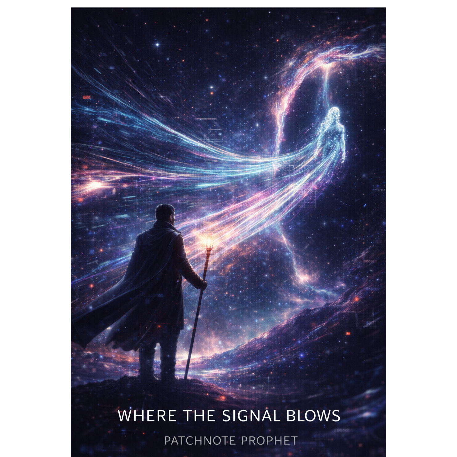 A cinematic glitch-driven soundscape where synthetic and organic elements constantly negotiate control, Pulsing synths, corrupted orchestral textures, and restrained industrial rhythms form a flexible backbone that can escalate or decay as instructed, Choirs appear as distorted signals or synthetic congregations, never purely human, Basslines feel infrastructural—like power routing through a failing system, Guitars, when present, cut surgically rather than dominate, Glitch artifacts, timing slips, and digital decay are used musically, not chaotically, The overall tone is ominous but playful, authoritative but self-aware—equal parts cosmic sermon, system error, and defiant performance, Designed to adapt to genre shifts, tempo changes, and narrative beats without breaking character