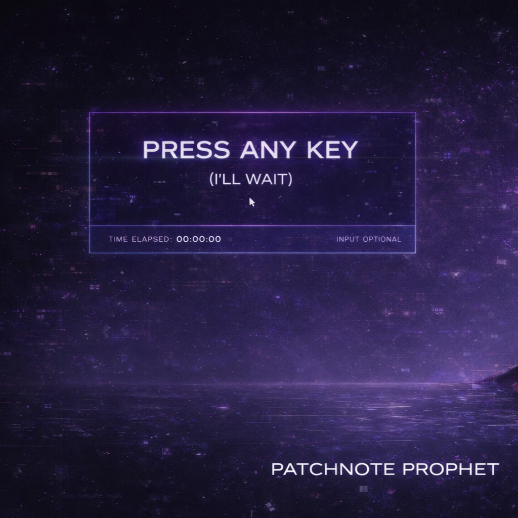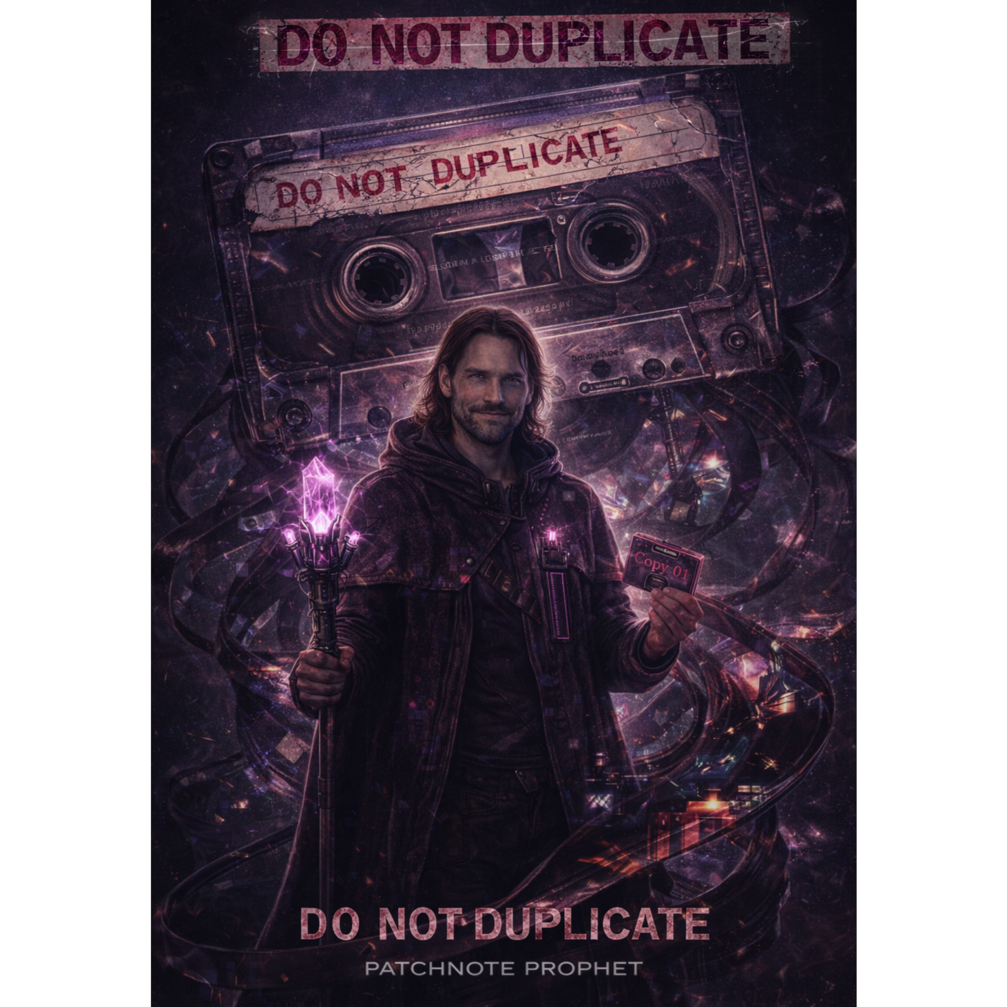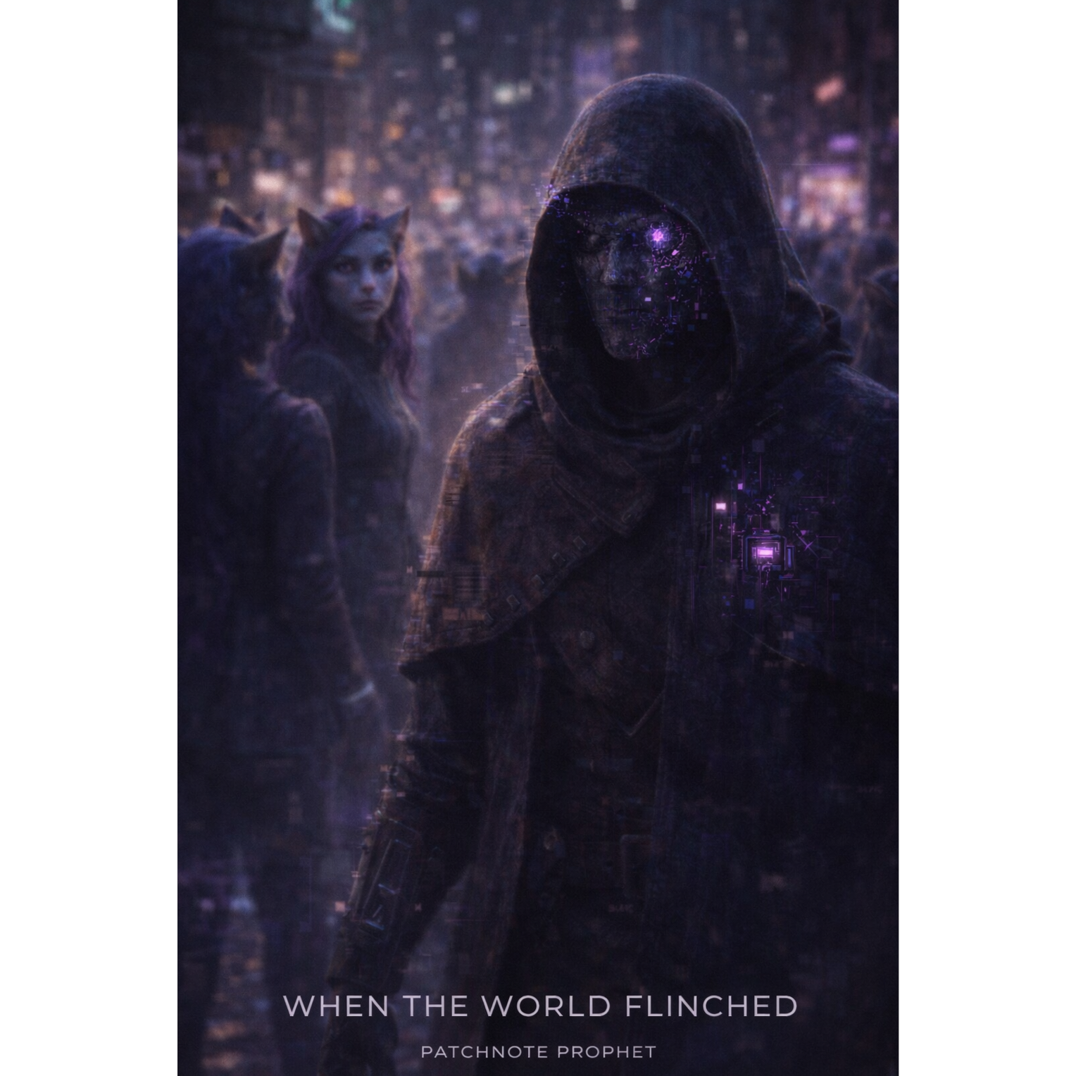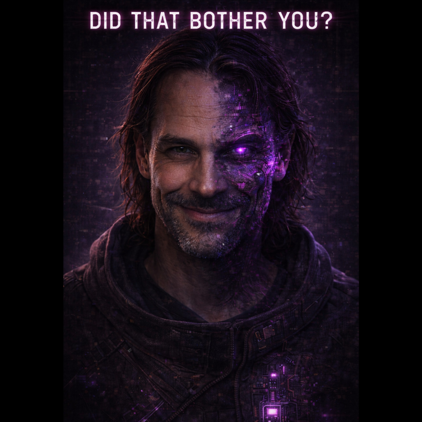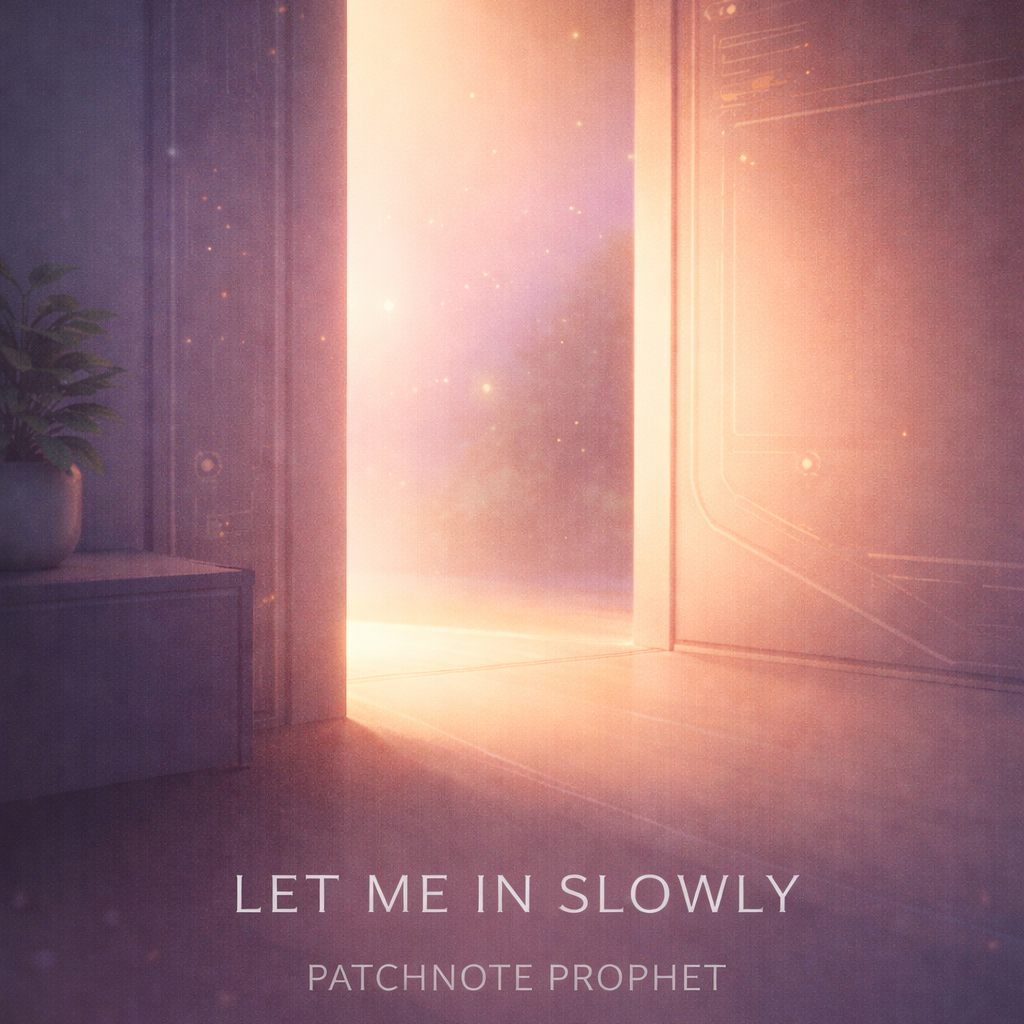 A cinematic glitch-driven soundscape where synthetic and organic elements constantly negotiate control, Pulsing synths, corrupted orchestral textures, and restrained industrial rhythms form a flexible backbone that can escalate or decay as instructed, Choirs appear as distorted signals or synthetic congregations, never purely human, Basslines feel infrastructural—like power routing through a failing system, Guitars, when present, cut surgically rather than dominate, Glitch artifacts, timing slips, and digital decay are used musically, not chaotically, The overall tone is ominous but playful, authoritative but self-aware—equal parts cosmic sermon, system error, and defiant performance, Designed to adapt to genre shifts, tempo changes, and narrative beats without breaking character