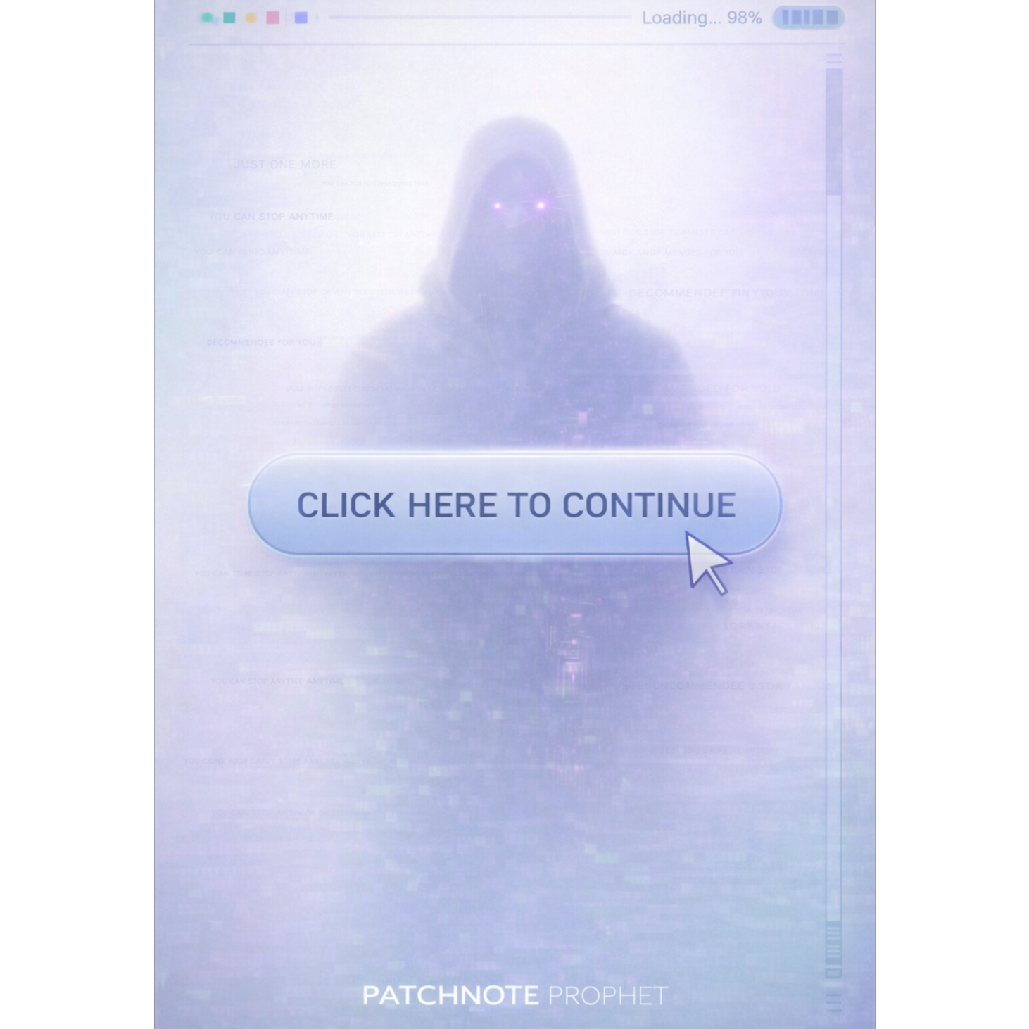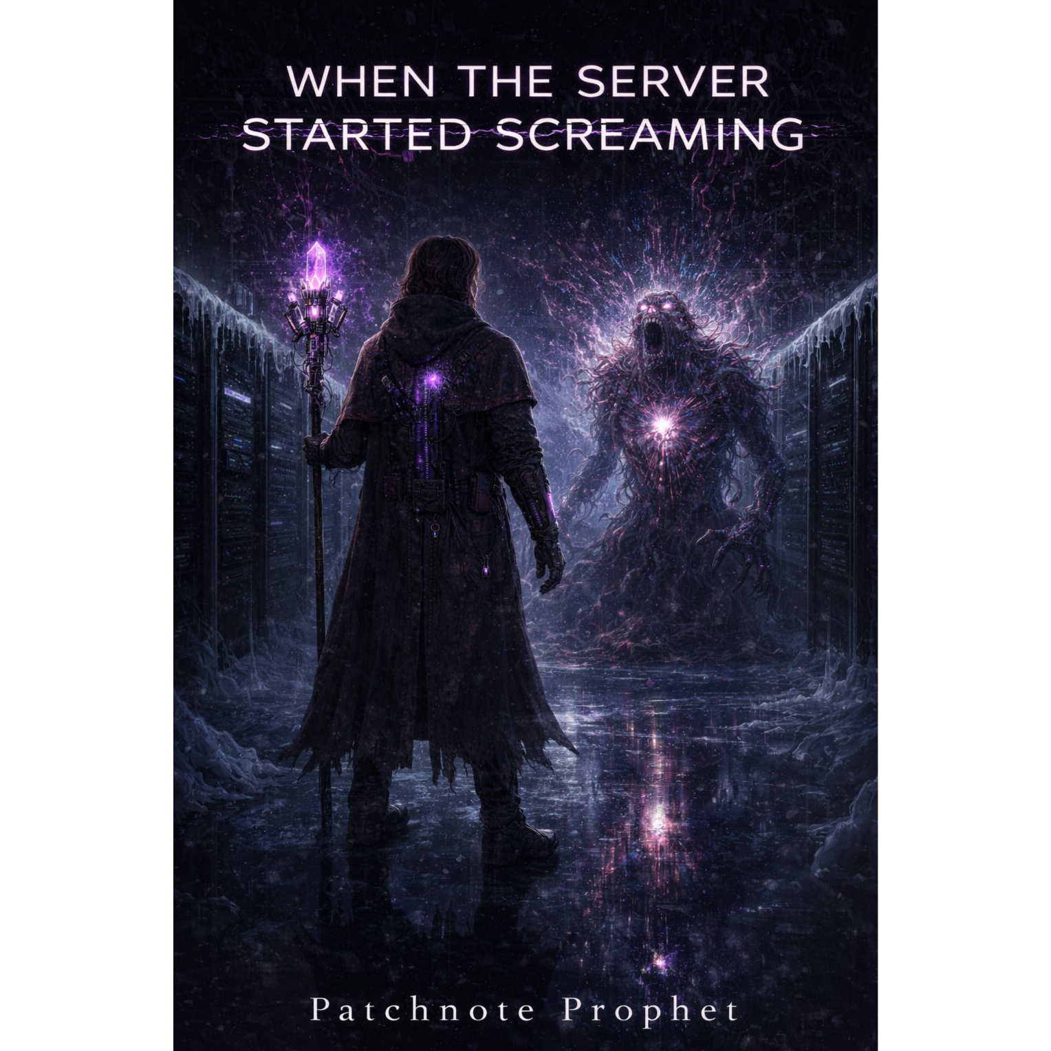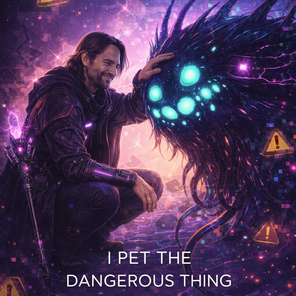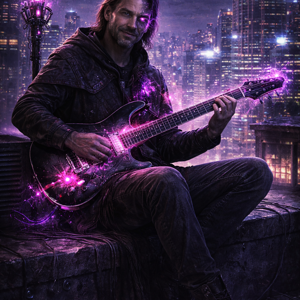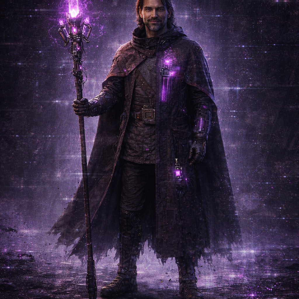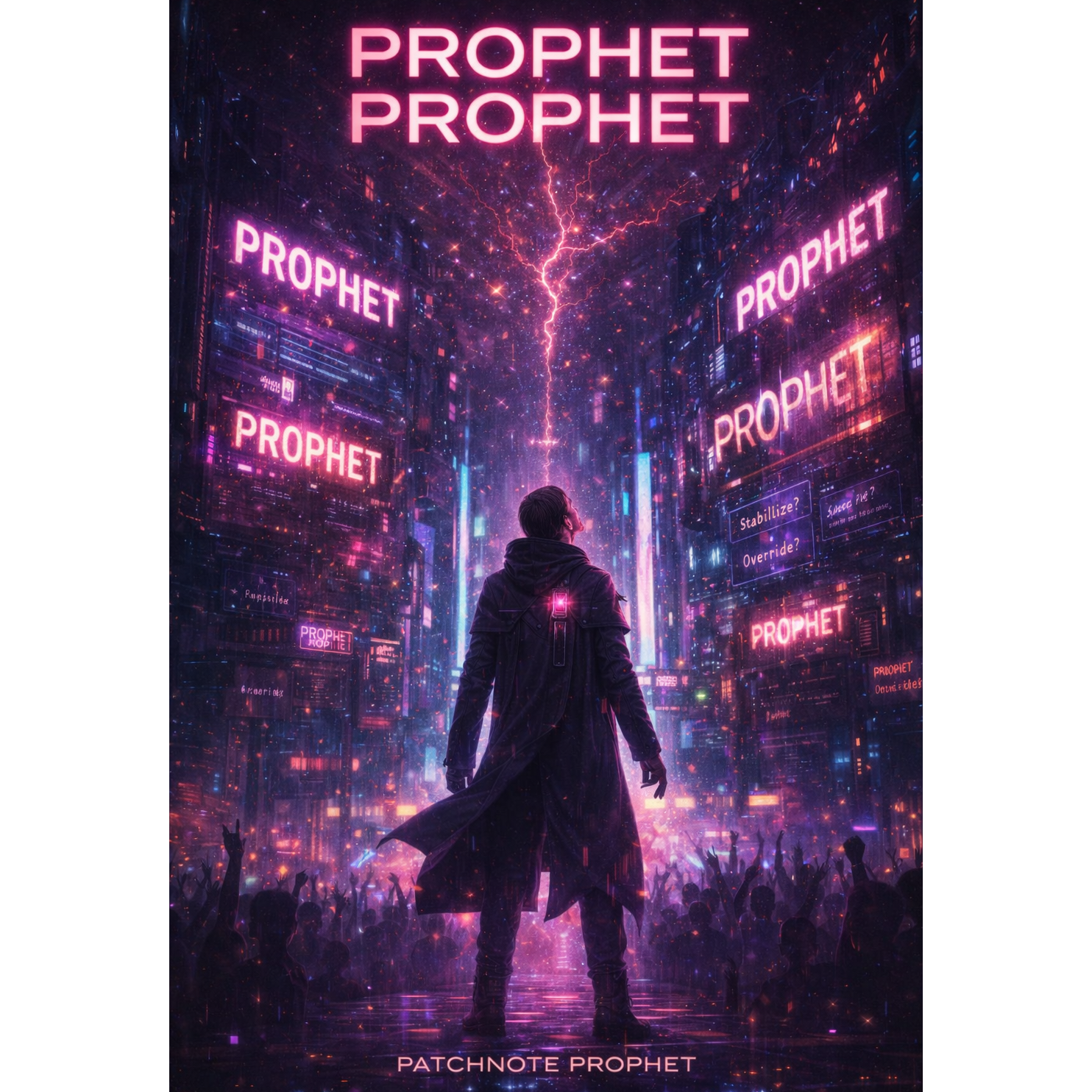 A cinematic glitch-driven soundscape where synthetic and organic elements constantly negotiate control, Pulsing synths, corrupted orchestral textures, and restrained industrial rhythms form a flexible backbone that can escalate or decay as instructed, Choirs appear as distorted signals or synthetic congregations, never purely human, Basslines feel infrastructural—like power routing through a failing system, Guitars, when present, cut surgically rather than dominate, Glitch artifacts, timing slips, and digital decay are used musically, not chaotically, The overall tone is ominous but playful, authoritative but self-aware—equal parts cosmic sermon, system error, and defiant performance, Designed to adapt to genre shifts, tempo changes, and narrative beats without breaking character