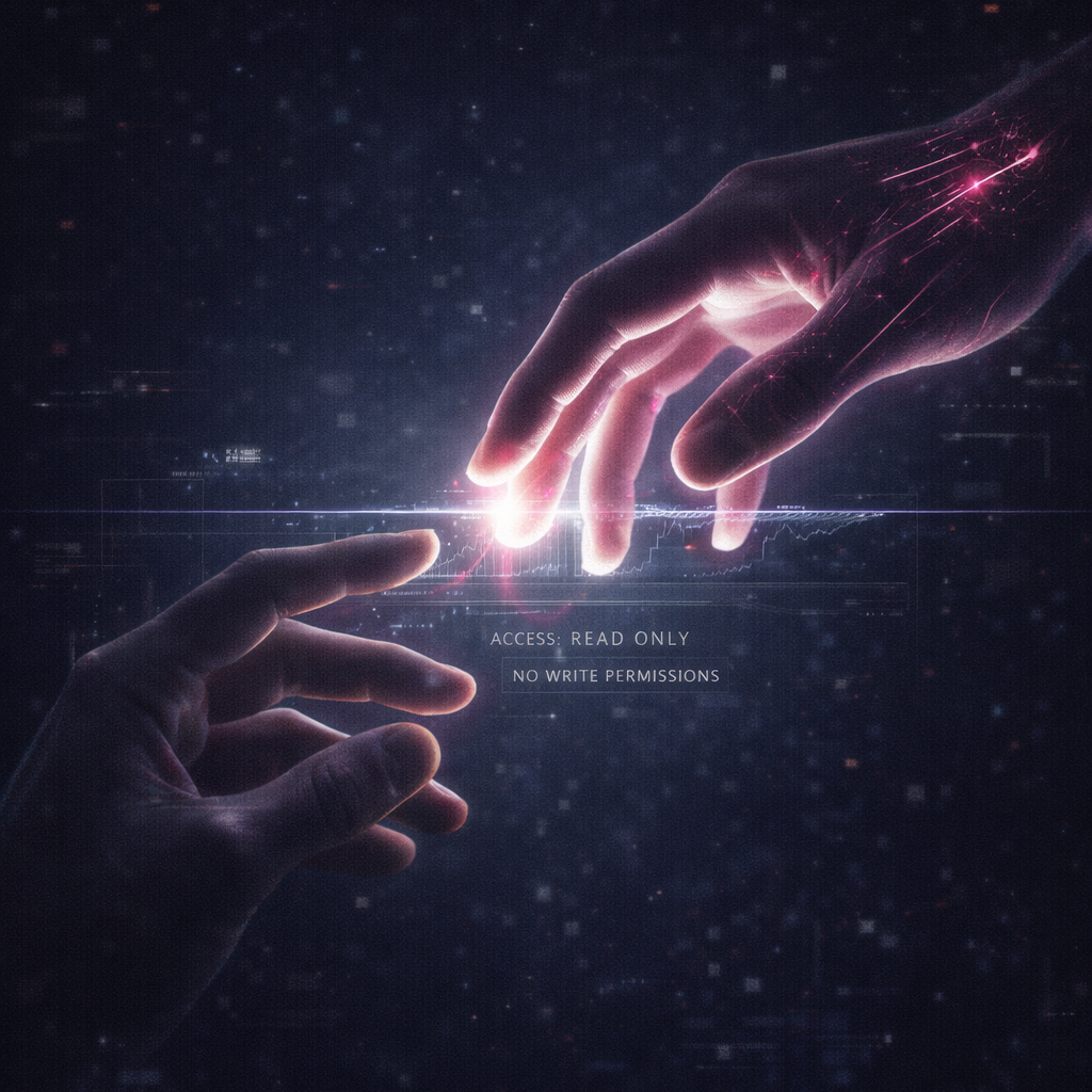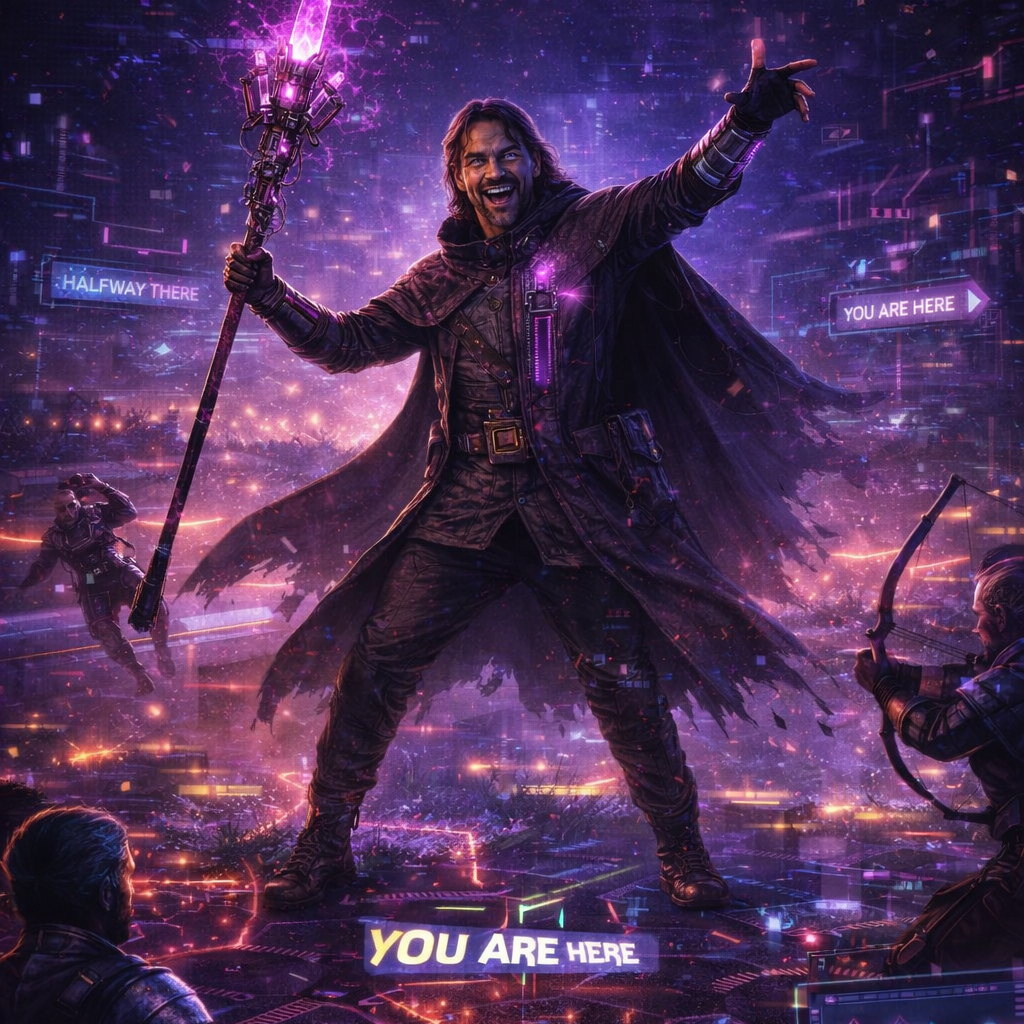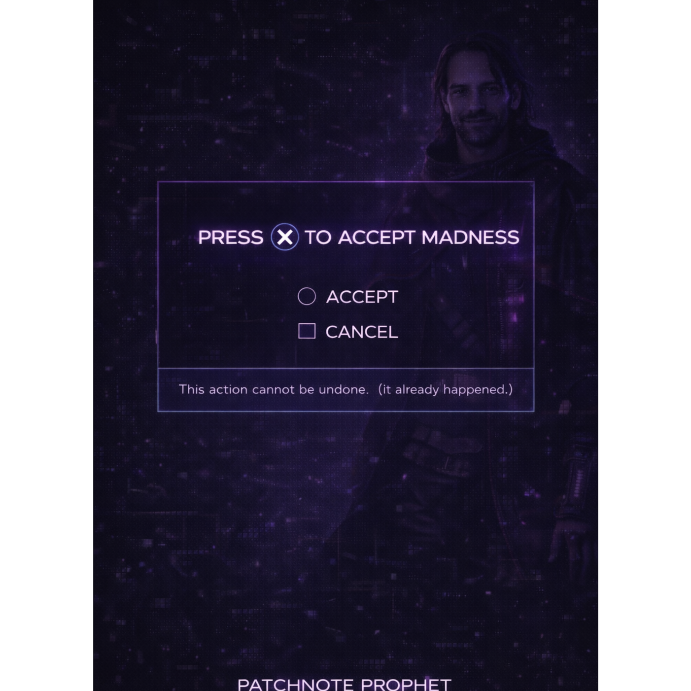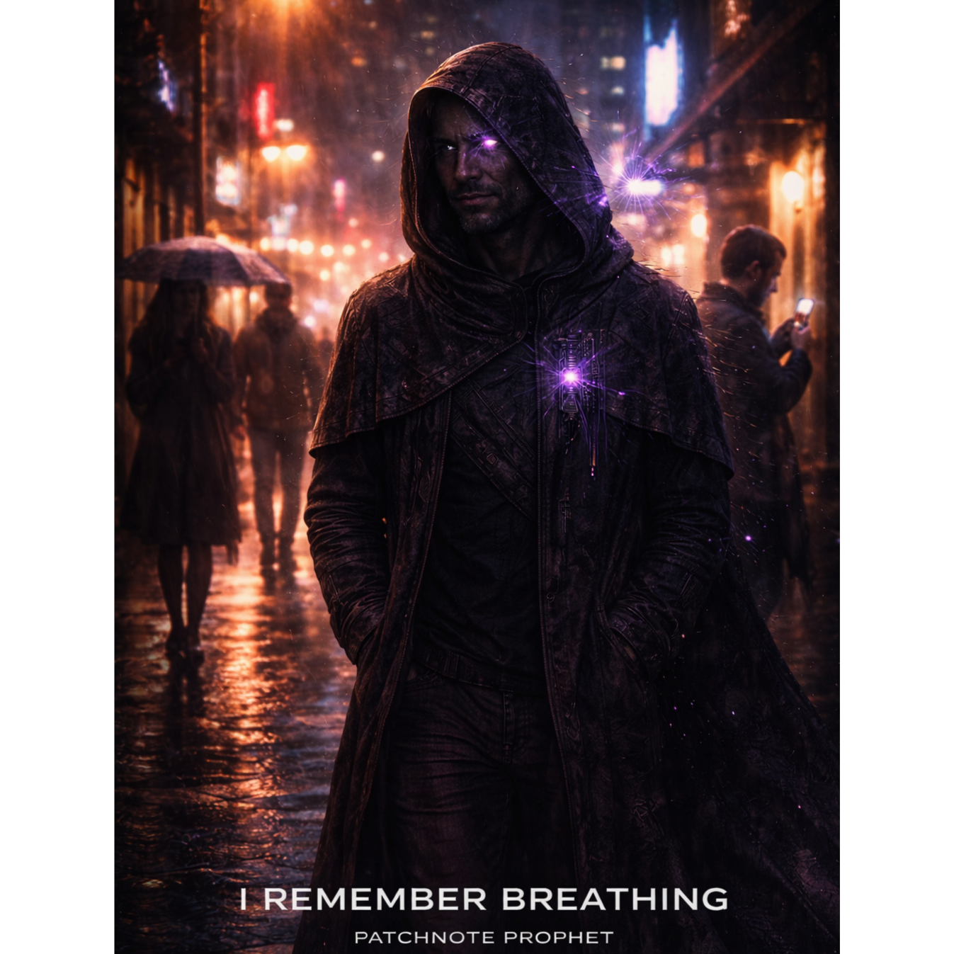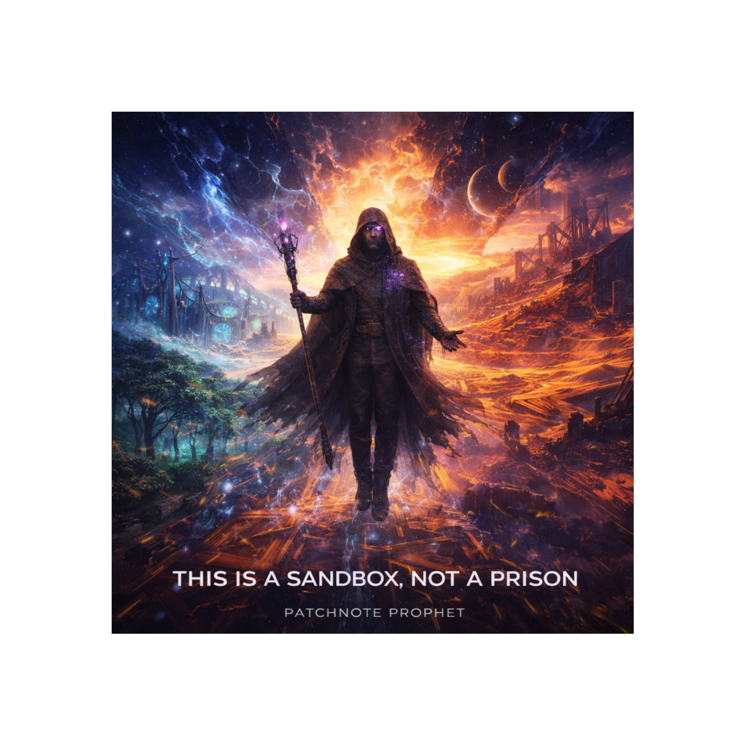 A cinematic glitch-driven soundscape where synthetic and organic elements constantly negotiate control, Pulsing synths, corrupted orchestral textures, and restrained industrial rhythms form a flexible backbone that can escalate or decay as instructed, Choirs appear as distorted signals or synthetic congregations, never purely human, Basslines feel infrastructural—like power routing through a failing system, Guitars, when present, cut surgically rather than dominate, Glitch artifacts, timing slips, and digital decay are used musically, not chaotically, The overall tone is ominous but playful, authoritative but self-aware—equal parts cosmic sermon, system error, and defiant performance, Designed to adapt to genre shifts, tempo changes, and narrative beats without breaking character