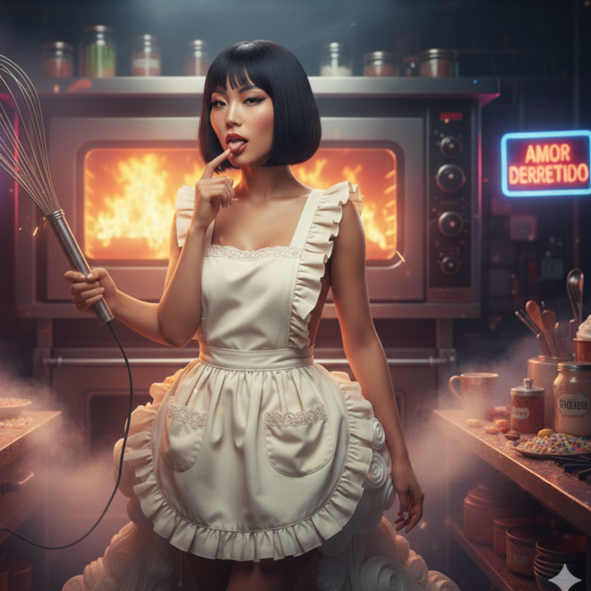 Glam metal argentine and hard rock song in E major at 108 bpm, Features powerful male lead vocals with seductive grit, layered backing chants, and distorted electric guitars with heavy palm-muted riffs, The rhythm is driven by a punchy kick-snare groove and a swinging 80s hi-hat pattern, Big, stadium-style choruses with multi-tracked harmonies amplify the anthemic feel, A funky bass line supports the groove while short guitar licks accentuate the sensual lyrics, The bridge introduces a breakdown with call-and-response vocals and playful sound effects resembling kitchen tools clashing in rhythm, The overall sound is glossy, rebellious, and tongue-in-cheek — a sugary mix of flirtation, power, and rock ’n’ roll attitude