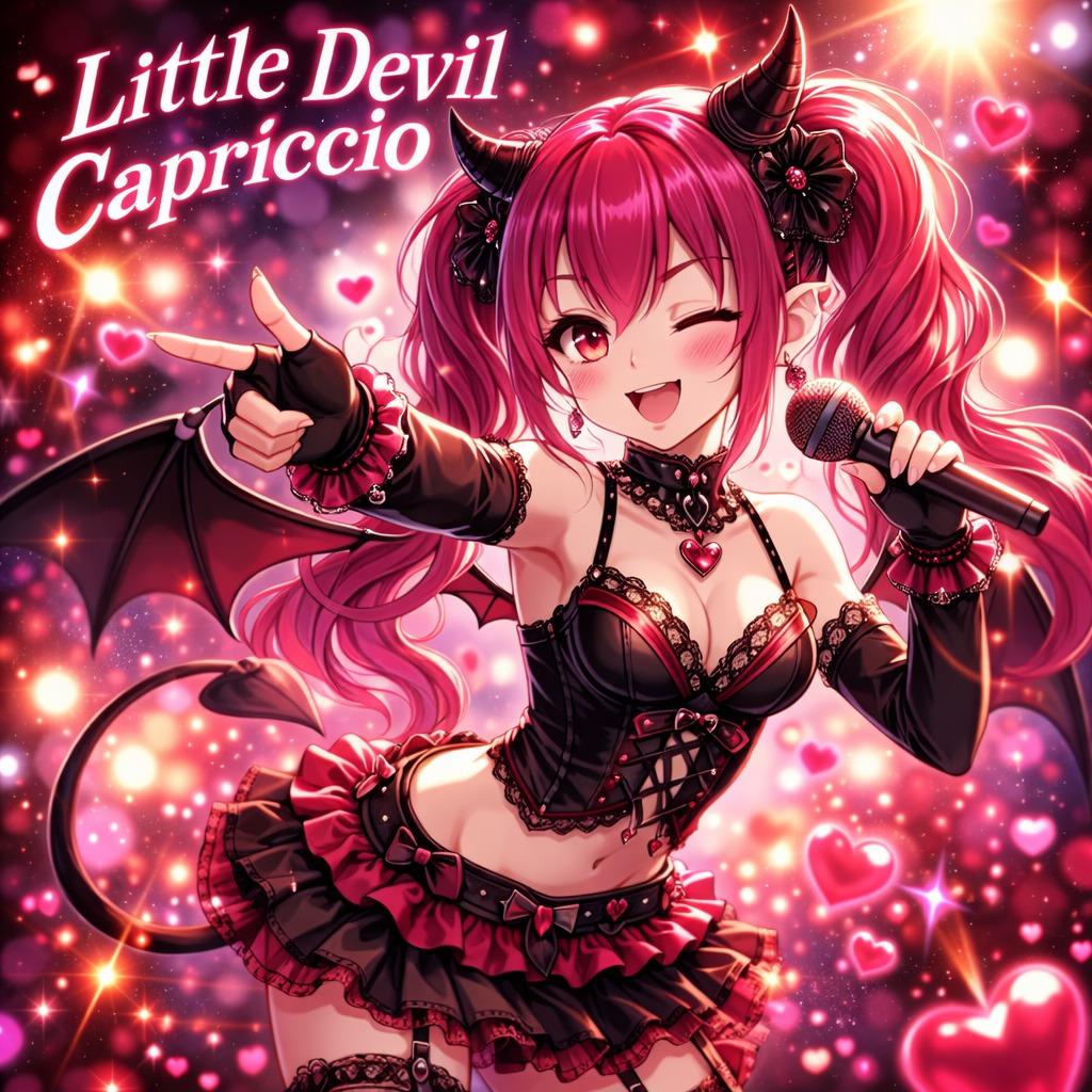 anime pop rock, little devil playful vibe, capriccio rhythm, upbeat 150bpm, cute but slightly dark tone, energetic female vocal, teasing and mischievous expression, catchy hook chorus, call and response sections, sparkling synth leads, punchy drums, funky bassline, gothic pop elements, dramatic build-up, emotional bridge, stadium live energy, sweet and seductive atmosphere, modern J-pop production, high energy, addictive melody, ‑harsh screaming, ‑growling, ‑raspy vocals, ‑choir, ‑gospel or layered chorus vocals, ‑lo-fi, ‑punk or garage-style vocals, ‑excessive tempo drops or breakdown, ‑rap, ‑rap-style, ‑spoken-word sections, ‑monotone singing, ‑spoken, ‑flow, ‑rhythmic talking