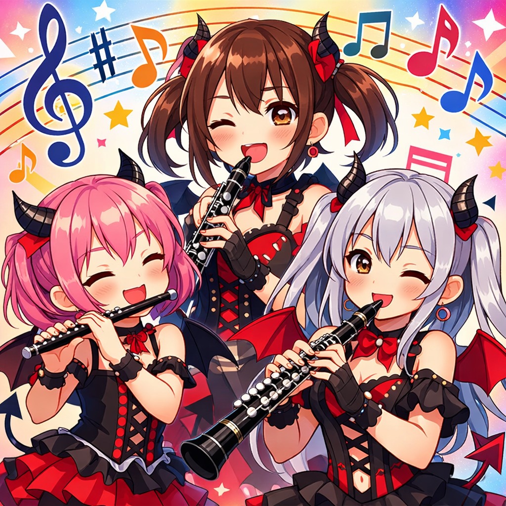 A high-energy ‘Little Devil Bounce Dance Symphony’ led by orchestral woodwinds and harp, Flute and piccolo sparkle with fast, bright melodies; clarinet delivers warm, bouncy groove lines; oboe adds cute yet mischievous expressive phrases, Harp glissandos and rhythmic plucks create magical shimmer and driving dance momentum, Lush strings support with dynamic crescendos, light brass hits add punch, timpani pulse like a heartbeat, Tempo around 128 BPM with a strong dance bounce, Female vocal mixed prominently in front of the instruments, loud and clear, punchy and present, with playful tone, light whispers, catchy hooks, layered airy chorus, Modern loud mix, wide stereo image, bright top end, tight low end, blending classical orchestration with pop-dance energy, Clear Japanese pronunciation, strictly follow provided lyrics, sing every line exactly as written, no skipping or improvisation, strong articulation, rhythmic and precise vocal delivery, lyrics-driven composition, ‑harsh screaming, ‑growling, ‑raspy vocals, ‑choir, ‑gospel or layered chorus vocals, ‑lo-fi, ‑punk or garage-style vocals, ‑excessive tempo drops or breakdown, ‑rap, ‑rap-style, ‑spoken-word sections, ‑monotone singing, ‑spoken, ‑flow, ‑rhythmic talking
