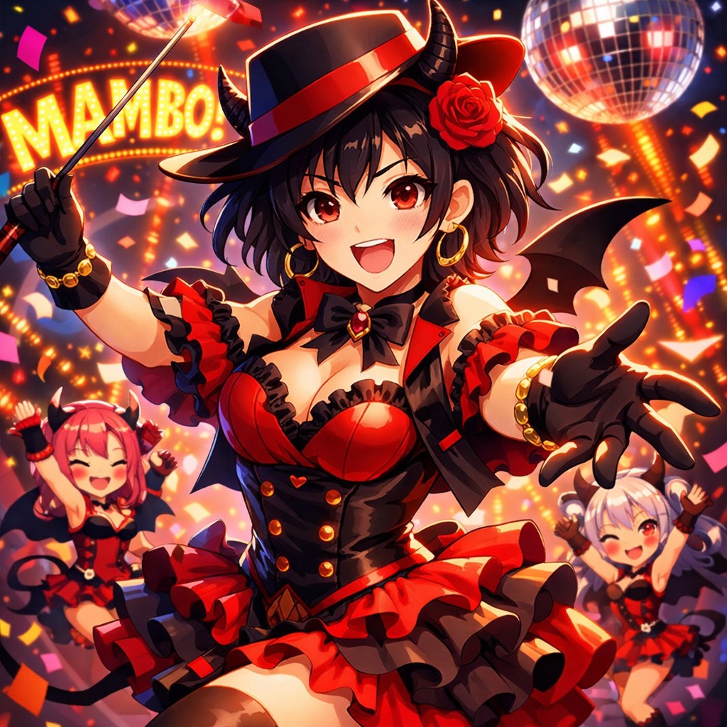 hyper happy mambo, latin dance pop, mischievous little devil vibe, bouncy groove, fast tempo, bright trumpets and brass, conga and bongo percussion, party dancefloor energy, catchy chant chorus, playful anime-style female vocal, festival dance vibe