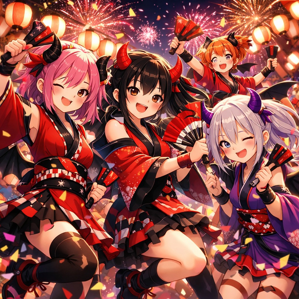 High-energy, bouncy Yosakoi festival dance, mischievous little devils, fast tempo 150 BPM, taiko drums, handclaps, electric synths, playful melodies, bright colorful vibes, vocal chants: "koakuma koakuma!", "devil devil little devil!", "odore odore!", vocals and choruses are clearly upfront and emphasized in the mix, NOT buried by instruments, strong vocal presence and clarity, joyful, contagious rhythm, party energy, festival madness, Mixing / Production: Wide stereo image, Clear instrument separation, no muddy mids, Crisp transients, controlled compression, High-resolution master emphasizing clarity and balance