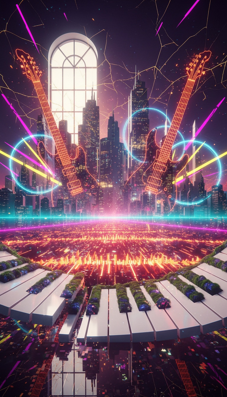 A raver trap fusion: the track opens with electronic piano chords and bassboosted ambient layers, merging into trap beats interwoven with fragmented breakbeats and classic guitar licks, Rave synth stabs punctuate melodic hooks; ethereal vocal harmonies float above, with glitch FX and DJ scratches driving a remastered, unpredictable edge