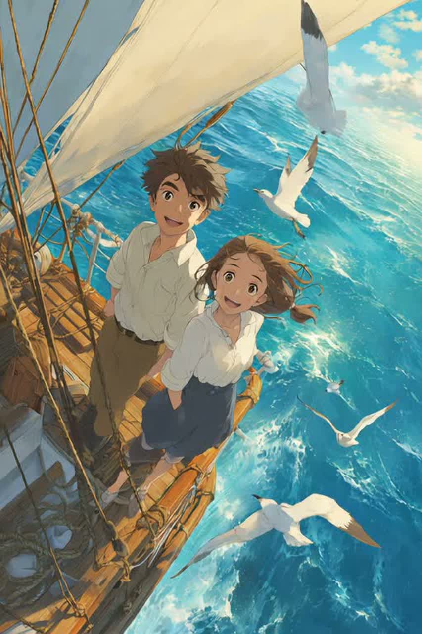 Tempo : 116 BPM, bright and rhythmic, Style : french children’s adventure song × folk-pop × sea-shanty, Cheerful male and children’s mixed choir, clear joyful vocals, light laughter between lines, Instruments : acoustic guitars, ukulele, accordion, tambourine, light drums, whistles, sea-wave and seagull sounds in intro/outro, Structure : intro – seagulls and wind, shouted “Ohé ! Hisse et ho !” ; verse – storytelling tone ; chorus – strong sing-along hook “Hisse et ho ! vent du sud ! On ira jusqu’au bout du monde !” ; bridge – soft night-at-sea moment with starry sounds ; final chorus – full choir and laughter fade-out, Mood : joyful, brave, adventurous, heart-warming, Sound palette : wood, wind, salt, sunlight, laughter, Keywords : sea voyage, friendship, courage, childhood dream, discovery