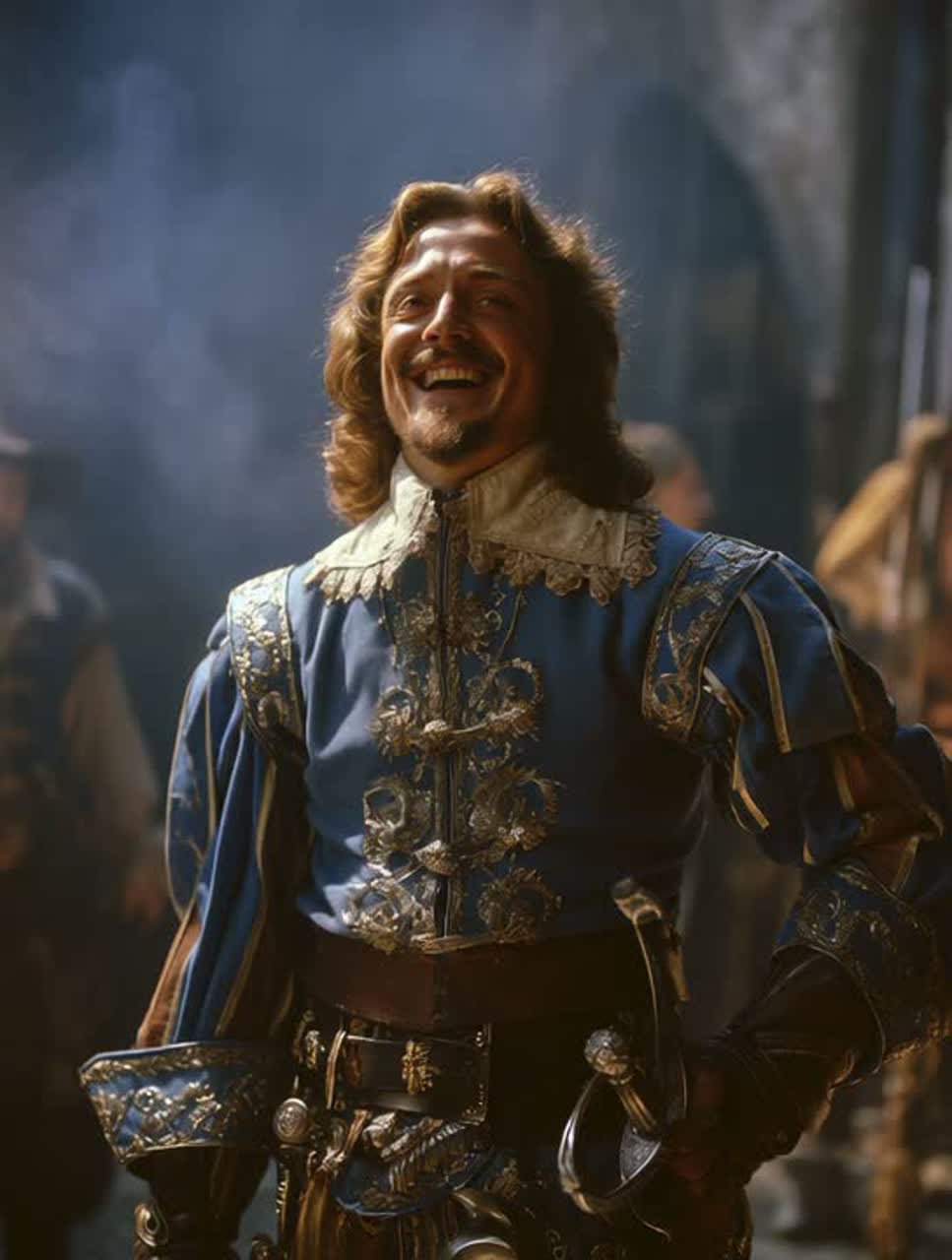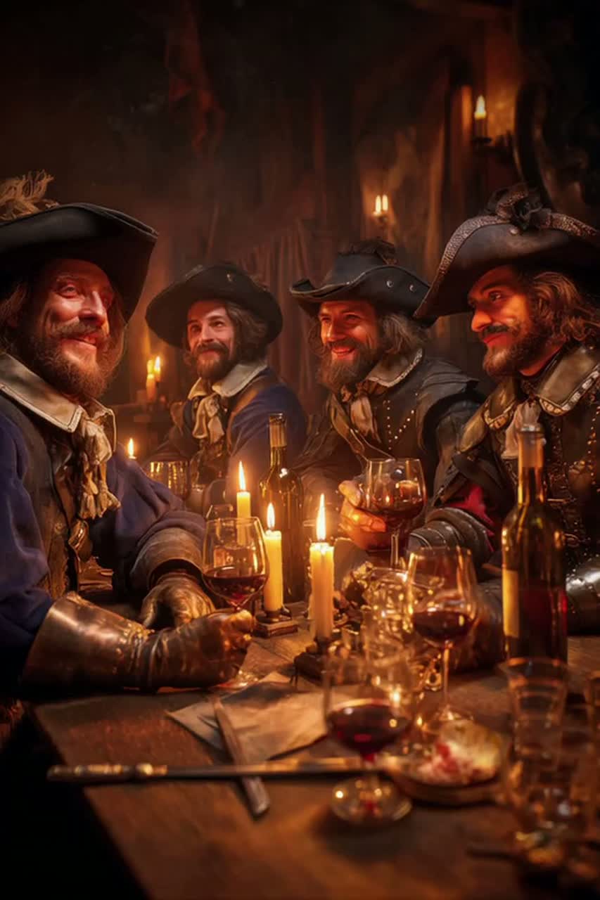 Tempo 108 BPM, strong and rhythmic, heroic and joyful, Style: modern french rock × folk anthem × cinematic adventure, Deep male French voice, powerful, warm, slightly rough, full of charisma, Instruments: electric and acoustic guitars, marching drums, bass, brass accents, male gang shouts in chorus for energy, Add a recurring hook on guitars and percussions around the line “Je suis Porthos ! Le rire et l’acier !” — it must sound anthemic and unforgettable, Structure: intro – spoken laugh and drum roll; verse – storytelling with rhythm; chorus – anthemic and singable; bridge – half-tempo with heroic tension; final chorus – explosive, full band, ending on laughter and echo, Mood: epic, joyful, brave, human, Keywords: french rock, adventure anthem, friendship, courage, wine and fire, musketeer spirit