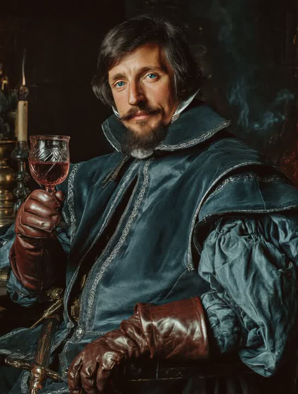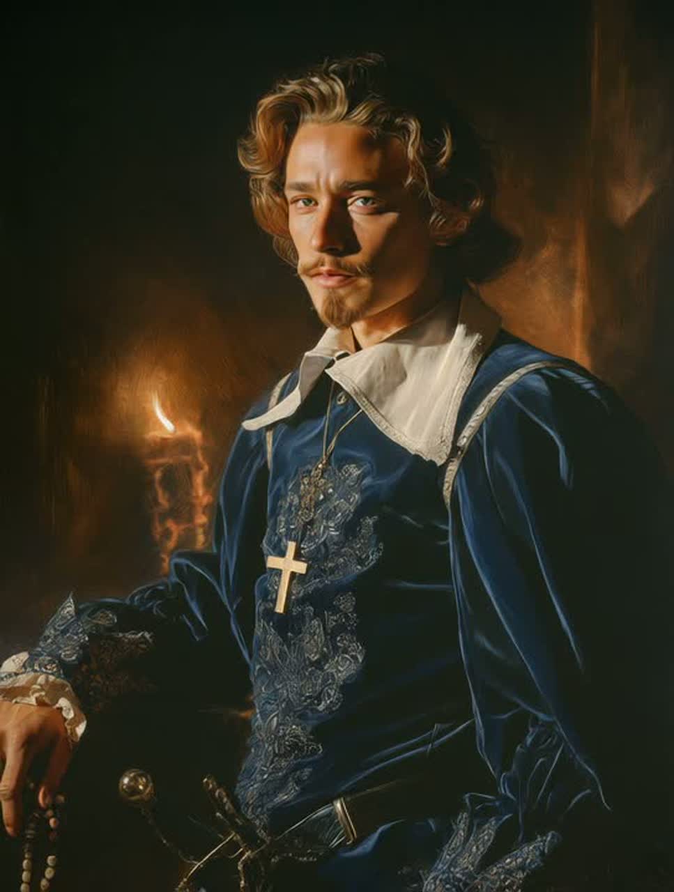 Structure: intro – whispered confession + slow guitar ; verse – storytelling with rising strings ; chorus – solemn and powerful ; bridge – minimal, heartbeat percussion ; final chorus – orchestral but restrained ; outro – fade on cello and glass clink, Mood: tragic, noble, introspective, melancholic, dignified, Sound palette: stone, wood, velvet, wine, Keywords: french dark ballad, fallen nobility, faith and guilt, poetic realism, musketeer soul, cinematic confession