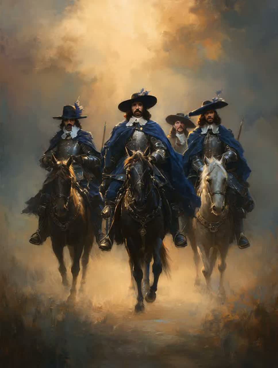 Tempo 86 BPM, steady, emotional, cinematic, Style: modern french chanson × poetic folk rock, Four deep male French voices — expressive and warm — singing and speaking like old friends sharing memories, Instruments: acoustic guitar, cello, bass, soft drums, light brass, ambient background of a quiet room, Structure: intro – spoken line “Nous n’étions pas des saints…” ; verses – rhythmic storytelling ; chorus – all voices together on “Nous sommes les quatre, perdus, debout” ; bridge – slower and reflective ; final chorus – united voices fading gently, Mood: nostalgic, noble, human, fraternal, Sound palette: wood, velvet, smoke, dusk light, Keywords: friendship, courage, unity, poetic realism, brotherhood, musketeer spirit