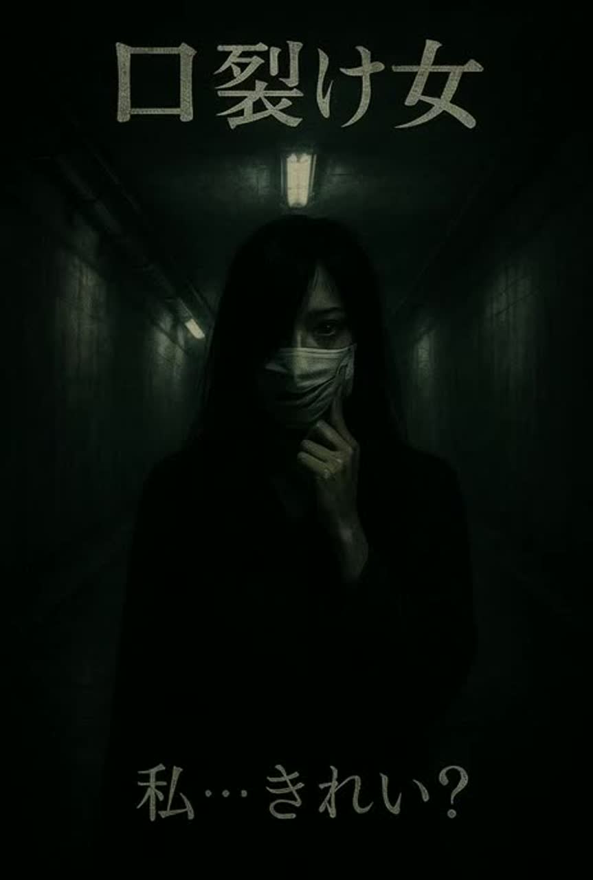 Weirdcore / Avant-garde horror at 56 BPM, irregular pacing, Whispered female Japanese vocals layered with distant echoes, distorted glitch effects, and metallic slicing sounds, Call-and-response style with repeated question 「私, きれい?」, shifting from soft and seductive to distorted and aggressive, Ambient city-night noise mixed with wind and faint footsteps, Minimal percussion, heartbeat-like bass pulses, and sudden sharp string stabs, Inspired by Japanese urban legends and psychological horror aesthetics, Dark, tense, and immersive atmosphere