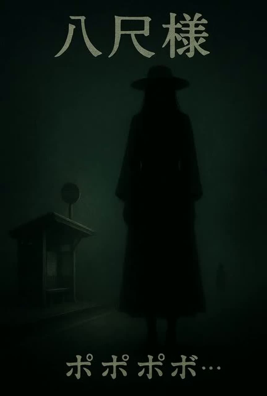 Weirdcore / Avant-garde horror at 48 BPM, slow irregular pacing, ambient horror sound design, glitch textures and detuned synth pads, whispered female Japanese vocals layered with distant distorted echoes, metallic "ポポポポ…" laughter in the chorus, haunting sub-bass and heartbeat-like pulse, subtle chimes and wind ambience, minimal percussion, unsettling cinematic atmosphere, inspired by psychological surrealism and Japanese urban legends, storytelling about 八尺様 (Hachishaku-sama), ominous and immersive, dark cinematic mix