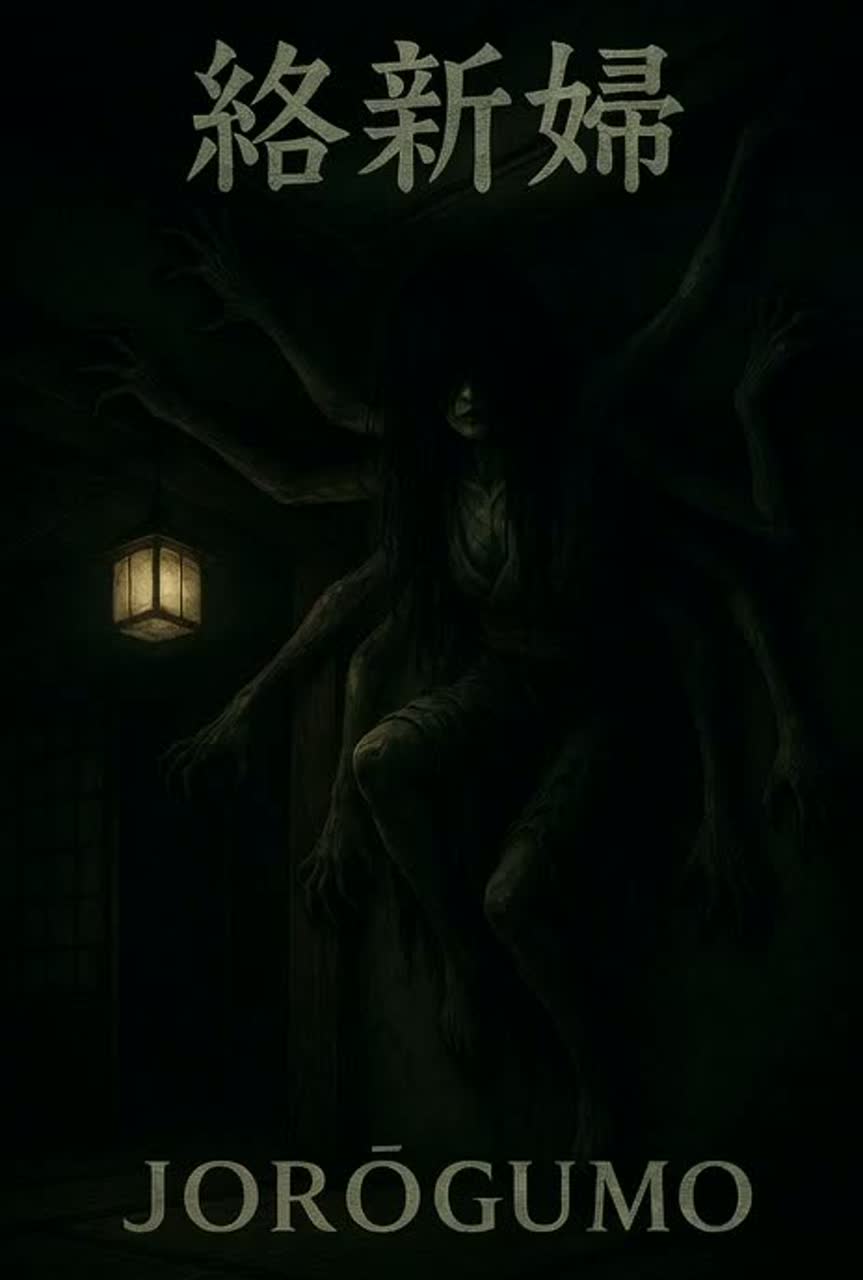 Dark Japanese folklore horror with weirdcore and ritual ambience, Traditional instruments – shamisen, taiko drums, shakuhachi – blended with eerie rattles and maracas like spider legs skittering, Female lead vocals, ghostly and seductive, whispered and half-sung, telling the tale of the Jorōgumo, the spider woman luring travelers into her web, Verses are tense and minimal, built on shakuhachi breaths, shamisen plucks, and heartbeat-like taiko pulses, evoking the feeling of being hunted in the dark, Choruses swell with ritual chants, layered ghostly vocals, dissonant shamisen chords, and deep sub-bass drones, creating the sound of a cursed ceremony, The bridge breaks into surreal chaos with fractured rhythms, metallic echoes, reversed textures, and sudden silences, mimicking the crawling terror of many legs, Atmosphere is folkloric, ritualistic, spine-chilling, with a cursed lullaby quality, Wide stereo, echoing reverb, immersive and haunting