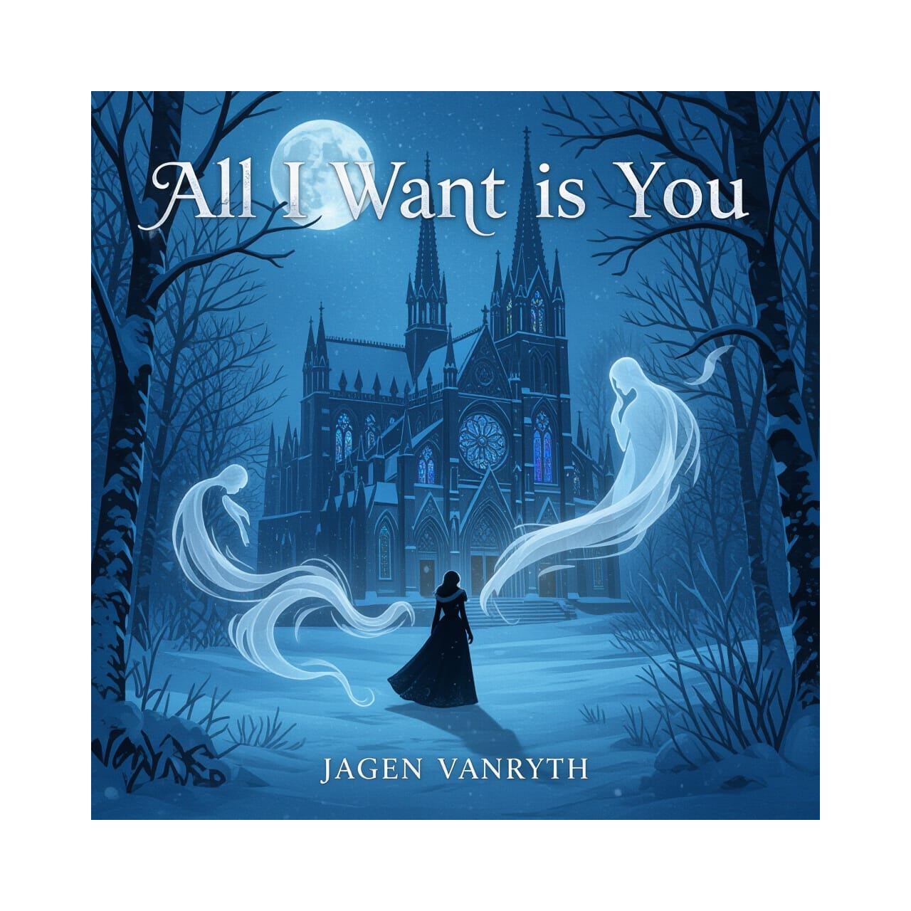 Darkwave Christmas ballad with cinematic atmosphere — deep male vocals layered with haunting female harmonies, Tempo around 85 BPM, Ethereal synth pads, reverb-drenched bells, ghostly choirs, and echoing percussion, The tone is melancholic, romantic, and icy, blending gothic pop and holiday ambience, The mood should feel nostalgic yet supernatural, with emotional vocal delivery and glacial sound textures that evoke a frozen cathedral at midnight