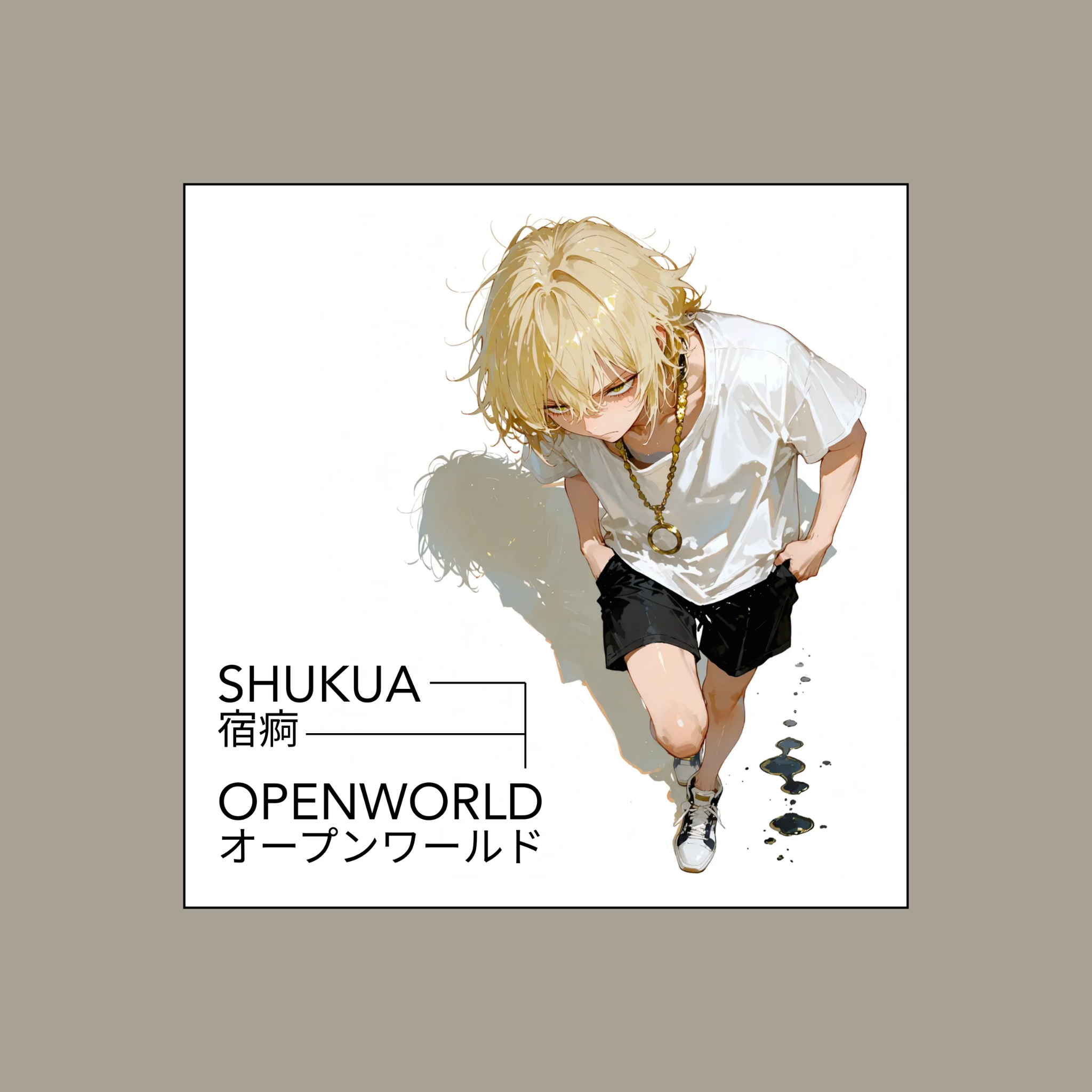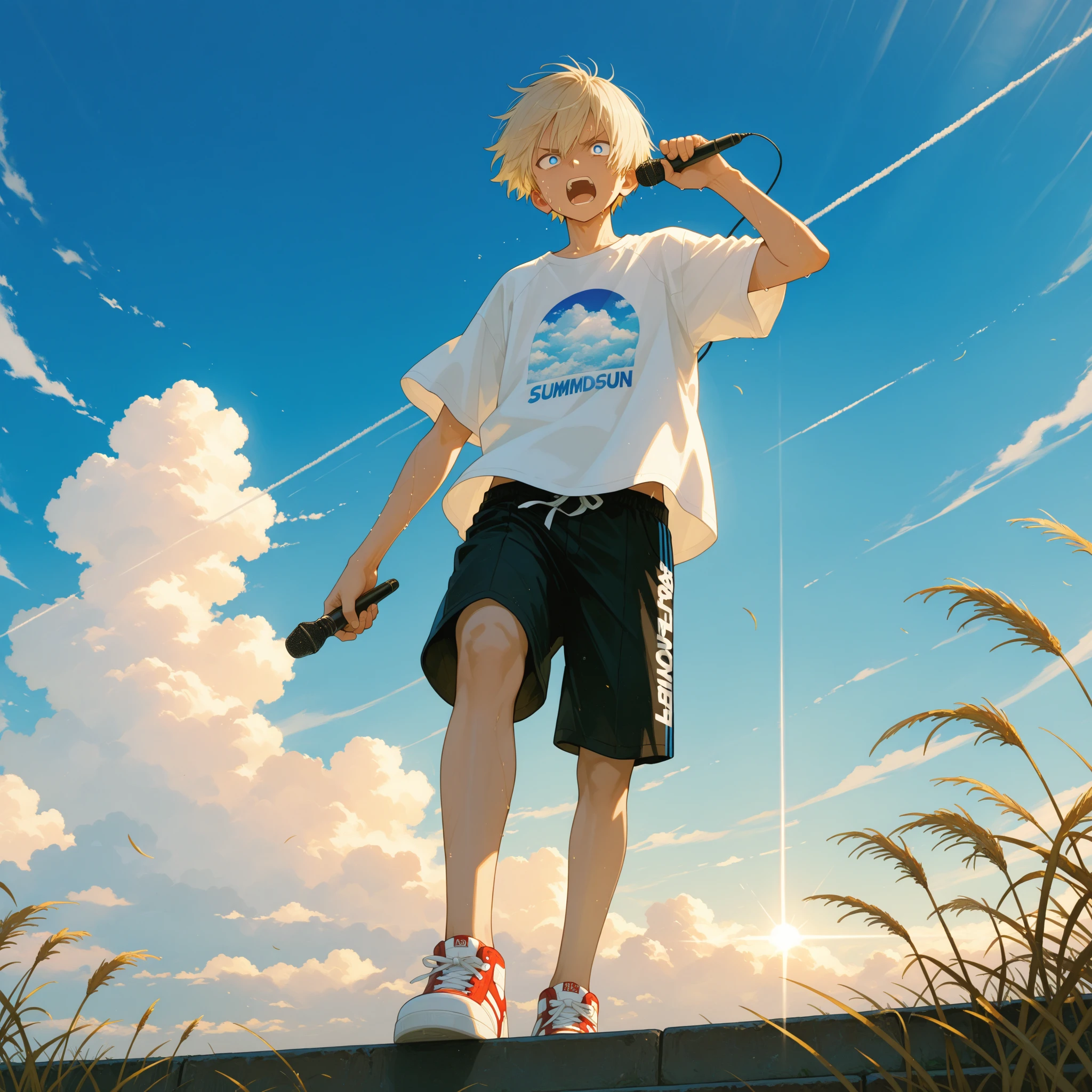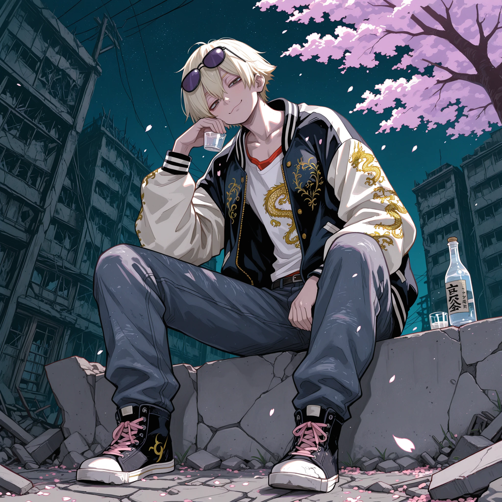 [Genre: Alternative Rock × Post-Emo × Anthemic J-Rock, Crossover], [Temporal Depth: Coming-of-Age Catharsis × Real-Time Rebellion × Melodic Uprising], [Core Instruments: Distorted Guitar (mid-gain crunch, open chords), Bass Guitar (driven, syncopated), Acoustic Drums (explosive snare, half-time breakdowns), Piano (light accents), Ambient Synths (subtle layer)], [Rhythm Section: Mid-to-uptempo 4/4 with syncopated crash-heavy chorus, double snare fills on transitions], [Texture: Raw vocal tone, dynamic range intact, lo-fi grit on verses, wide stereo guitars on chorus], [Spatial Design: Moderate hall reverb on chorus, dry upfront vocals in verse, wide stereo delay on outro], [Vocals: Male lead (emotive shout-singing), layered group chorus (shouting gang vocals on final chorus)], [Mastering: High loudness ceiling, tape saturation compression, EQ lift at 3kHz and 10kHz for vocal clarity, warm analog bass roll-off]