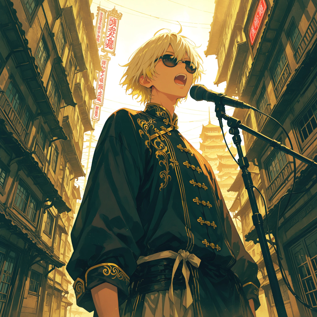 [Genre: Psychedelic Rock × Experimental Electronic × J-core, Crossover], [Temporal Depth: Temporal Dissonance × Symbol Drift × Sonic Enlightenment], [Core Instruments: Fuzz Guitar (detuned riffs, reverse feedback), Electric Biwa Sim (granular), Tape Bells (hi-pass), Sub Synths (scooped chants), Slap Bass (dense syncopated), Sample Pack ("Screaming Sutras")], [Rhythm Section: Irrational Meters (13/8→5/4→silence), BPM170, J-core Kick (punchy), Snare (crisp), Ritual Percussion (gamelan×body slaps×field)], [Texture: VHS Drone (mono high-cut), Bitcrushed Chants (banded), MIDI Harp (mid/side), Panned Laughter, Insect Noise (gated)], [Spatial: Liminal Reverb (freq gate), Mic Bleed, Drive Feedback (parallel), Stereo Preserved], [Vocals: Dual Male (scream×narration dry/wet), Machine Chorus (glitch mono wide), Language: Phonemes×Code Fragments], [FX: Reverse Trails (banded), Noise Filter (soft shelf), Time-Stretch, Prayer Artifacts (tempo-locked)], [Mastering: Stereo Collapse (sidechain), Soft Hiss, Auto-EQ (mid boost)], ‑Overcompression, ‑Brickwall Limiting, ‑Excessive Low-End Rumble, ‑Boxy Low-Mids, ‑Sub-Boom, ‑Harsh Highs (8kHz+ Peaks), ‑Digital Clipping, ‑Muddy Stereo Image, ‑Phase Cancellation, ‑Flat Dynamics, ‑Hollow Bass, ‑Weak Sub Presence, ‑Loose Kick, ‑Weak Snare Attack, ‑Overly Repetitive Drum Loops, ‑Metallic Ringing, ‑Resonance Build-Up, ‑Excessive White Noise, ‑Low-Resolution Reverb Tails, ‑Washed-Out Vocals, ‑Overly Wet Vocals, ‑Sibilance Harshness, ‑Unbalanced Panning, ‑Overly Wide Bass, ‑Narrow Mono Collapse, ‑Flutter Echo, ‑Over-Processed Delay, ‑Uncontrolled Feedback Whine, ‑Artificial Overbright Master, ‑Unwanted Distortion, ‑Inconsistent Volume Swells, ‑Muffled Transients, ‑Chaotic Frequency Masking, ‑Gated Reverb Chatter, ‑Unintentional Sidechain Pumping, ‑Extreme Noise Floor Rise, ‑Over-EQ Smiley Curve, ‑Plastic-Like Synth Timbre, ‑Poorly Tuned Percussion, ‑Flanging Artifacts, ‑Excessive Bitcrush Smear, ‑Random Pitch Drift on Kick/Bass, ‑Thin Midrange, ‑Over-Sterilized Master, ‑Loss of Low-End Impact