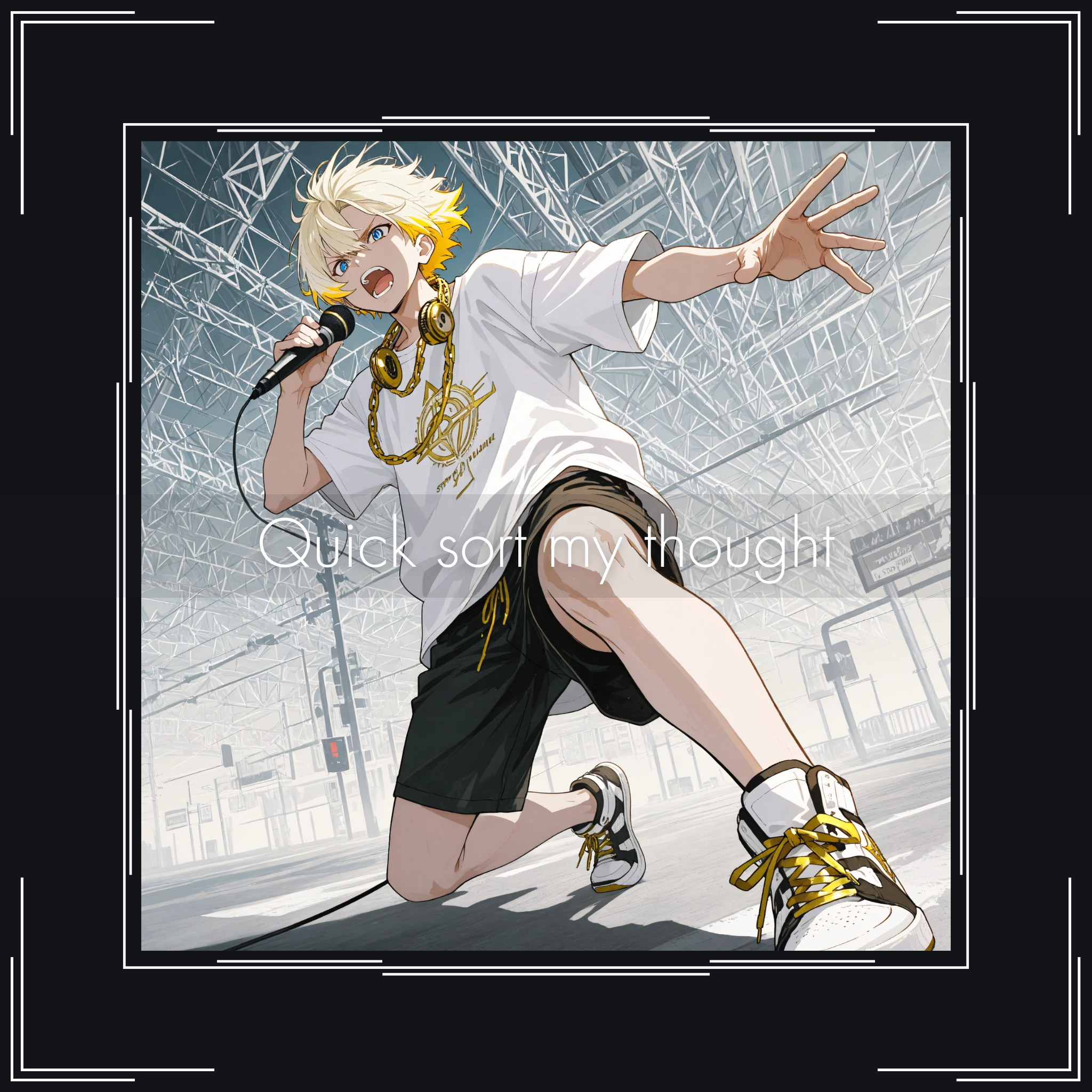 [Genre: J-Rock × Alternative Pop × Glitchcore × Cinematic Rock, Crossover], [Temporal Depth: Iterative Tension Build × Cinematic Persistence × Youthful Defiance], [Core Instruments: Electric Guitar (tight strumming, octave jumps), Bass Guitar (tense groove), Acoustic Drums (snappy snare, gated reverb), Orchestral Strings (heroic swells), Synth Leads (8-bit arpeggios, game-like motifs)], [Rhythm Section: Syncopated mid-tempo rock drive, double-time bursts in chorus and bridge, heartbeat-style kick in bridge], [Texture: Crisp guitar tone with light saturation, layered ambient strings, glitchy synth sparkle, tension pads, subtle tape hiss], [Spatial Design: Deep stereo layering × Intimate reverb in verses × Expanding cinematic space in chorus × Controlled transient punch], [Vocals: High-pitched male (emotional, light nasal), Japanese lyrics, whisper-to-shout phrasing, falsetto in bridge, group shout in chorus], [FX: Reverse cymbal swells, glitch stutters, soft tape delay on vocal ends, analog overdrive in climax], ‑[Negative: Muffled upper mids, ‑muddy low end, ‑flat verse dynamics, ‑weak final chorus saturation]