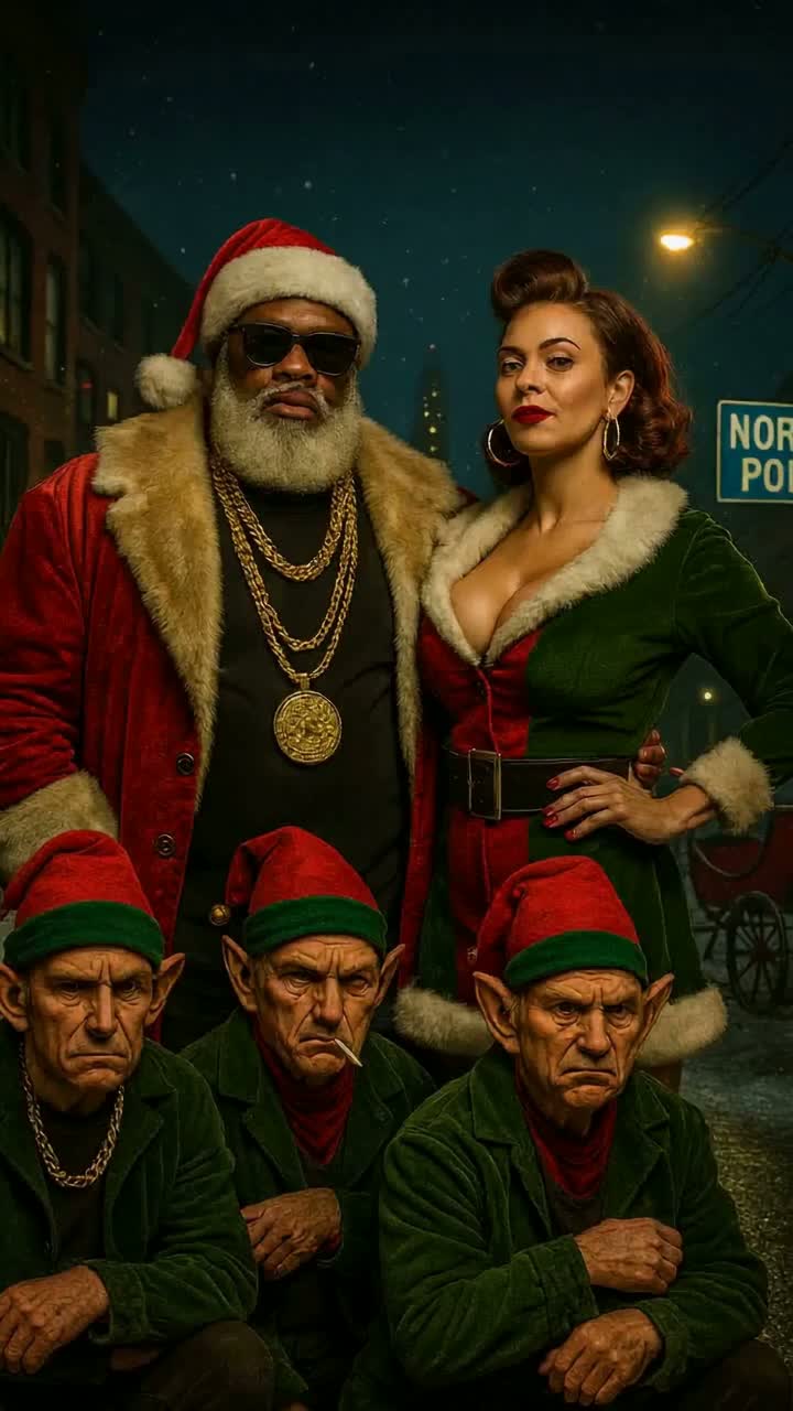 A gritty underground rap beat kicks off with vinyl crackle and booming kick, layered over jazzy sampled chops, Crisp sleigh bells and wintry pads create a snowy ambience, Punchy oldschool drums and bass drive the verses, while festive synths and vocal chants drop in for a New Year's party chorus, christmas song, gangster rap, underground rap, bells, snowy ambiant, new years party, oldschool rap