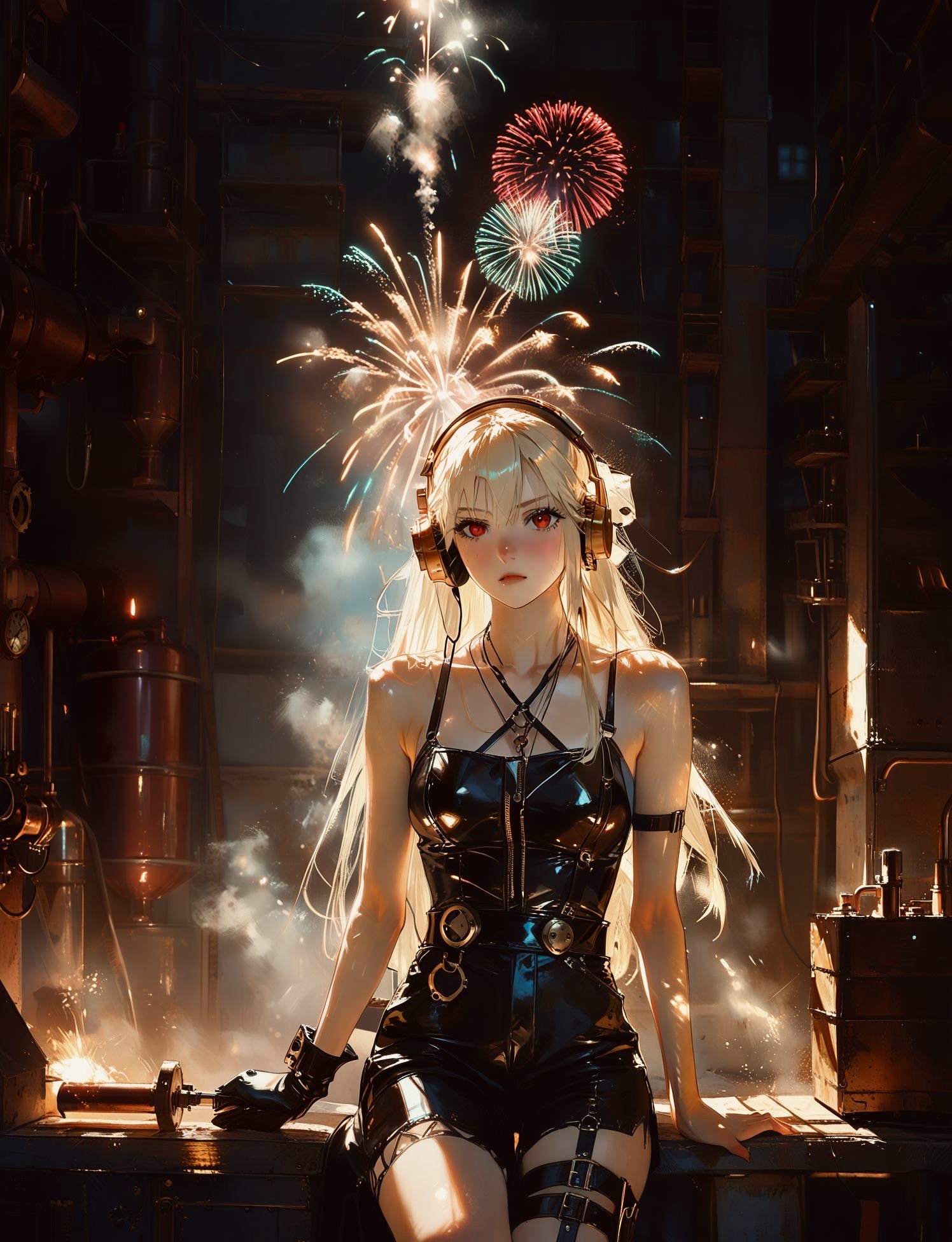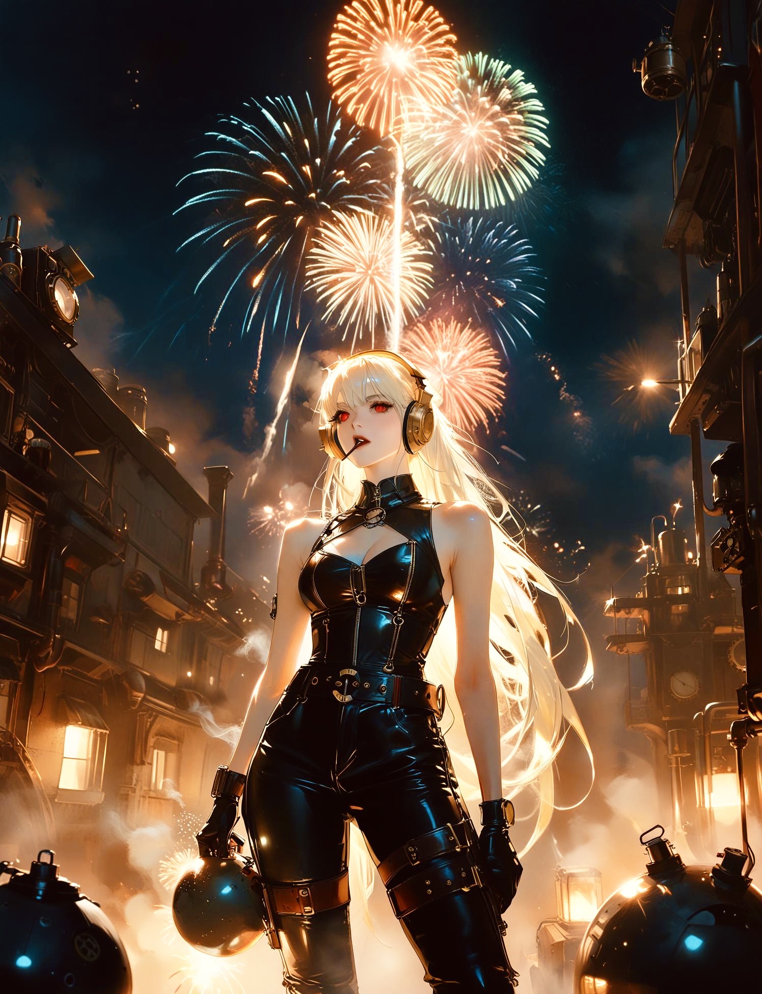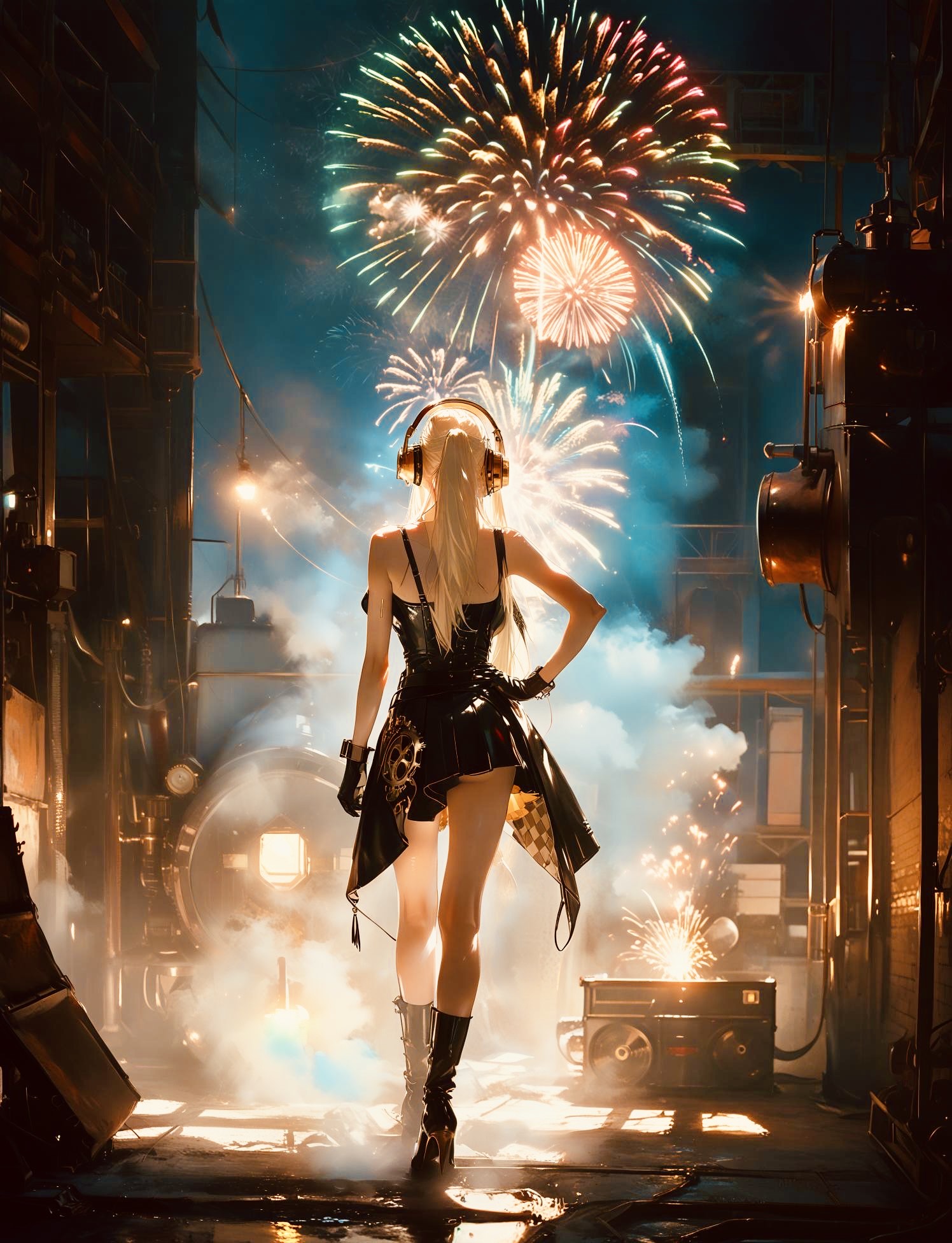 [Genre: Epic Lo-fi jazz beats × Mechanical Fusion × Glitchy factory soundscape with spatial audio depth, cinematic steampunk ambiance, firework textures]
