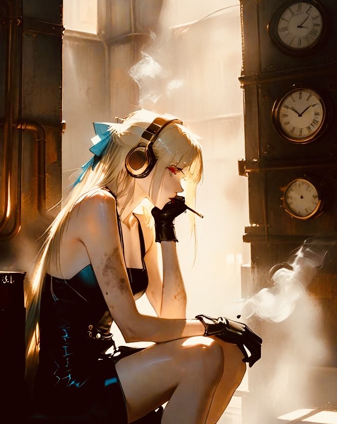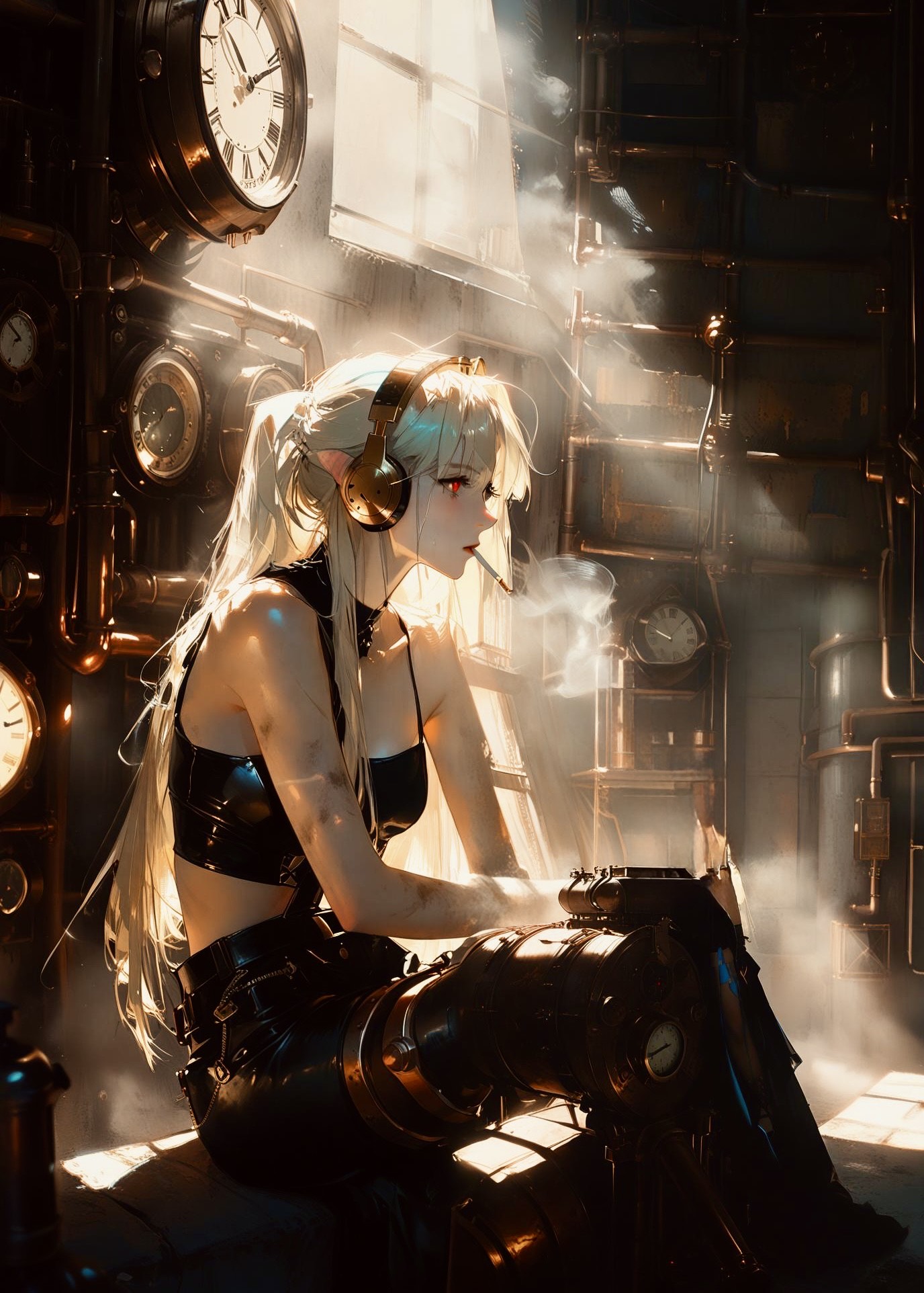 [RabbitCore style: Steampunk fusion × Factory Phonk, × Big beats, Jazz, and MechanicalPoetry, Factory Ambience, Special FX], Deep Smoky and Husky female vocals, lo-fi jazz flow, rusty gear ambiance, analog hiss, Steampunk glitch textures, clock ticking SFX, mechanical breathing, reverb-heavy whispers, typewriter rhythms, ambient noise of a rusted city, industrial brass & dusty vinyl textures, Gear SFX, Steam Blowing SFX]