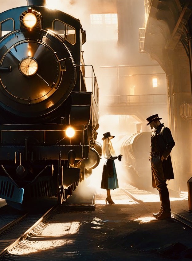 [Sound Design: Spatially placed hammering, metal clinks, valve hiss, steam bursts, chain drag, gear rotation, firework fizz, tape flutter, vinyl crackle, whispered FX]