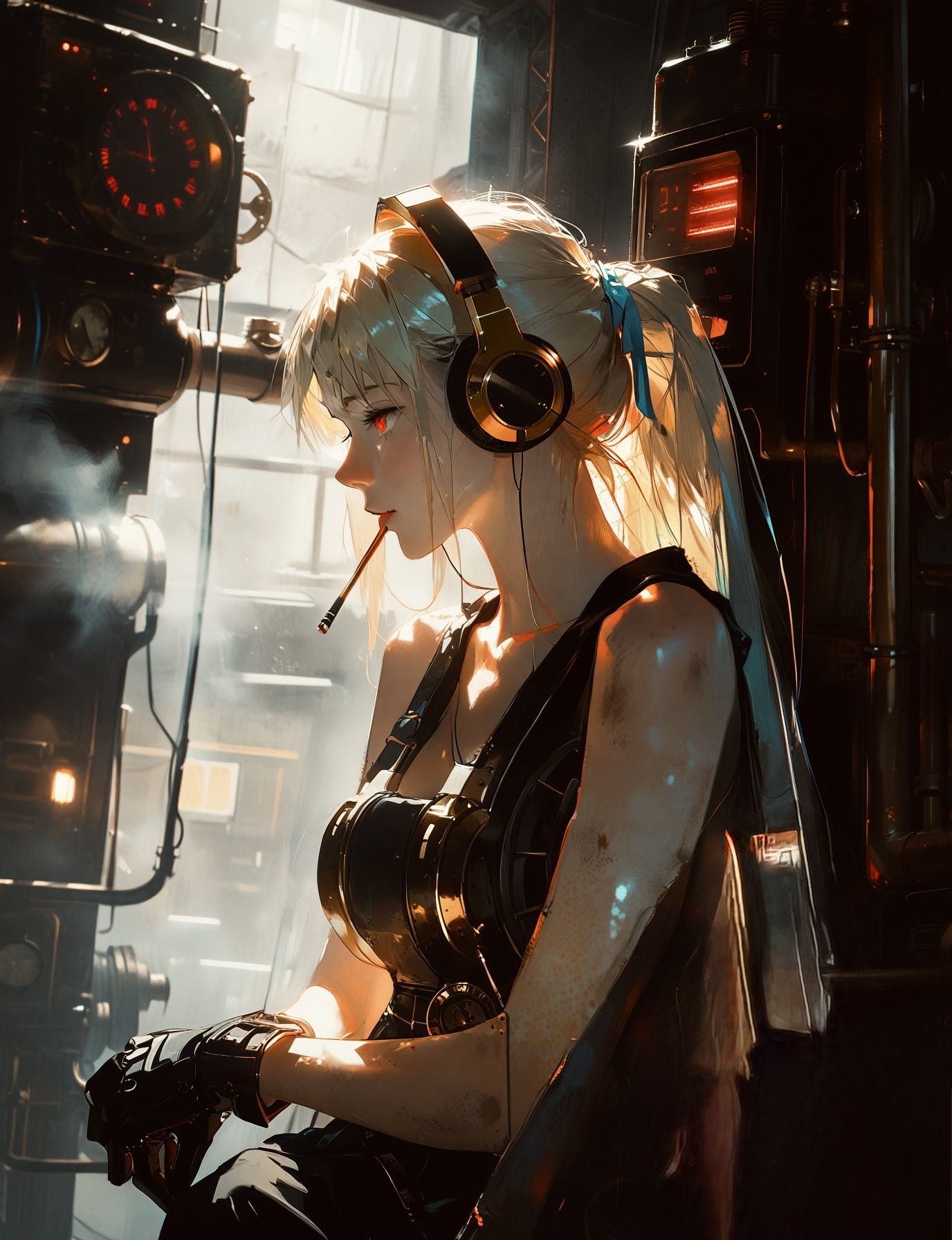[Mood: Mechanical yet elegant, spark-driven, immersive, glitched textures, melancholic yet energetic; workshop hustle and precision]