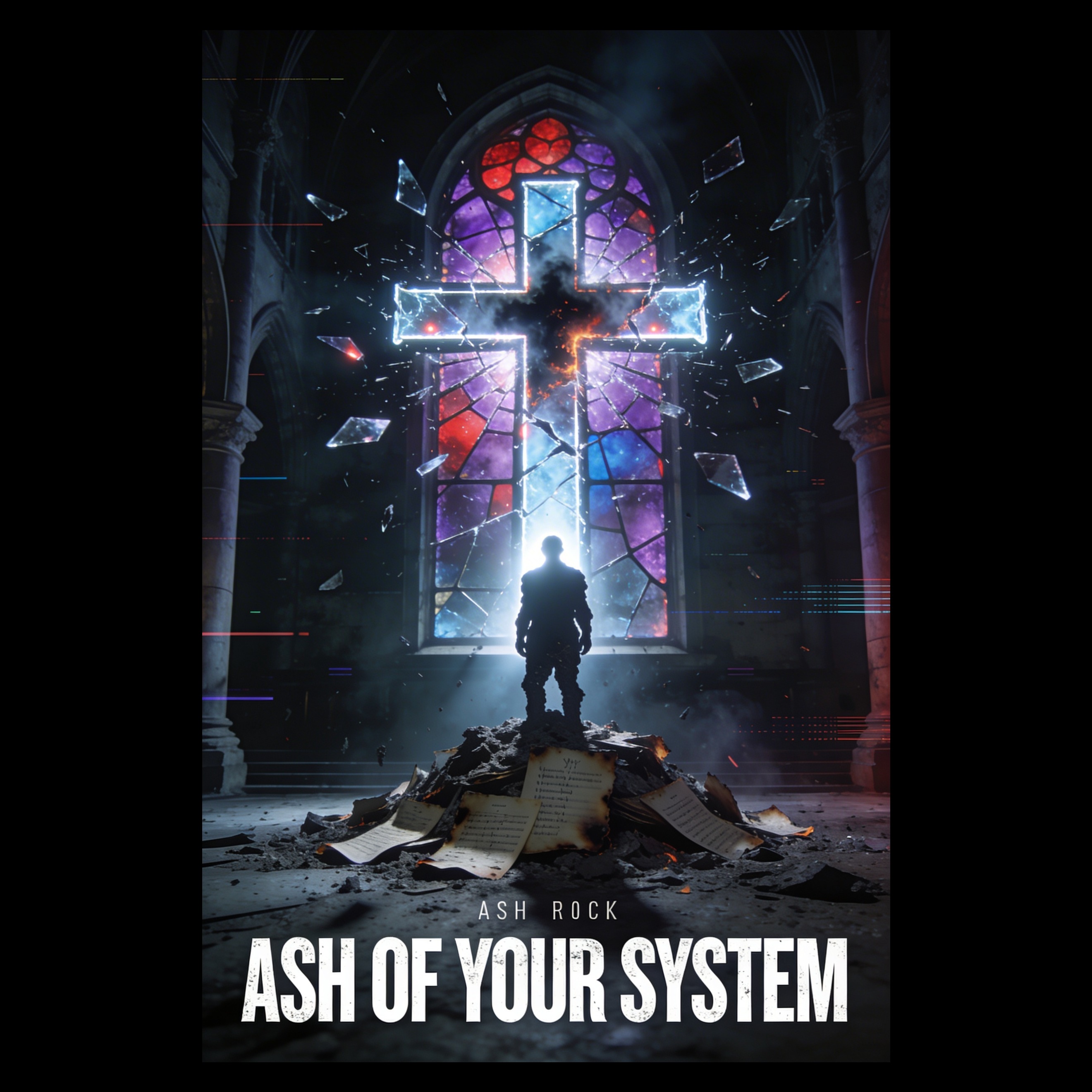 Cinematic anti‑religion rap‑rock revenge anthem titled “Ash of Your System, ” 85 BPM, D minor, Dark, epic production with sparse, tense piano and low strings in the intro and verses, like an empty church at night, Verses: rapid, aggressive multisyllabic rap with bitter, confessional lines about religious trauma, over minimal drums, bass swells, glitchy ambience, and distant choir pads, Choruses: massive trap drums, distorted 808s, heavy guitars, and a dark choir that feels like a corrupted church chorus turned war chant; vocals more shouted and hate‑filled with screamed ad‑libs on key blasphemous lines, Half‑time cinematic bridge breakdown with big spaced‑out drums and reverb‑drenched strings, then a fully stacked final chorus for a cathartic, vengeful climax, Vocal mix: very aggressive, slightly distorted, with breaths and imperfections left in, blended into a loud, prominent instrumental so it feels raw, angry, and human
