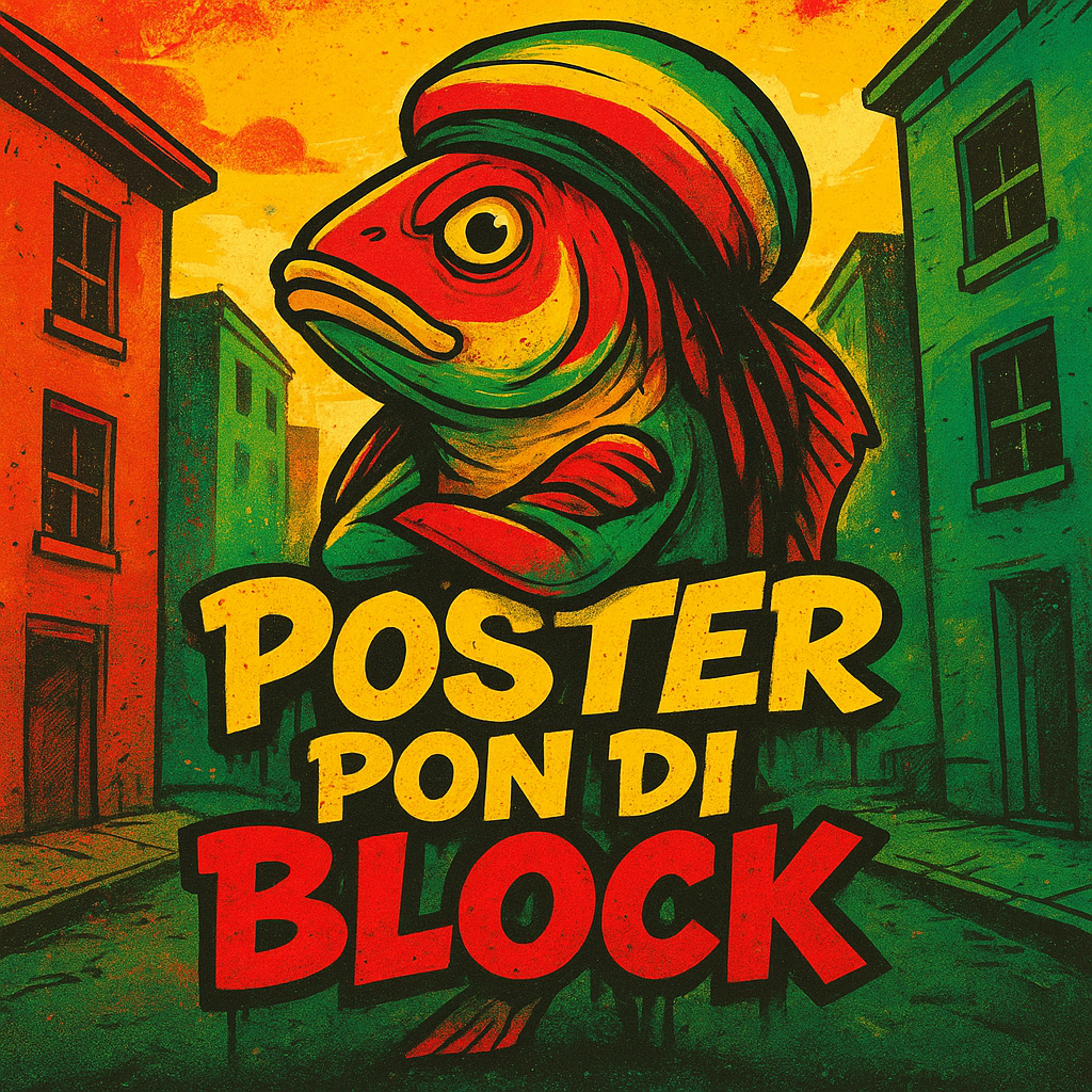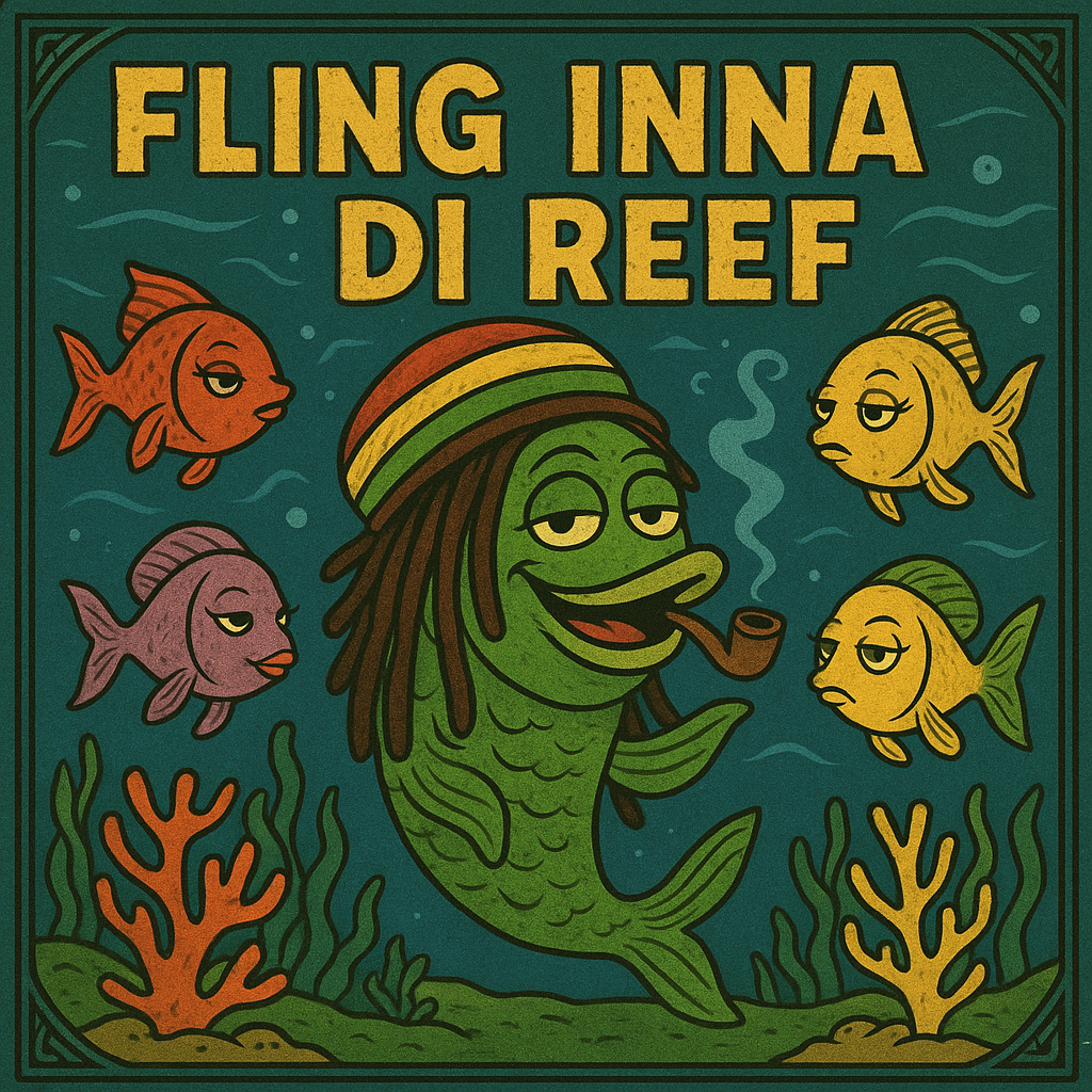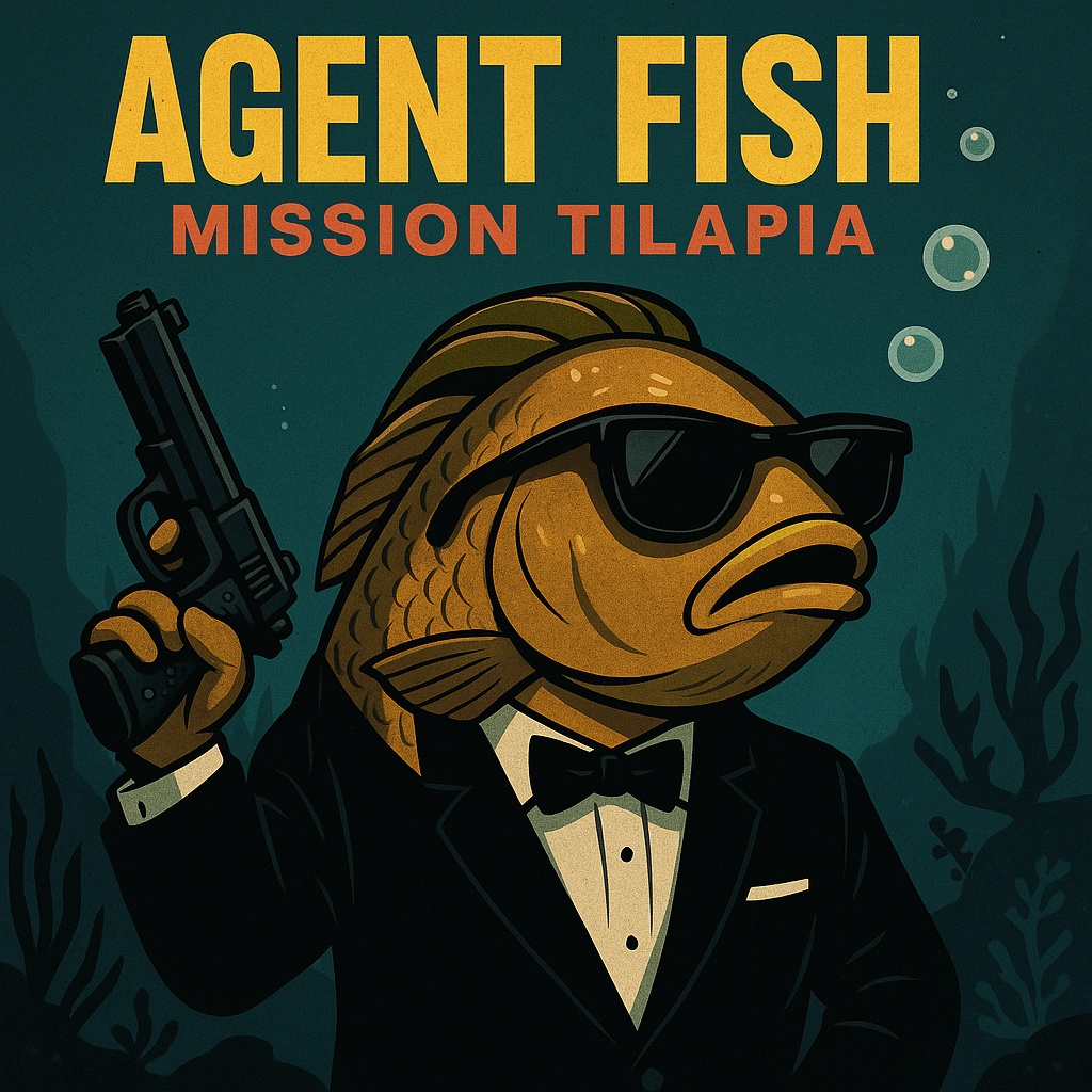 A humorous Jamaican patois spy-reggae song about a clueless secret agent fish, Dark satire meets slapstick comedy, The music is a blend of reggae and cinematic spy soundtrack, with ska guitar, reggae drums, sneaky horns, and underwater sound effects, The vibe is like Johnny English meets 007 underwater